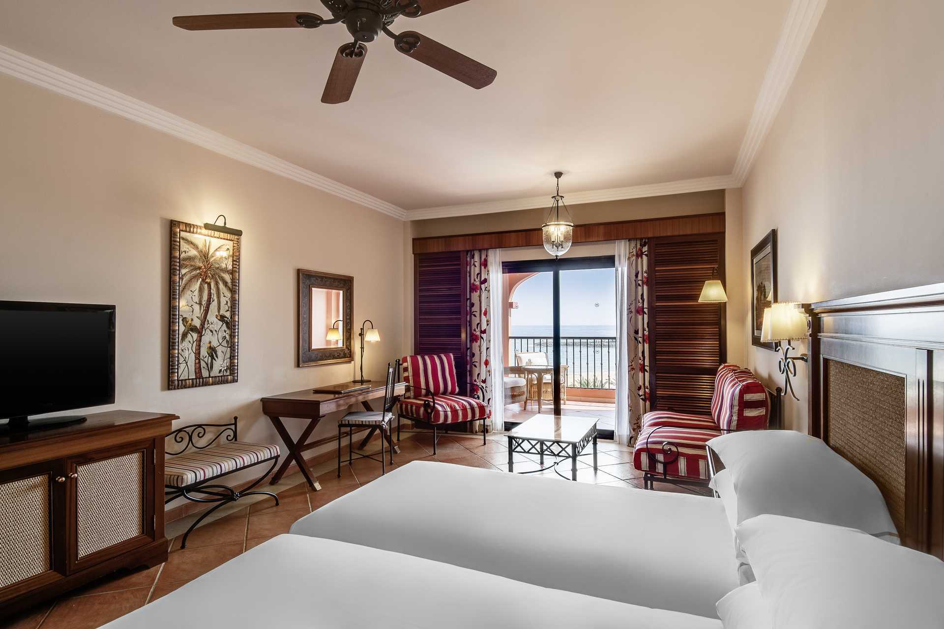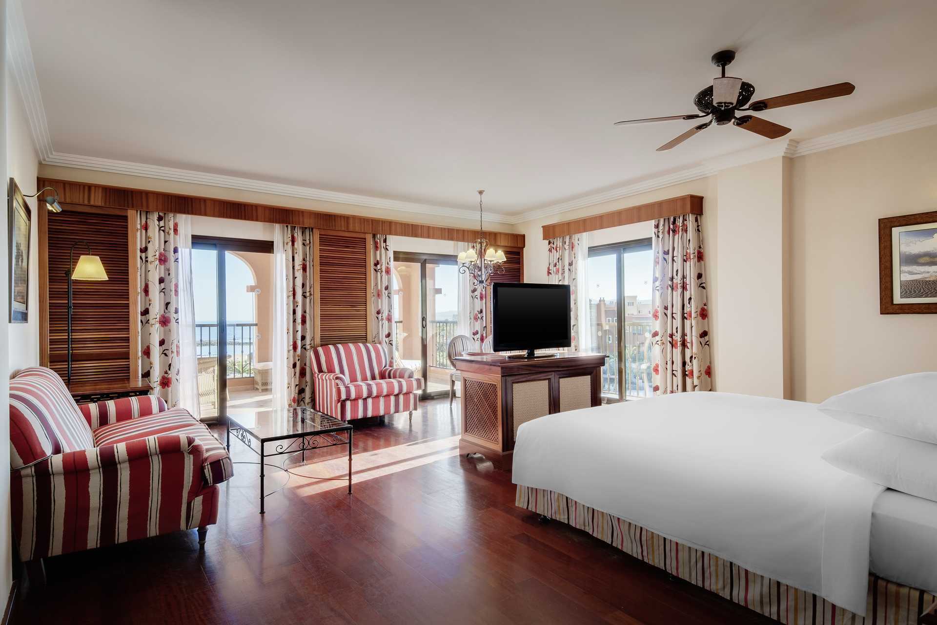 Juniorsuite deluxe med balkong og begrenset havutsikt. Kombinert soverom med stue med bord, sofagruppe og to enkeltsenger eller en dobbeltseng. Mulig med ekstrasenger i feltsenger. Wifi, luftkondisjonering og safe inkludert. Minibar. Vannkoker samt kaffe og te. TV. Strykejern og strykebrett. Badekåper og tøfler. Hårføner. Bad i marmor med to servanter, jacuzzi og separat dusj og wc. Rengjøring 7 ggr/uke. Barn under 2 år regnes inn i maksantallet i rommet.