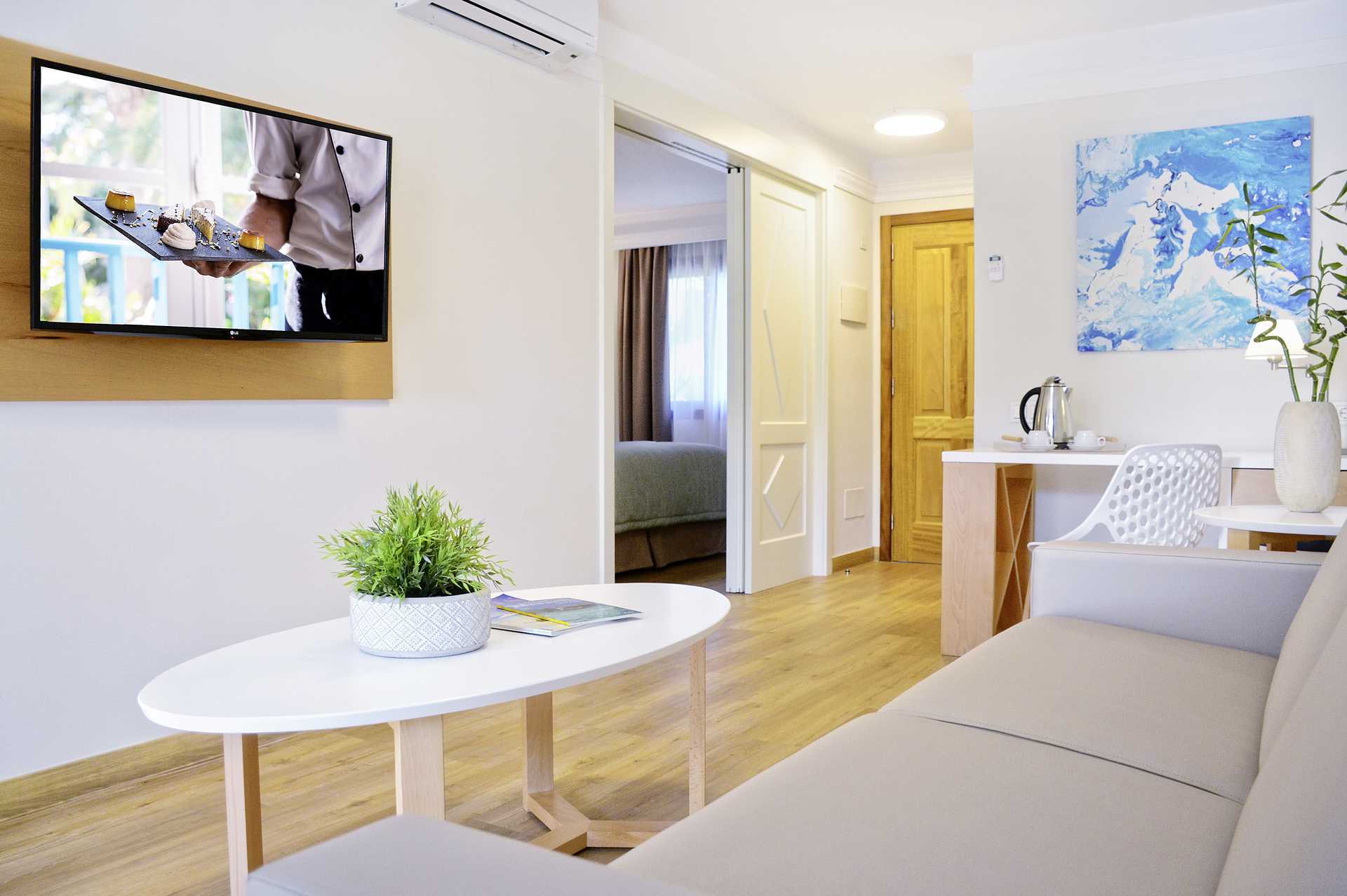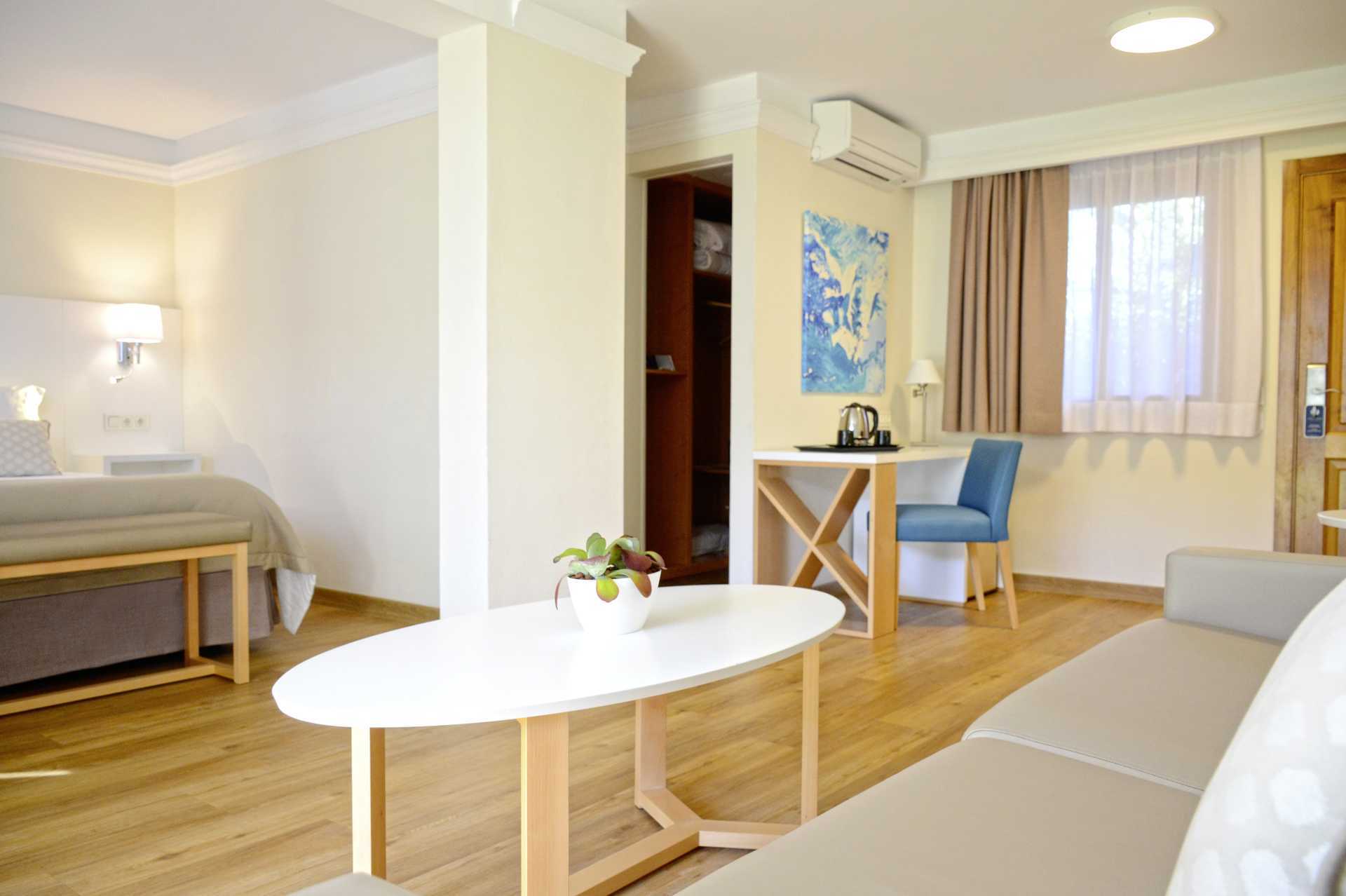 Juniorsuite med balkong eller terrasse, noen med havutsikt. To enkeltsenger eller en dobbeltseng. Mulig med en ekstraseng i sovesofa. Wifi, luftkondisjonering og safe inkludert. Kjøleskap. Vannkoker samt kaffe og te. TV. USB-port for lading av elektronisk utstyr. Hårføner. Badekar eller dusj samt wc. Rengjøring 7 ggr/uke.