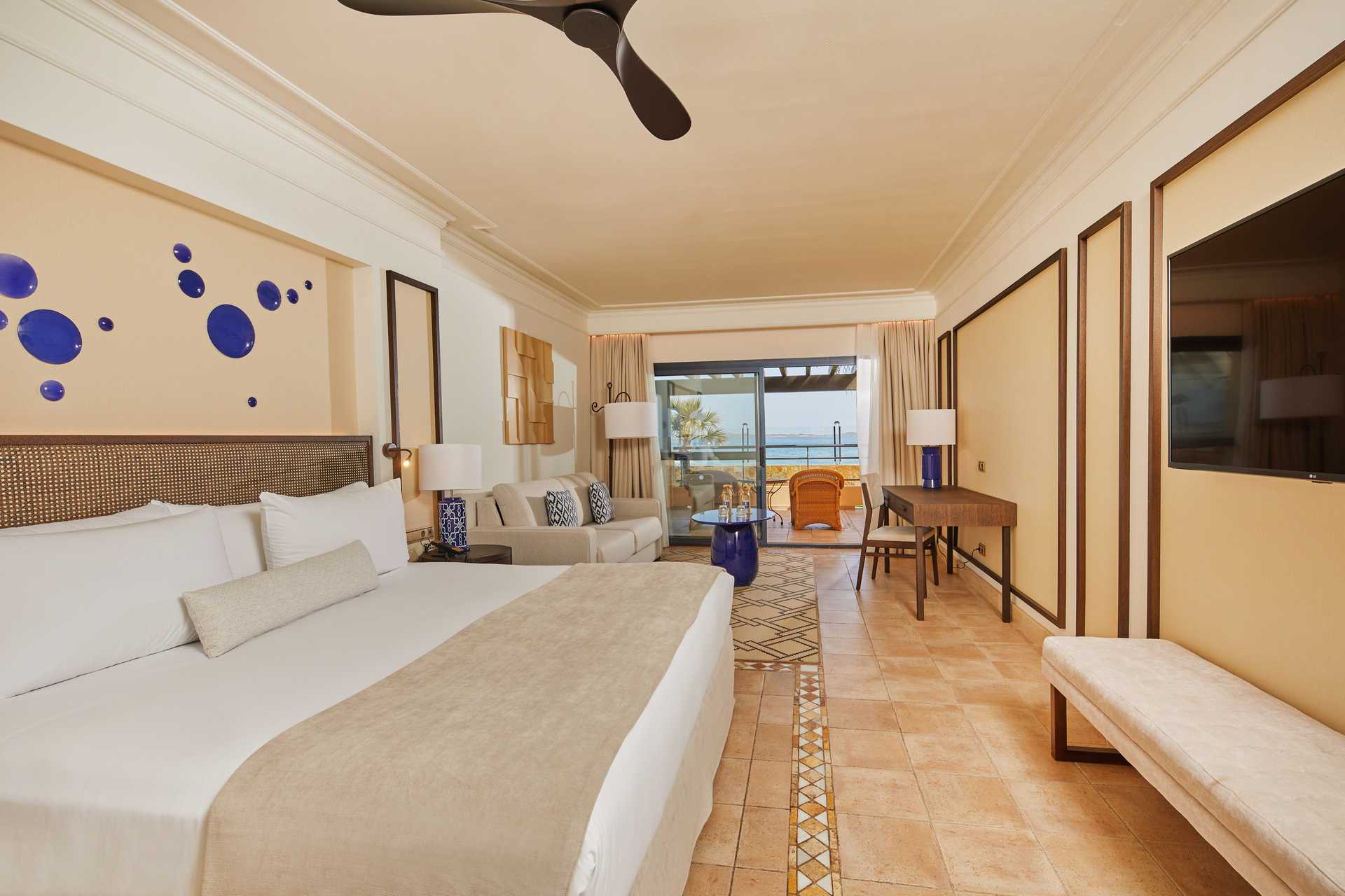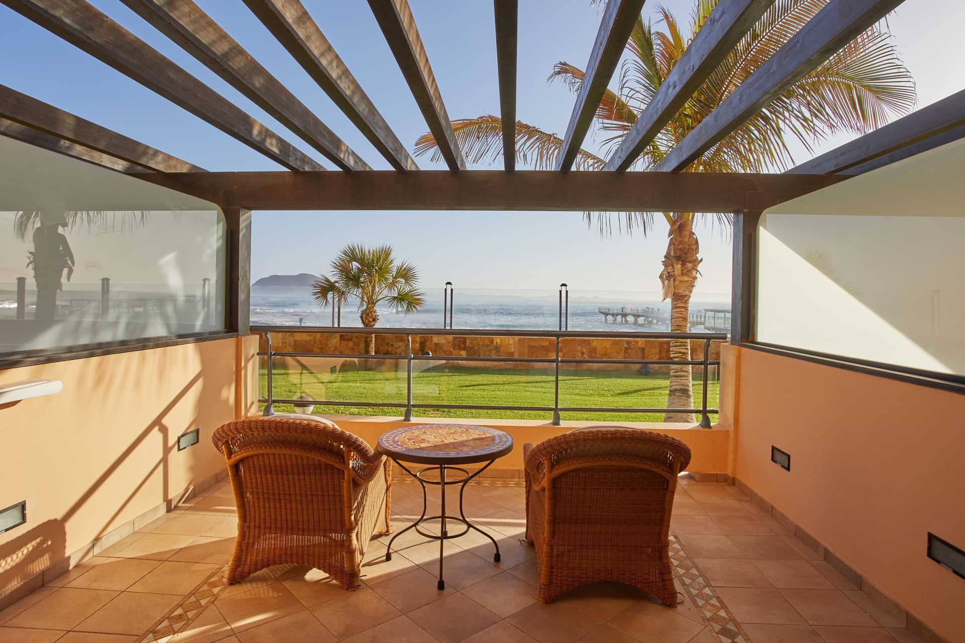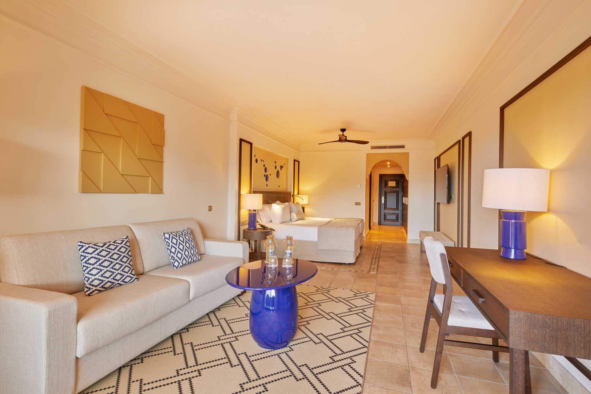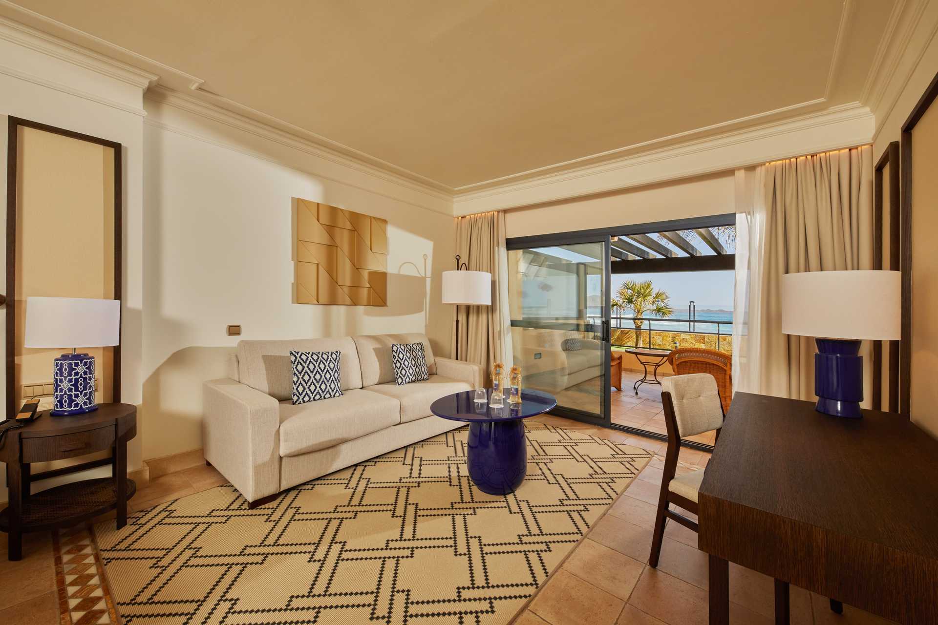 Suite med balkong og havutsikt. Suiten består av et soverom med en dobbeltseng eller to enkeltsenger og en stue med lenestoler, sofa og bord. Stor balkong med lenestoler og bord samt solsenger. Wifi, sentralstyrt luftkondisjonering (oppvarming om vinteren) og safe inkludert. Takvifte. Putemeny. Minibar er inkludert og fylles daglig med vann, brus og øl. Vannkoker samt kaffe og te. TV. Badekåper og tøfler Hårføner. Badekar med boblebad, separat dusj og wc. Rengjøring 7 ggr/uke.