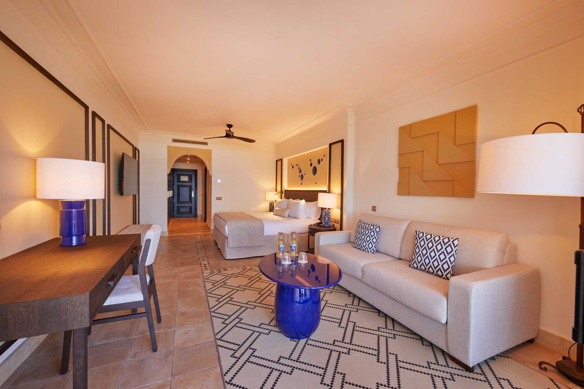 Juniorsuite med balkong, noen med havutsikt, begrenset havutsikt eller bassengutsikt. En dobbeltseng eller to enkeltsenger. Putemeny. Wifi, sentralstyrt luftkondisjonering (oppvarming om vinteren) og safe inkludert. Minibar. Vannkoker samt kaffe og te. TV. Badekåper og tøfler Hårføner. Badekar eller dusj samt wc. Rengjøring 7 ggr/uke.