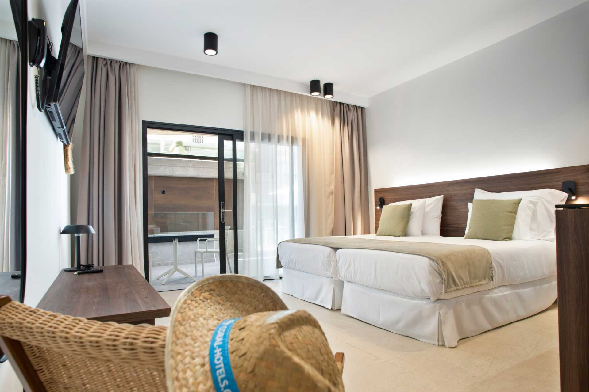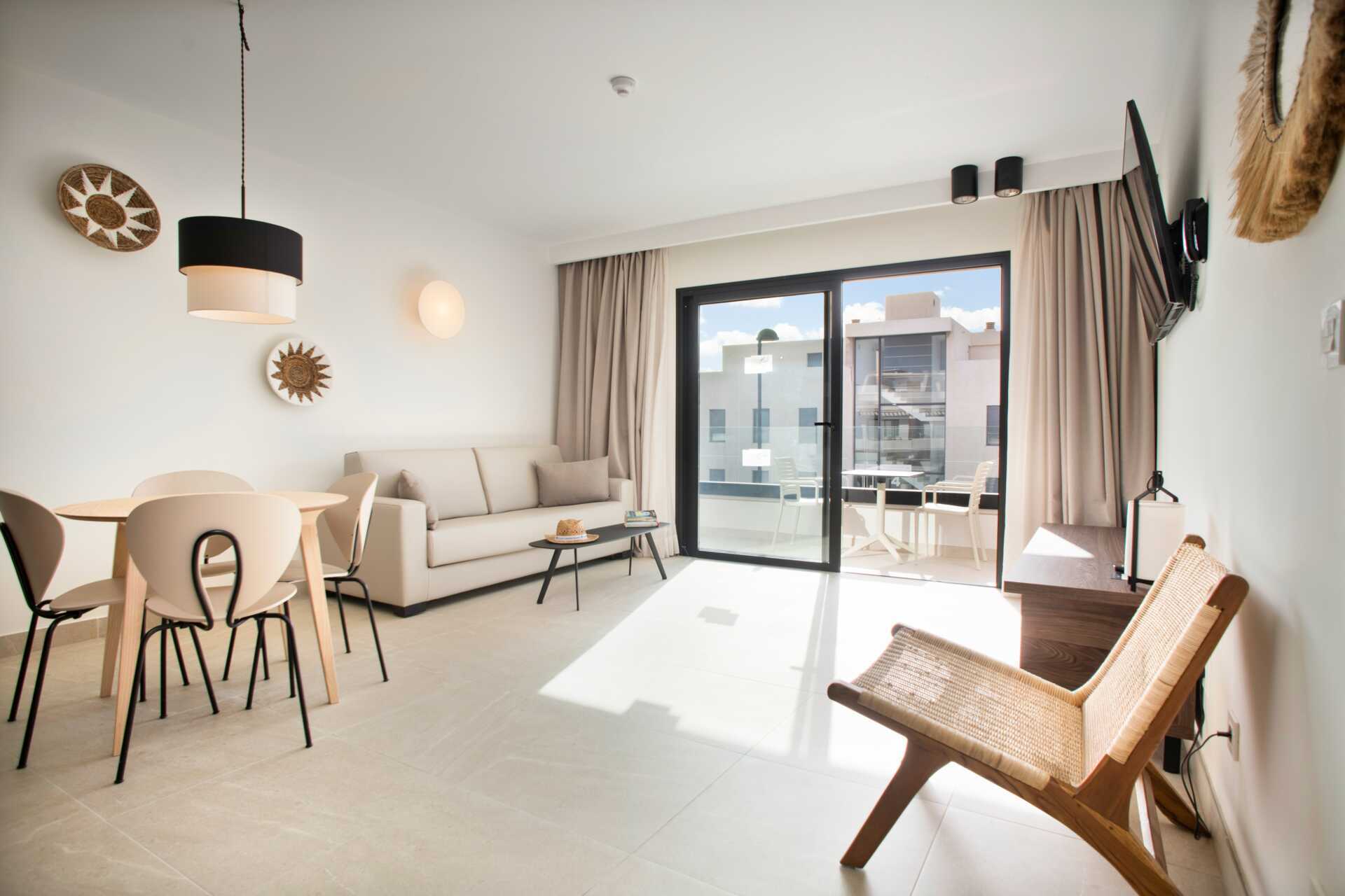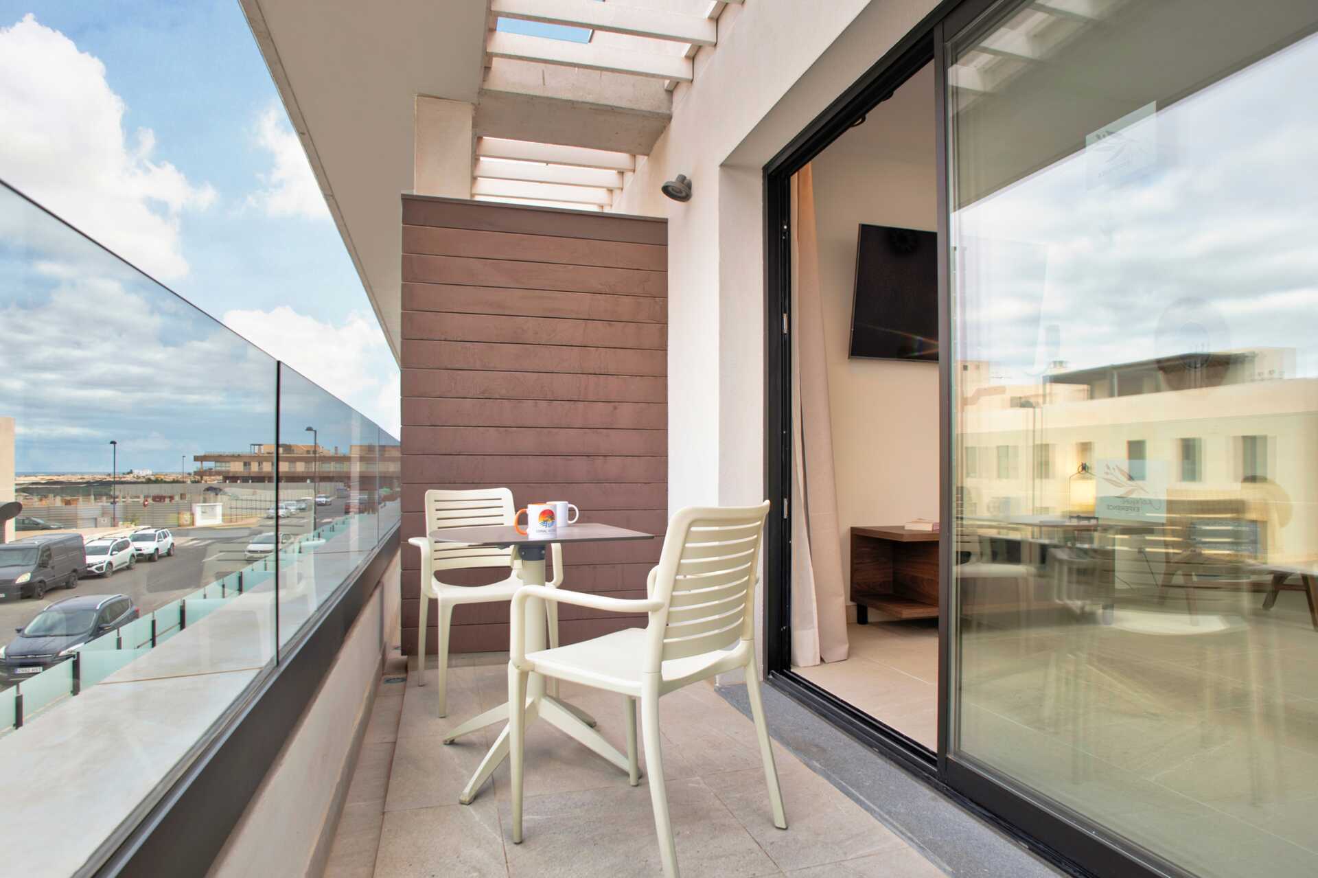 Treromsleilighet med balkong og terrasse. To soverom og en stue med minikjøkken. Minikjøkken med kokeplater, kjøleskap, kaffetrakter, vannkoker og enkelt kjøkkenutstyr. Wifi, luftkondisjonering og safe inkludert. TV. Hårføner. Dusj og wc. Rengjøring 7 ggr/uke.