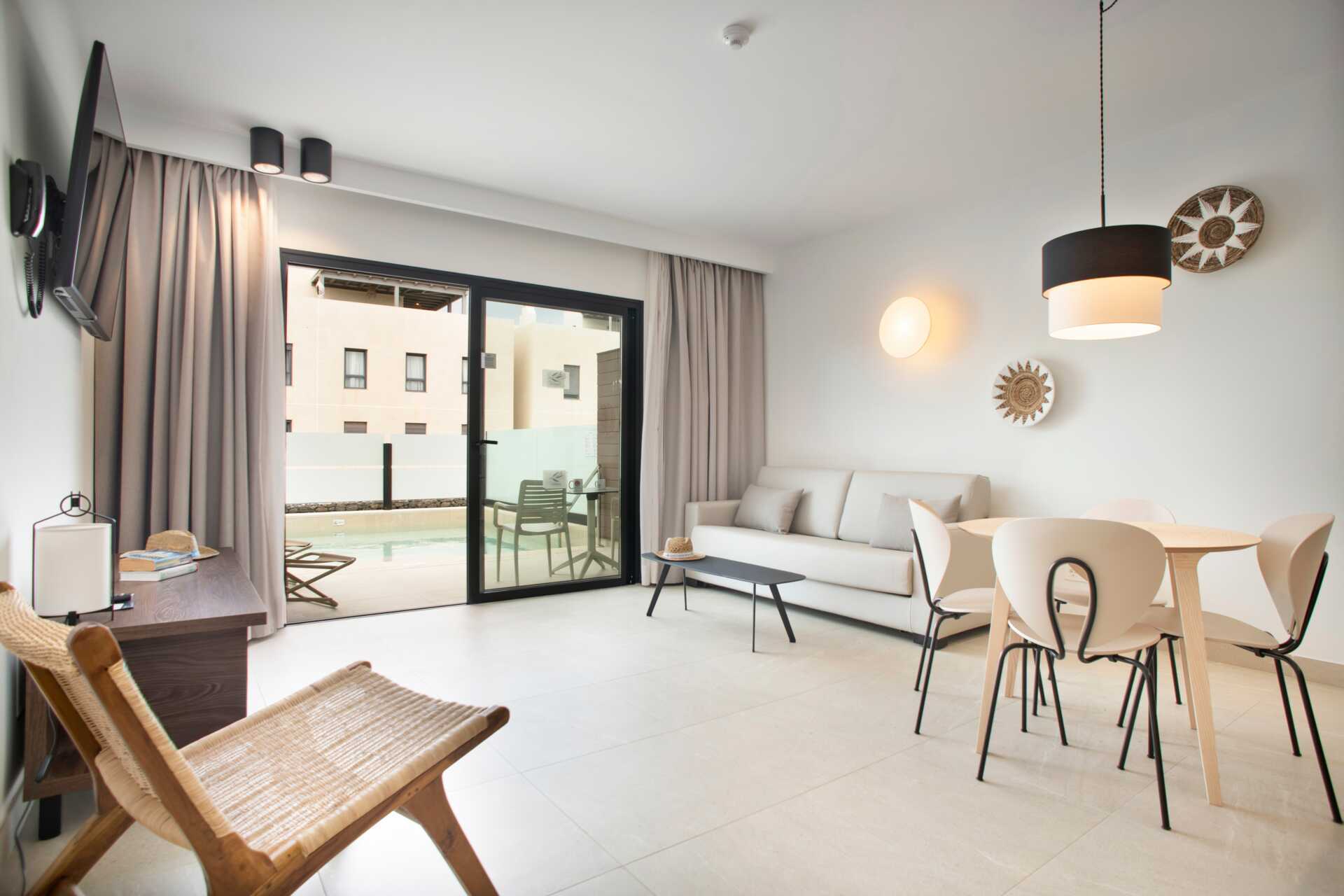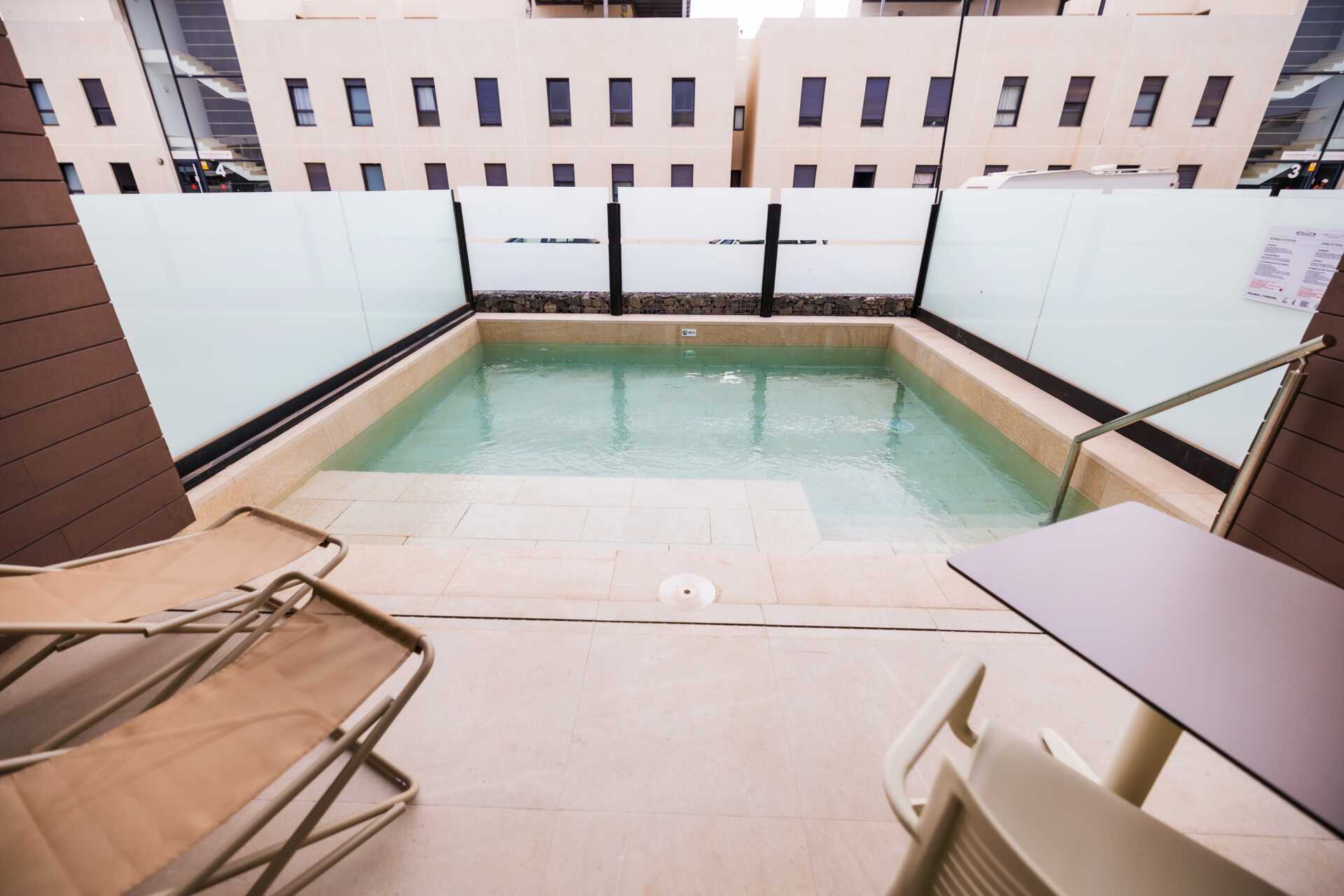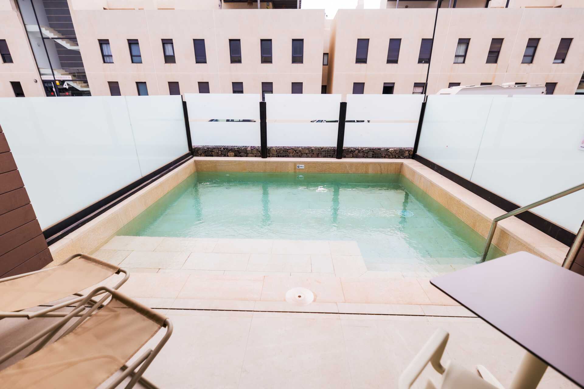 Treromsleilighet med eget basseng på terrassen. To soverom og en stue med minikjøkken. Minikjøkken med kokeplater, kjøleskap, kaffetrakter, vannkoker, kaffe og te og enkelt kjøkkenutstyr. Wifi, luftkondisjonering og safe inkludert. TV. Hårføner. Dusj og wc. Rengjøring 7 ggr/uke.