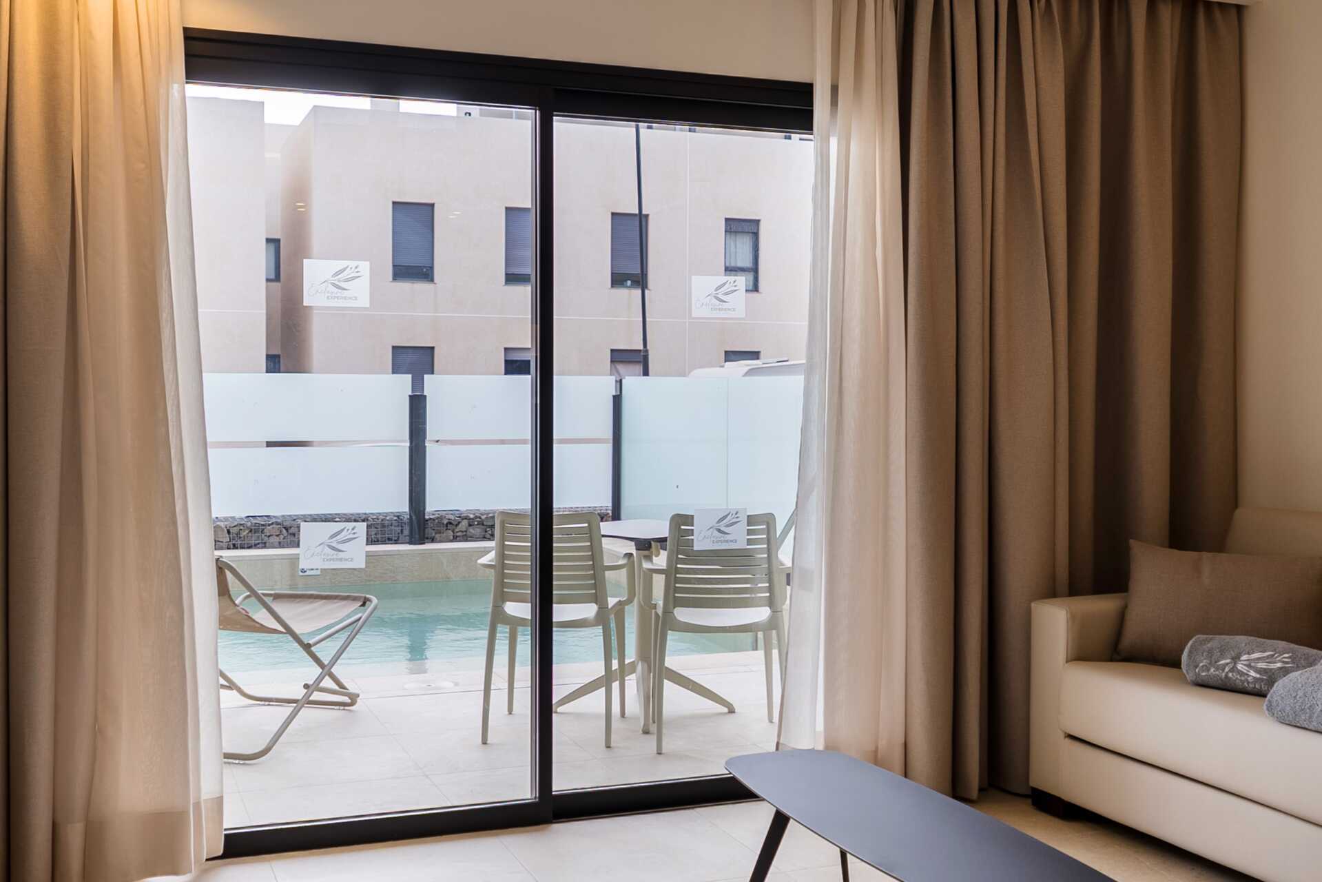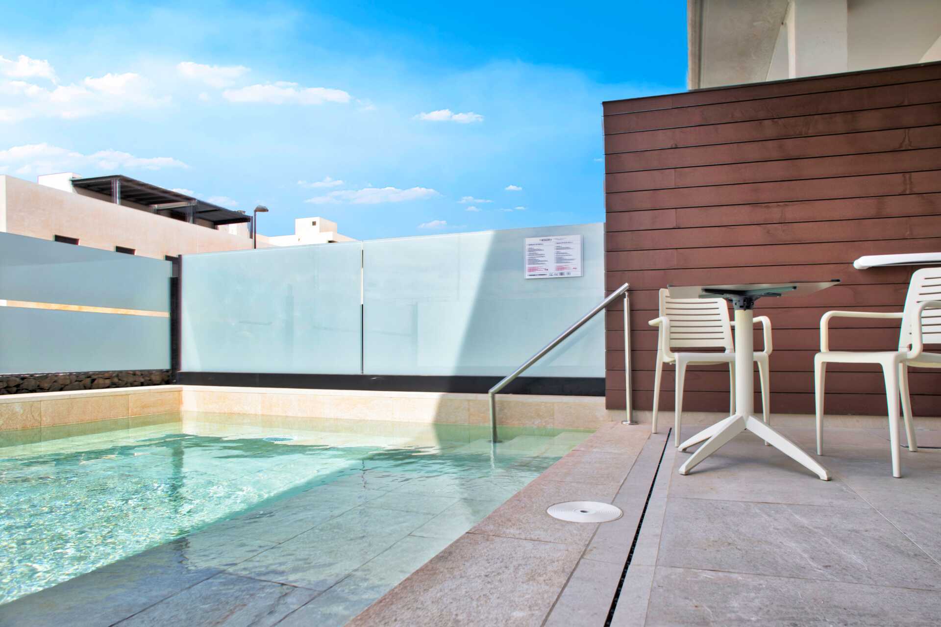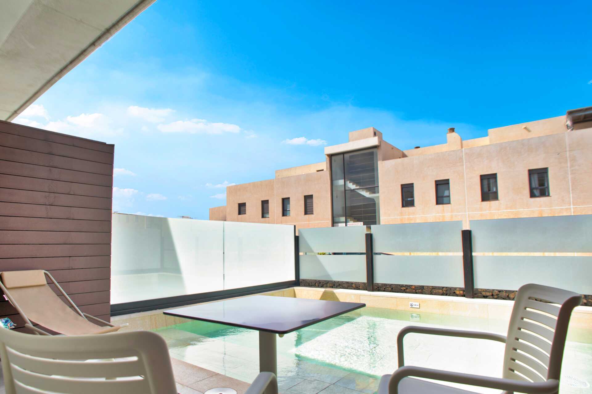 Treromsleilighet med eget basseng på terrassen. To soverom og en stue med minikjøkken. Minikjøkken med kokeplater, kjøleskap, kaffetrakter, vannkoker, kaffe og te og enkelt kjøkkenutstyr. Wifi, luftkondisjonering og safe inkludert. TV. Hårføner. Dusj og wc. Rengjøring 7 ggr/uke.