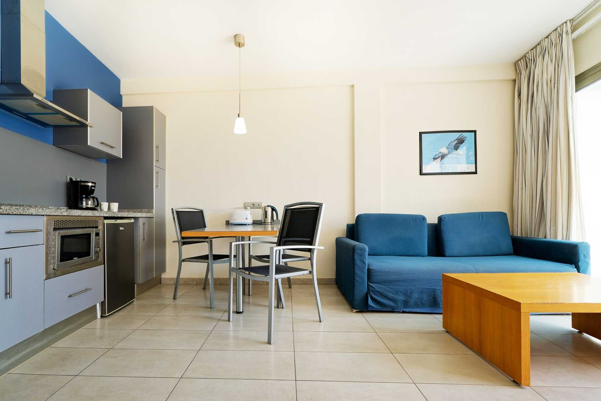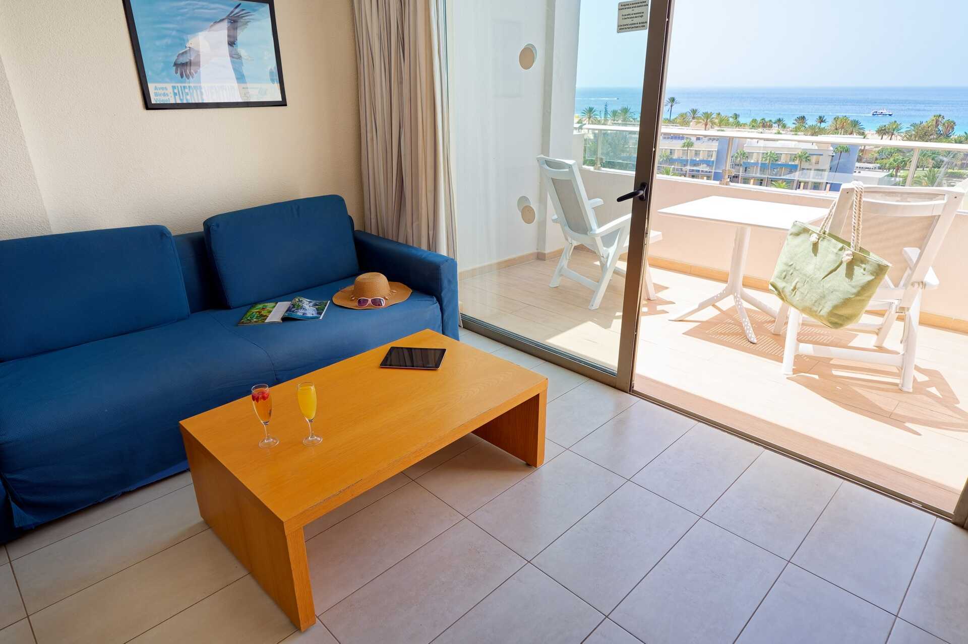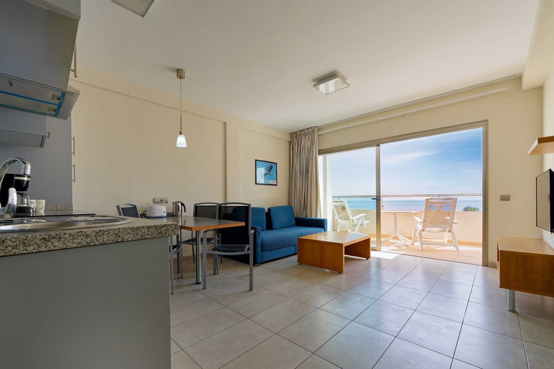 Toromsleilighet superior med balkong, noen med havutsikt. Leilighetene med havutsikt ligger høyere oppe på hotellet. Et soverom og en stue med minikjøkken. To enkeltsenger. Mulig med en ekstraseng i sovesofa. Wifi inkludert. Safe mot avgift. Minikjøkken med kokeplater, kjøleskap, kaffetrakter, mikrobølgeovn og enkelt kjøkkenutstyr. TV. Dusj og wc. Rengjøring 2 ggr/uke.