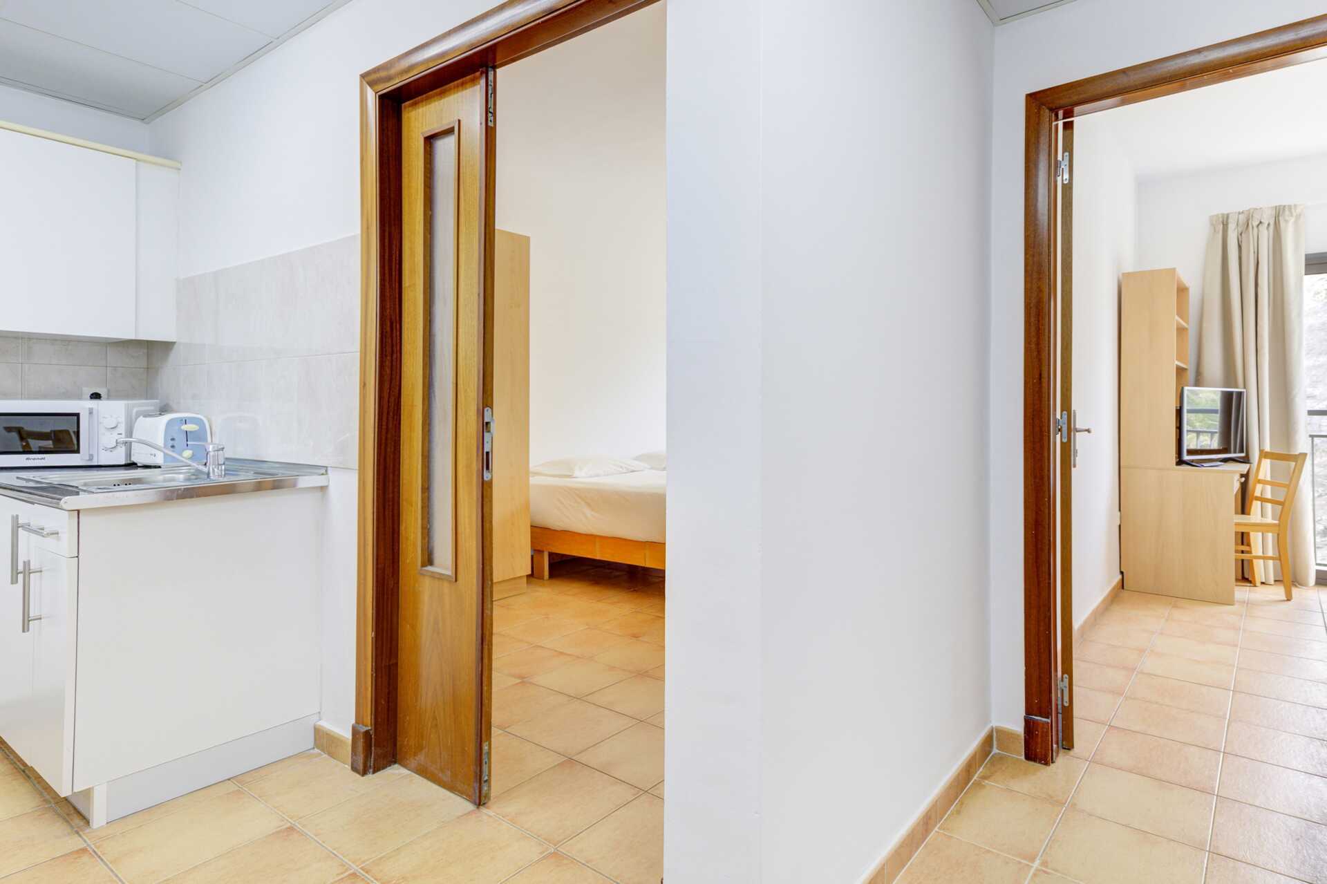 Treromsleiligheter, noen med markterrasse andre uten uteplass. To soverom med to enkeltsenger som står sammen (twinbed) i hvert rom. Leiligheter for opptil 6 personer har to køyesenger i det ene soverommet. Minikjøkken med spiseplass. Kokeplater, mikrobølgeovn, kjøleskap med en liten frysedel og enkelt kjøkkenutstyr samt kaffe- og tefasiliteter. Flislagt gulv. Wifi og safe inkludert. Dusj og to toaletter. Rengjøring 5 ggr/uke.