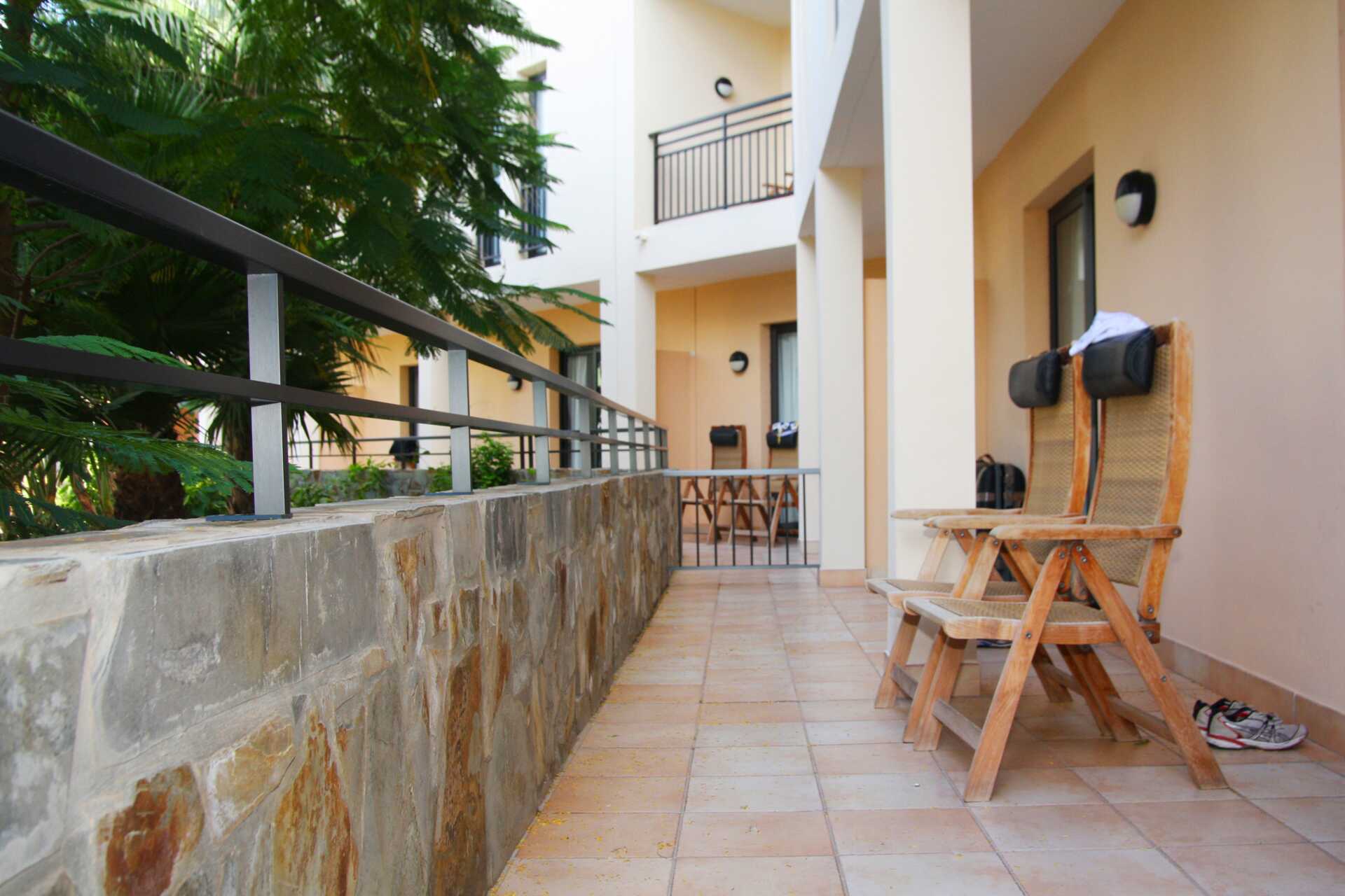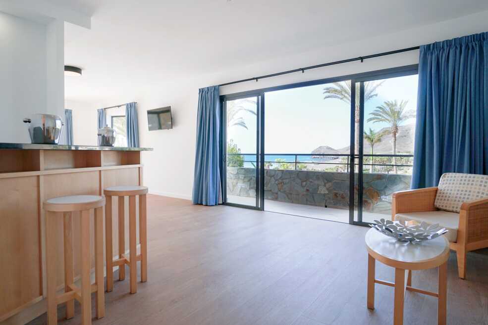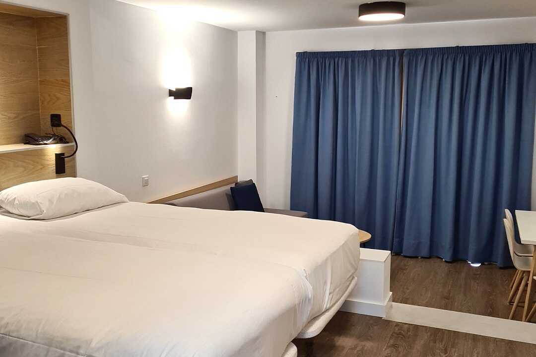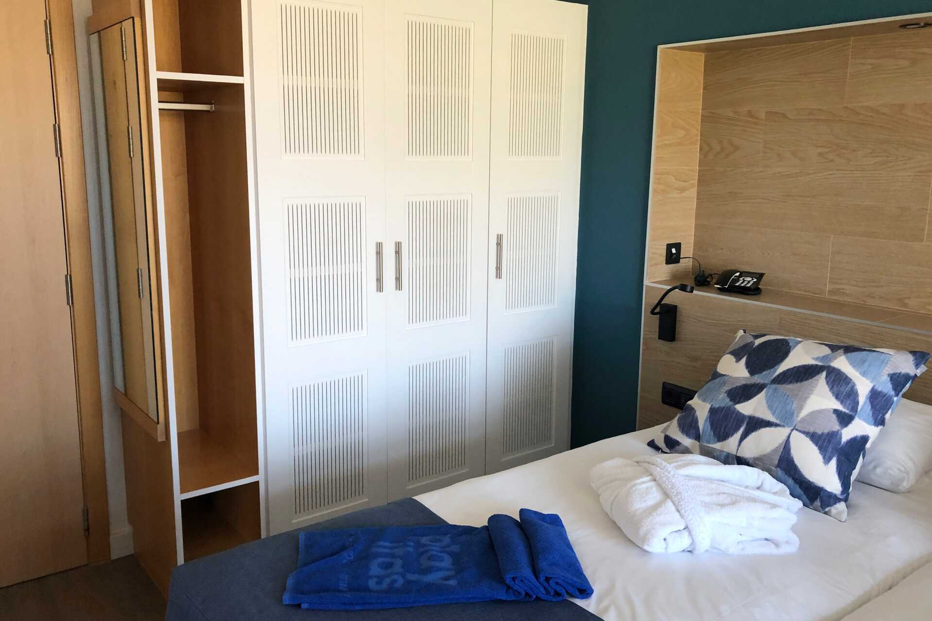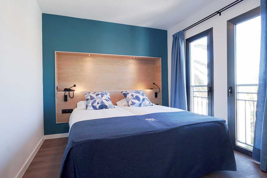Toromsleilighet med balkong, noen med havutsikt eller begrenset havutsikt. En dobbeltseng. Mulig med ekstraseng i sovesofa eller feltseng. Wifi, safe og sentralstyrt luftkondisjonering inkludert. Minibar, påfyll bestilles i resepsjonen. Vannkoker. TV. Hårføner. Mulighet for leie av badekåper. Bad med dusj og wc. Rengjøring 7 ggr/uke.