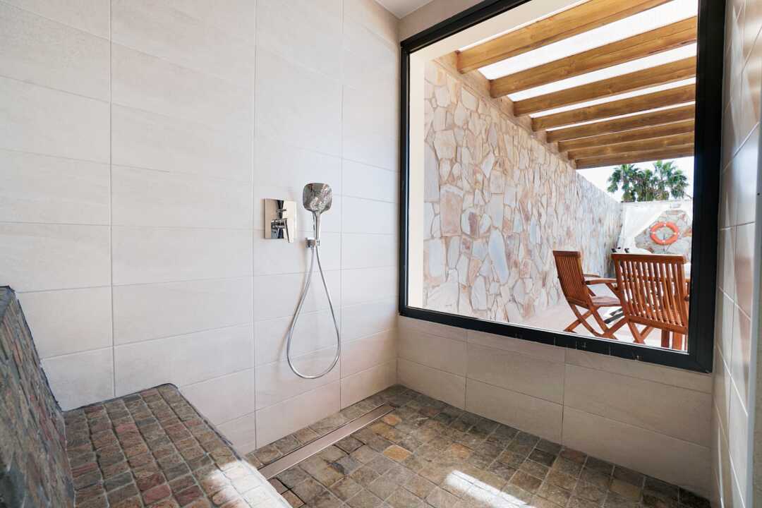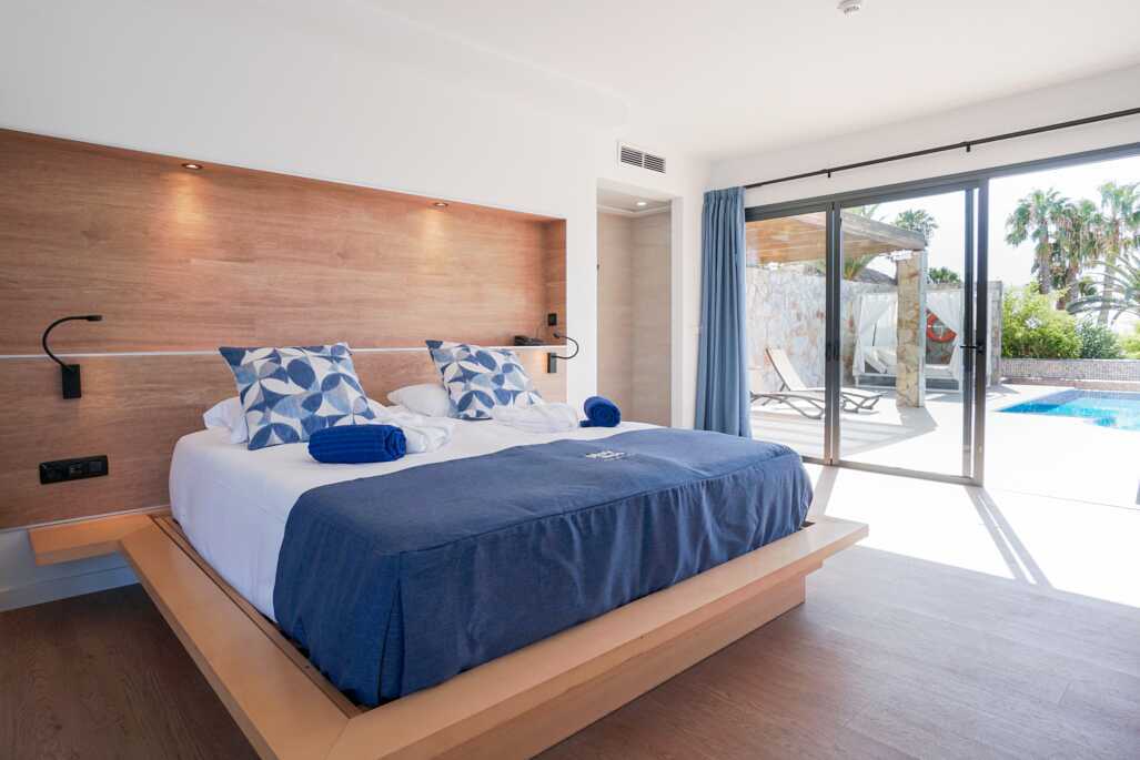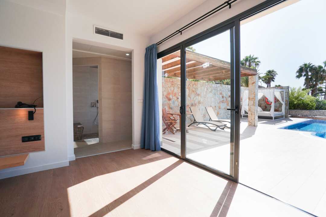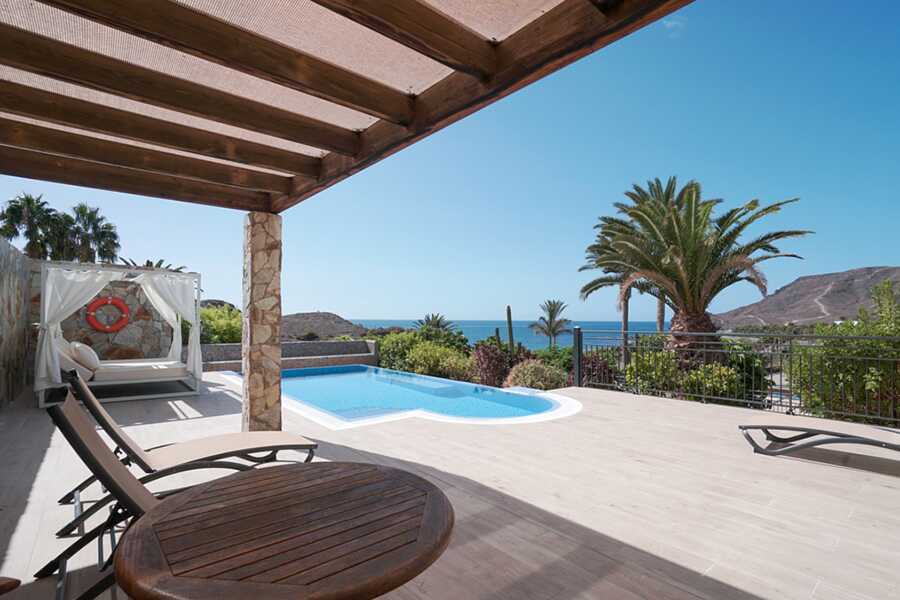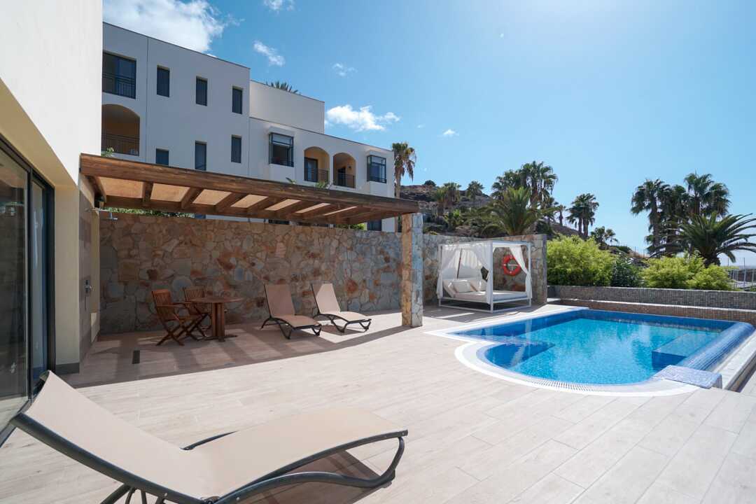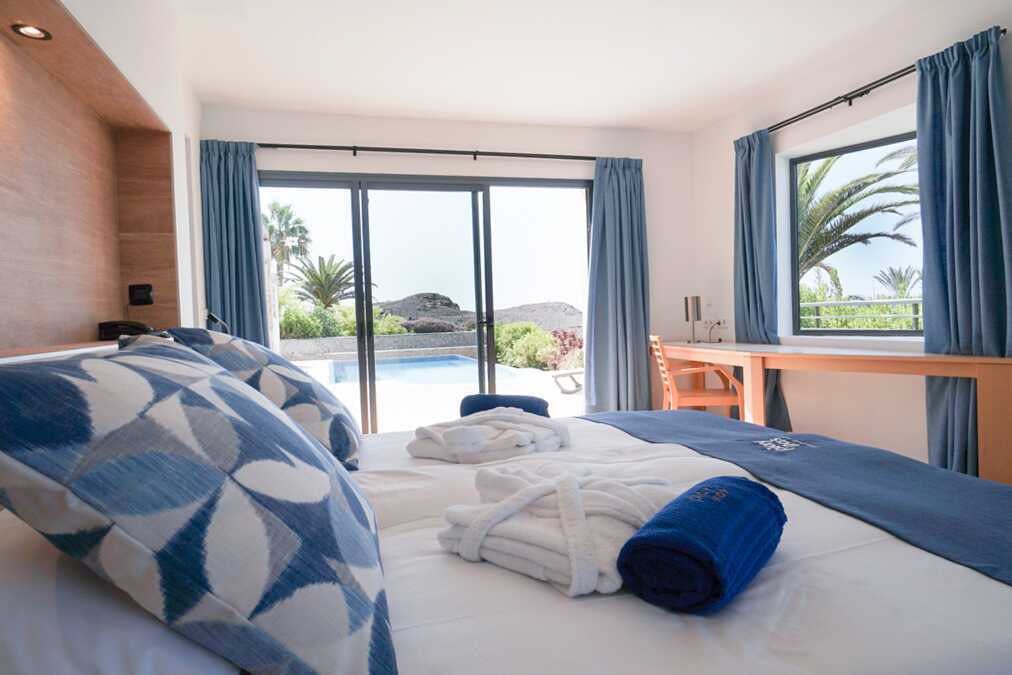 Poolsuiter med en 55 kvm stor terrasse og eget, oppvarmet basseng. En dobbeltseng. Mulig med en ekstraseng i sovesofa. Wifi, safe og sentralstyrt luftkondisjonering inkludert. Minibar, påfyll bestilles i resepsjonen. Vannkoker. TV. Hårføner. Mulighet for leie av badekåper. Dusj og wc. Rengjøring 7 ggr/uke.