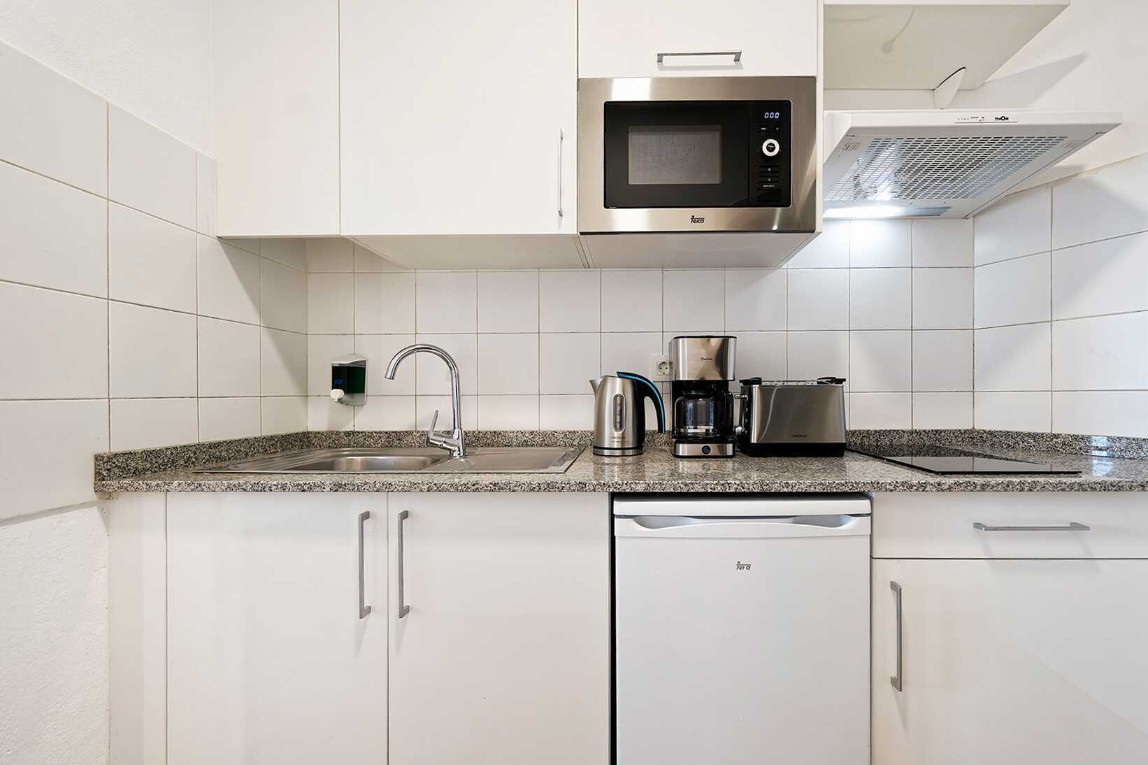 Ettromsleilighet med balkong alternativt stor balkong eller terrasse med sykkelstativ. Minikjøkken. To enkeltsenger. Mulig med ekstrasenger i sovesofa og feltseng. Minikjøkken med kokeplater, kjøleskap, kaffetrakter, brødrister, mikrobølgeovn og enkelt kjøkkenutstyr. Wifi, luftkondisjonering og safe inkludert. Smart-TV. Hårføner. Badekar eller dusj samt wc. Rengjøring 5 ganger/uke (ingen rengjøring onsdager og søndager).