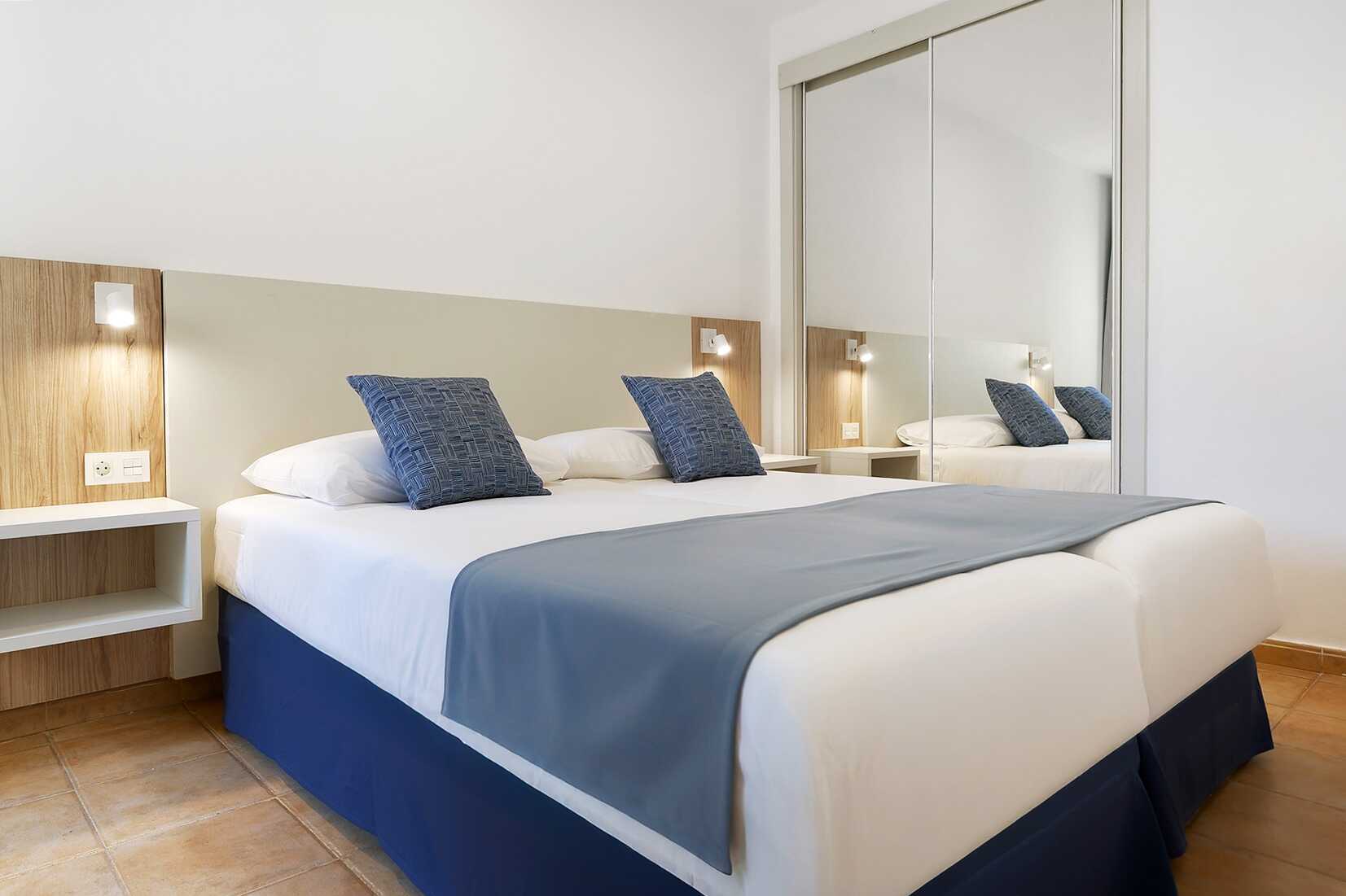 Treromsleilighet med balkong, noen med bassengutsikt, alternativt stor balkong. To soverom og stue med minikjøkken. To enkeltsenger i hvert soverom. Mulig med ekstrasenger i sovesofa og feltseng. Minikjøkken med kokeplater, kjøleskap, kaffetrakter, brødrister, mikrobølgeovn og enkelt kjøkkenutstyr. Wifi, luftkondisjonering og safe inkludert. Smart-TV. Hårføner. Baderom med dusj og wc. Rengjøring 5 ganger/uke (ingen rengjøring onsdager og søndager).