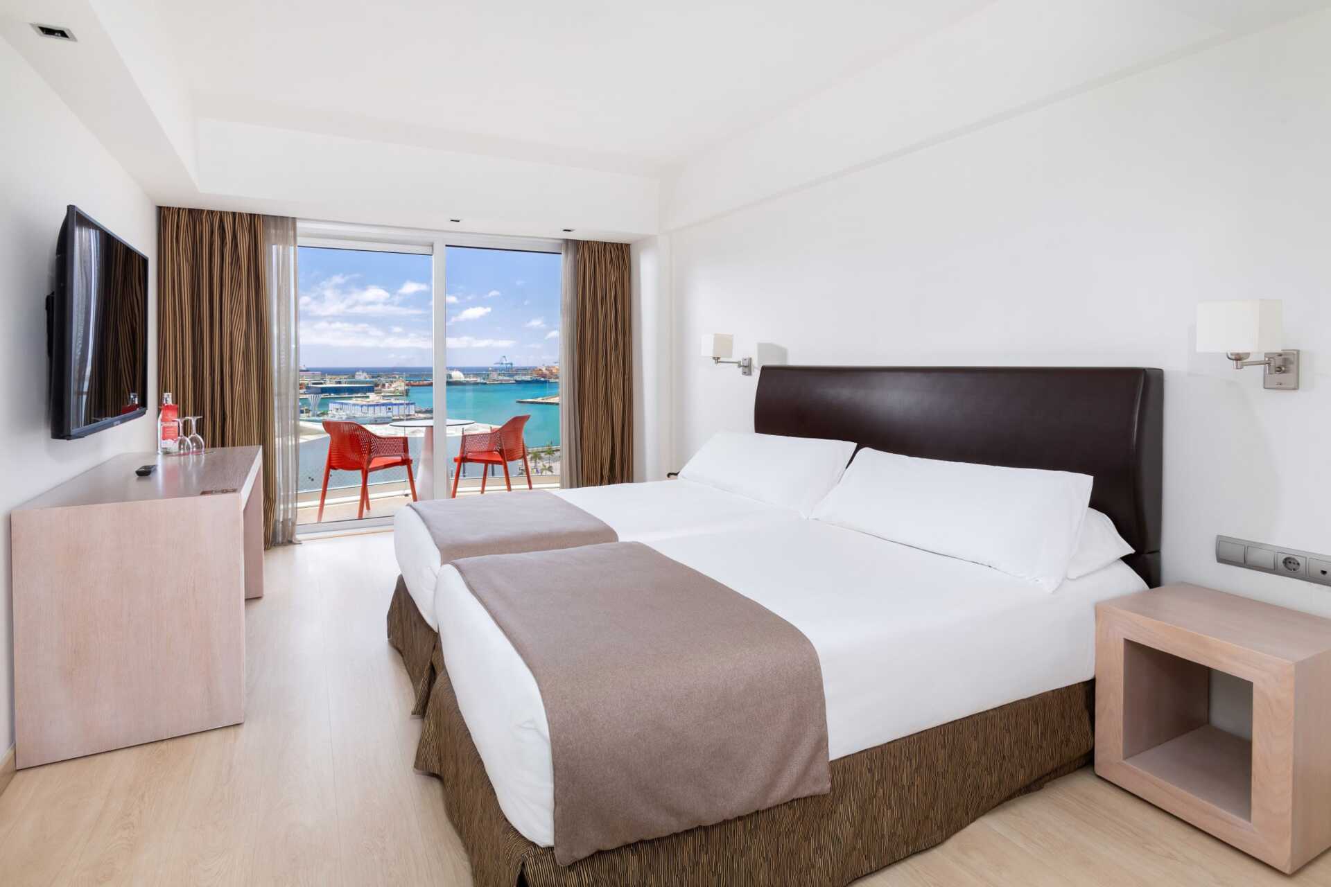 Deluxerom med balkong og havutsikt. Rommene har forskjellig design og planløsning, det kan ikke gis garanti for hvilken romtype du får på stedet. En dobbeltseng eller to enkeltsenger. Luftkondisjonering, safe og wifi inkludert. Kjøleskap. TV. Hårføner. Badekar og wc. Rengjøring 7 ggr/uke.