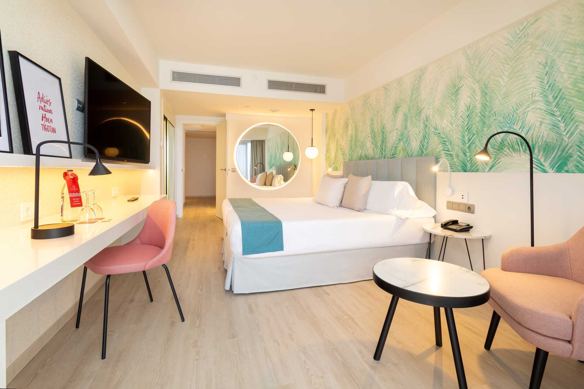 Superiorrom med balkong. Rommet består av et soverom med en dobbeltseng eller to enkeltsenger og stue med ekstrasenger i sovesofa. Luftkondisjonering, safe og wifi inkludert. Kjøleskap. TV. Hårføner. Bad med badekar og separat wc. Rengjøring 7 ggr/uke.