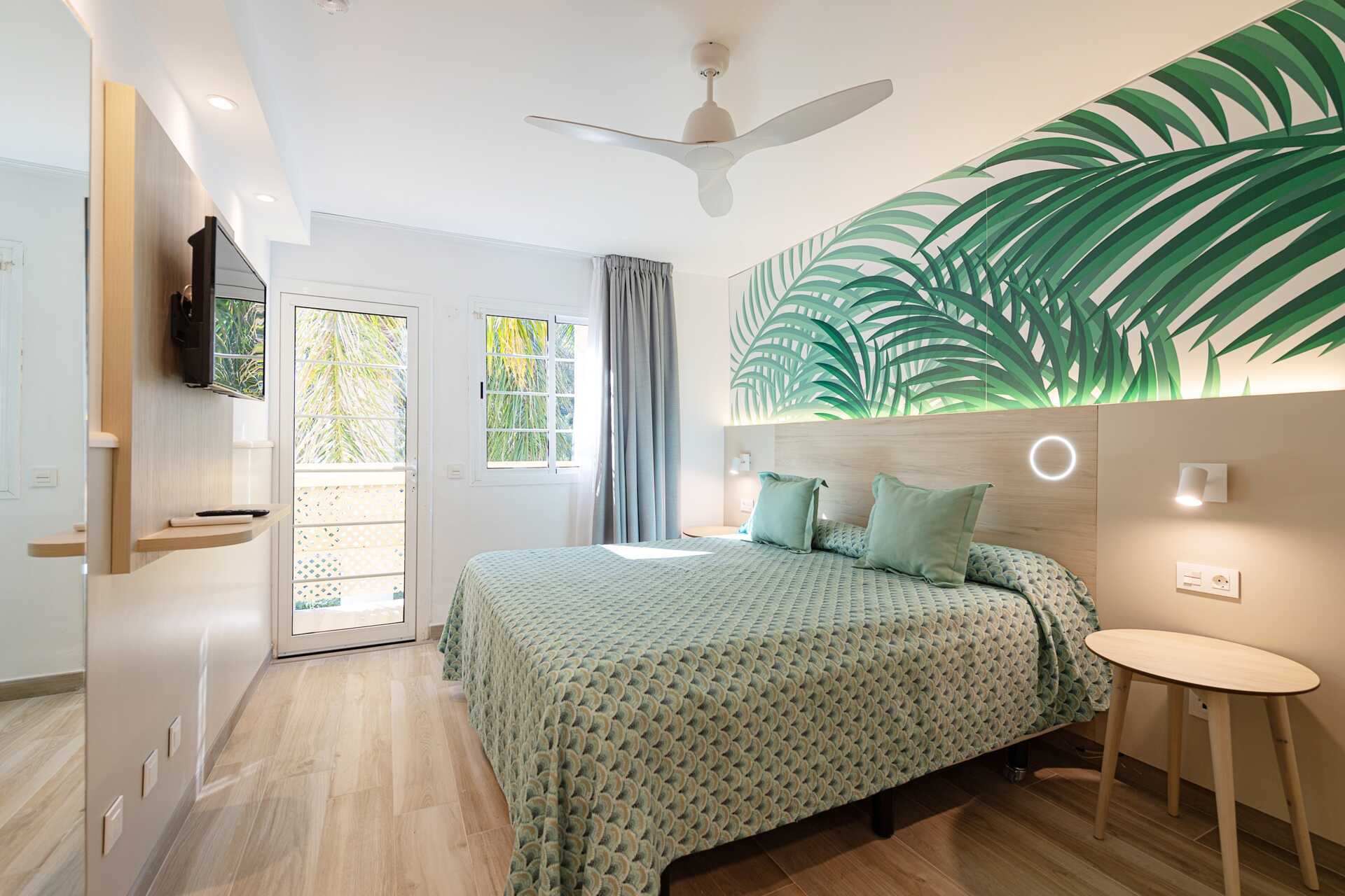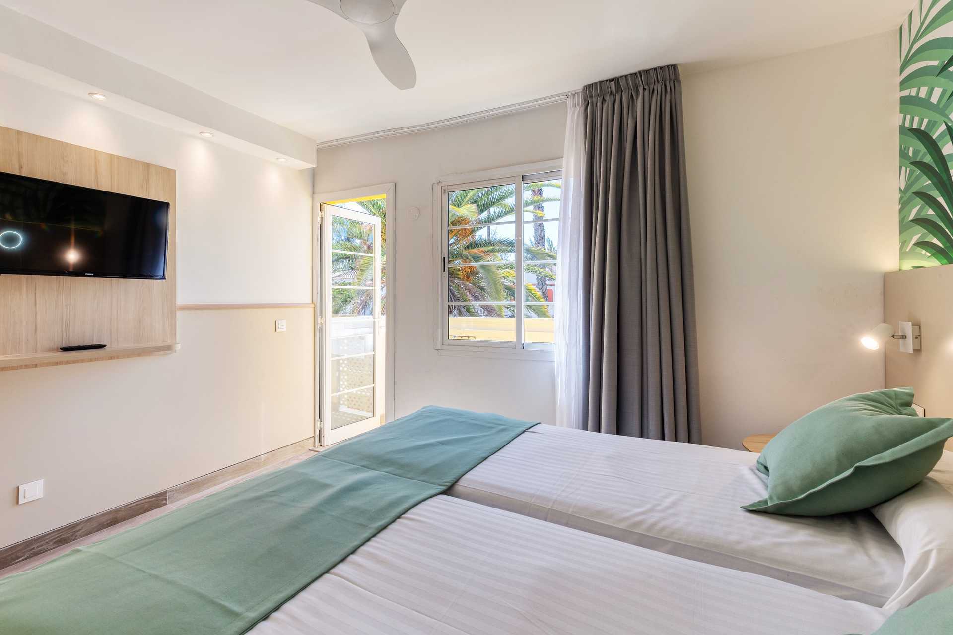 Toromsleilighet i etasje, plus med markterrasse og en liten balkong. Leilighetene ligger i bungalowlignende rekker som har en god beliggenhet på hotellet. Neder er det en stue med minikjøkken mulig med ekstrasenger i sovesofa. En trapp opp er det et soverom med to enkeltsenger og en balkong. Det er åpent mellom etasjene. Minikjøkken med kokeplater, kjøleskap, kaffetrakter, vannkoker, mikrobølgeovn, brødrister og enkelt kjøkkenutstyr. Wifi inkludert. Safe mot avgift. TV. Bad med hårføner, dusj og wc oppe. Rengjøring 5 ggr/uke.