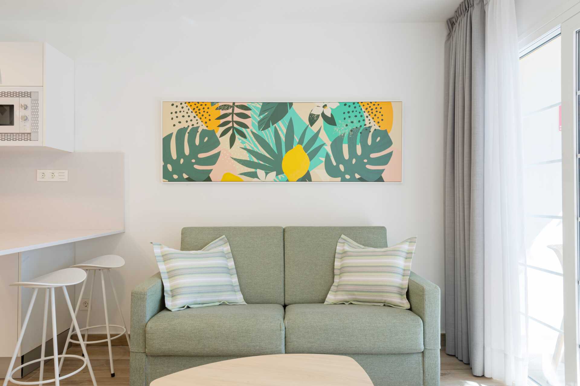 Toromsleilighet i etasje med markterrasse og en liten balkong. Leilighetene ligger i bungalowlignende rekker. Neder er dte en stue med minikjøkken og mulig med ekstrasenger i sovesofa. En trapp opp er det sovehems med to enkeltsenger og en balkong. Det er åpent mellom etasjene. Minikjøkken med kokeplater, mikrobølgeovn, kjøleskap, brødrister, vannkoker, kaffetrakter og enkelt kjøkkenutstyr. Wifi inkludert. Safe mot avgift. TV. Bad med hårføner, dusj og wc en trapp opp. Rengjøring 5 ggr/uke.