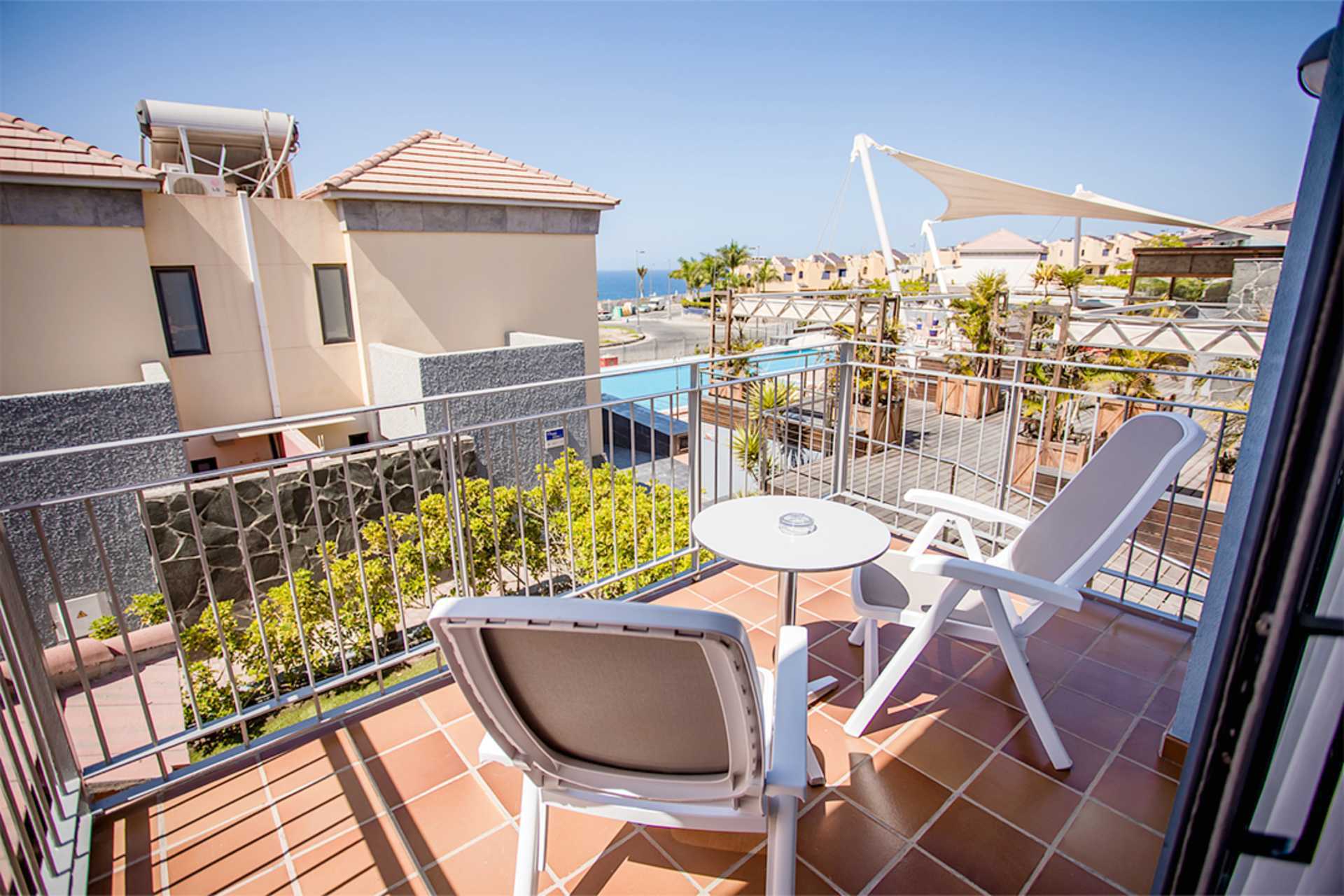 Treromsleilighet superior med balkong og terrasse. Leiligheten er i etasje og består av en toromsleilighet med terrasse nede og et dobbeltrom med balkong oppe. På terrassen er det en sofa, solsenger samt bord og stoler. Nede er det et soverom med to enkeltsenger, et bad med hårføner, dusj og wc samt kombinert stue med minikjøkken med mulighet for ekstrasenger i sovesofa. En trapp opp er det et soverom med to enkeltsenger og et bad med hårføner, dusj og wc. Nivåforskjeller i leiligheten med to trappetrinn til døren som fører opp til øverste etasje. Ekstra puter og bassenghåndklær samt musserende vin og nøtter i leiligheten ved ankomst. Minikjøkken med kjøleskap, kokeplater, kaffetrakter, brødrister og enkelt kjøkkenutstyr. Wifi inkludert. Luftkondisjonering i soverommene inkludert, fjernkontroll mot depositum. Safe mot avgift. TV, fjernkontroll mot depositum. Rengjøring 5 ggr/uke.