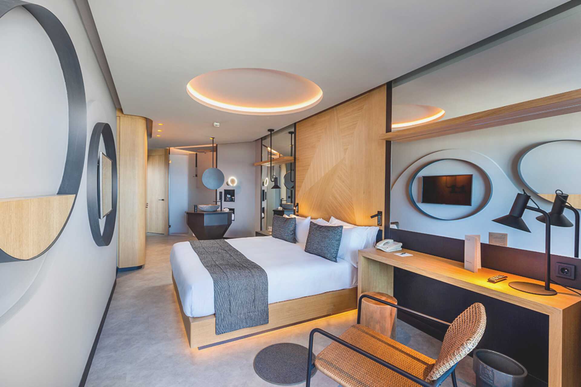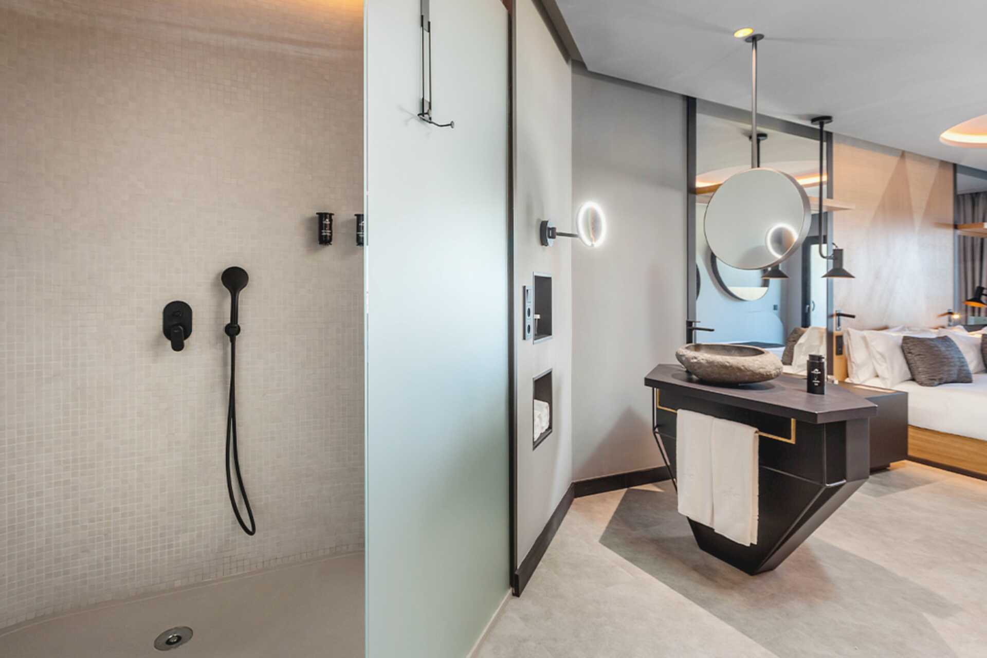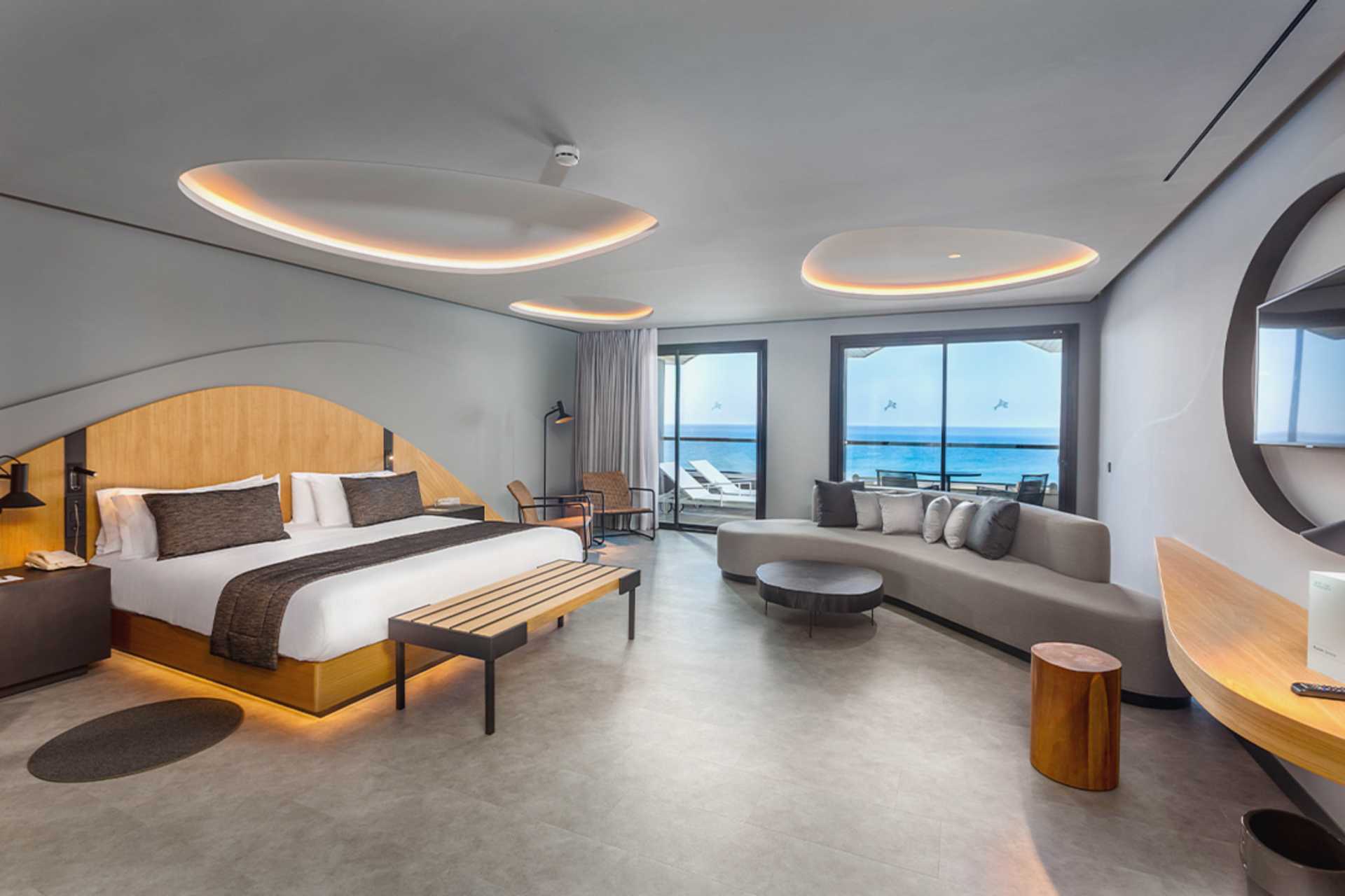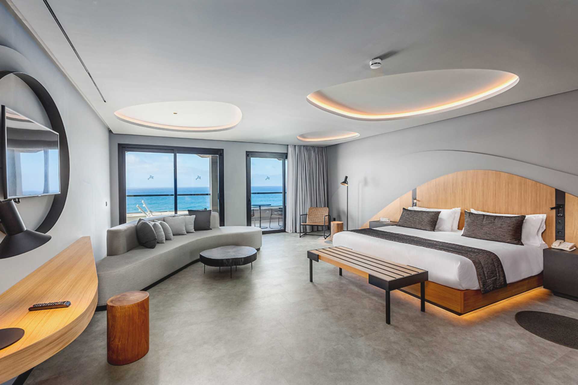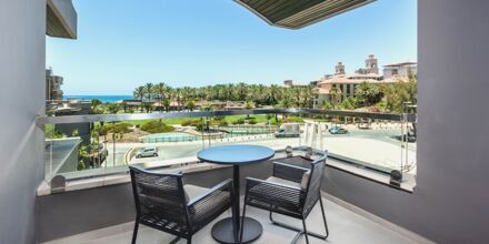 Juniorsuite med balkong og begrenset havutsikt. Solsenger på balkongen. En dobbeltseng. Wifi, luftkondisjonering og safe inkludert. Sofa. Minibar. Nespresso kaffemaskin, kapsler inkludert. Vannkoker. TV. Badekåper og tøfler Hårføner. Bad, delvis åpent mot rommet, men med dusj og wc bak frostede glassdører. Rengjøring 7 ggr/uke.