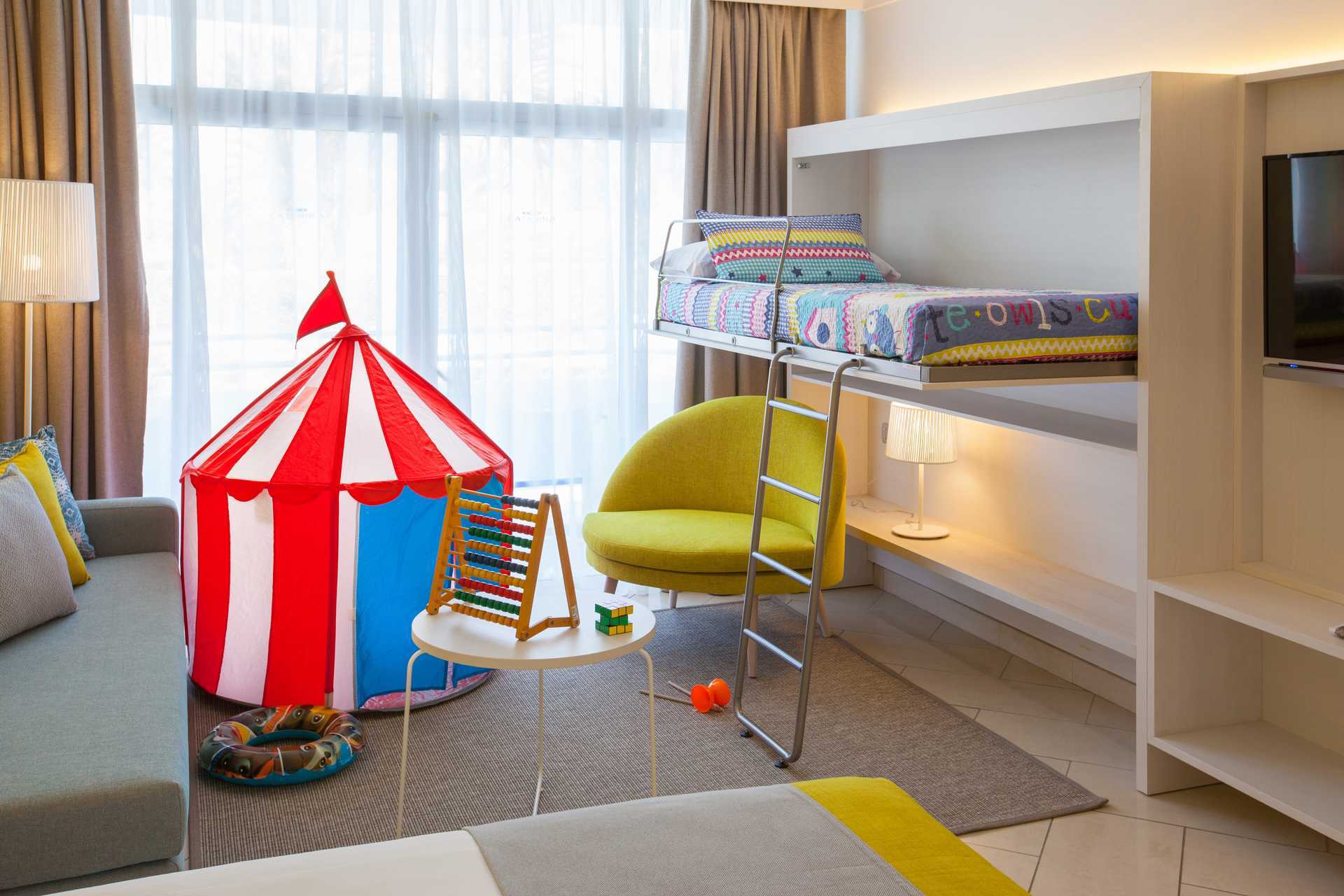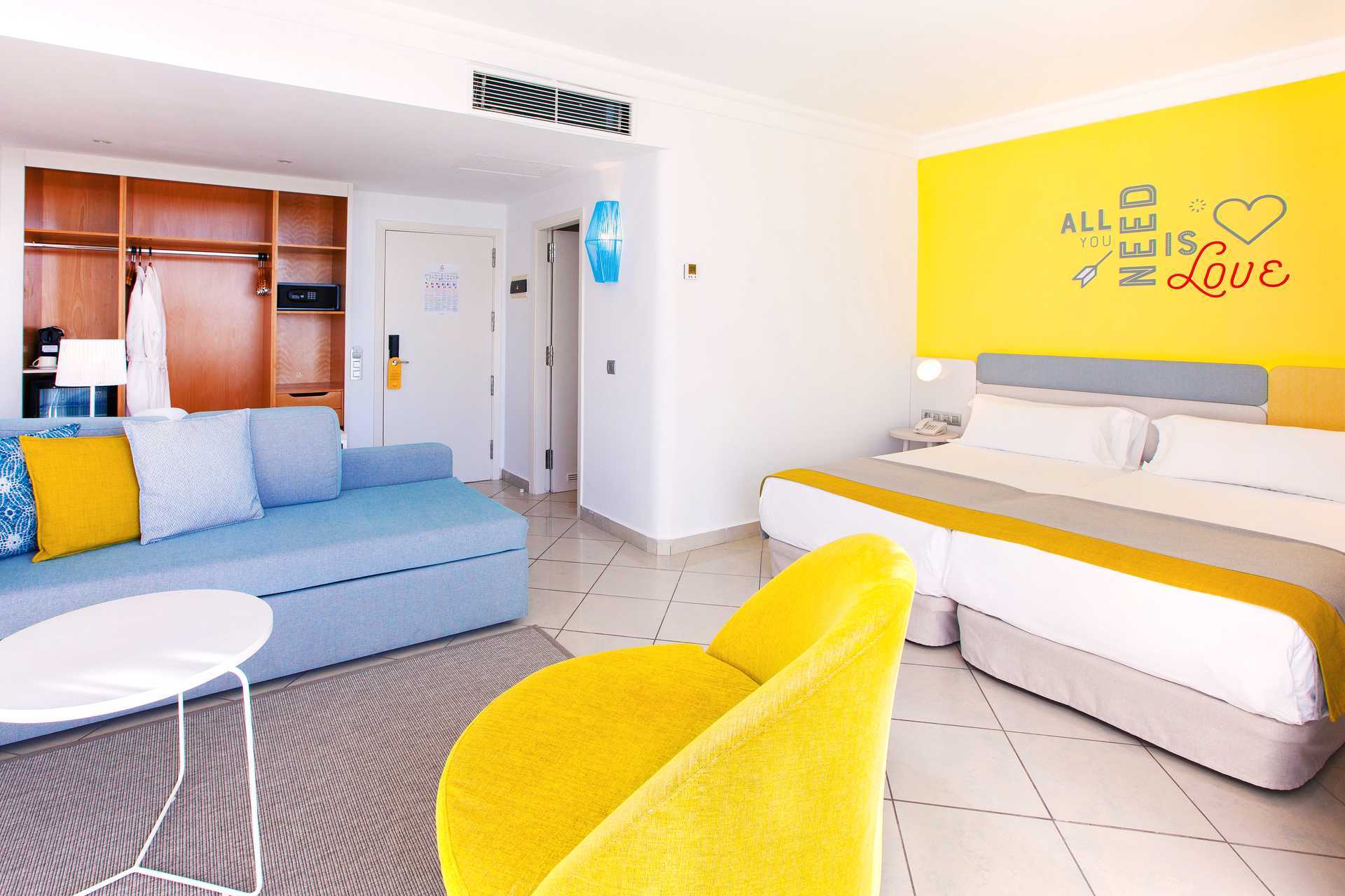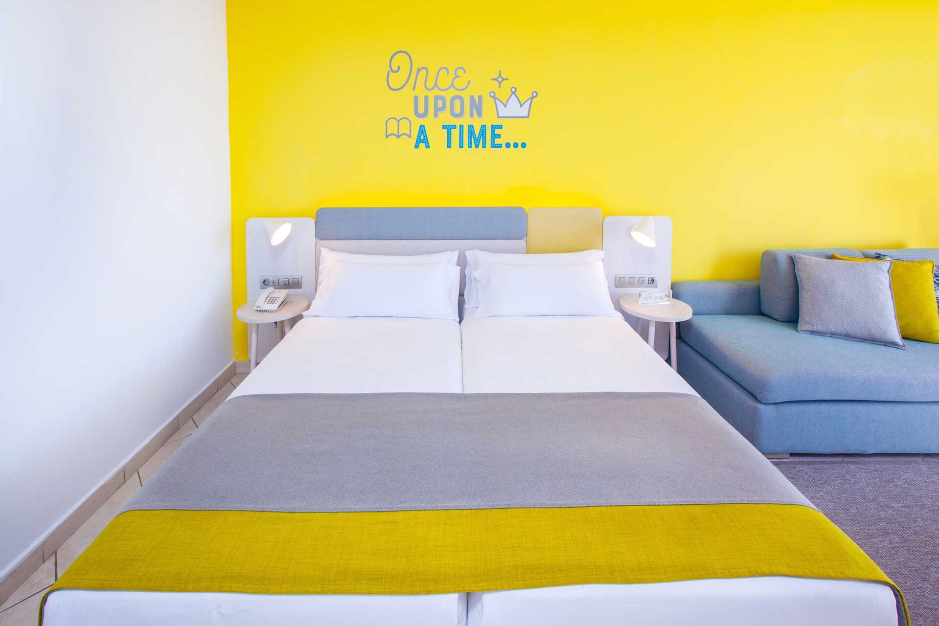 Familierom med uteplass og direkte tilgang til barnebasseng. På balkongen er det bord og stoler samt to solsenger. To enkeltsenger. Mulig med ekstrasenger i sovesofa eller i køyeseng. Sentralstyrt luftkondisjonering er inkludert om sommeren og om nødvendig om vinteren. Wifi inkludert. Safe mot avgift. Minibar mot avgift. Vannkoker samt kaffe og te. En flaske vann på rommet ved ankomst. TV. Hårføner. Dusj og wc. Rengjøring 7 ggr/uke. Barn under 2 år regnes inn i maksantallet i rommet.