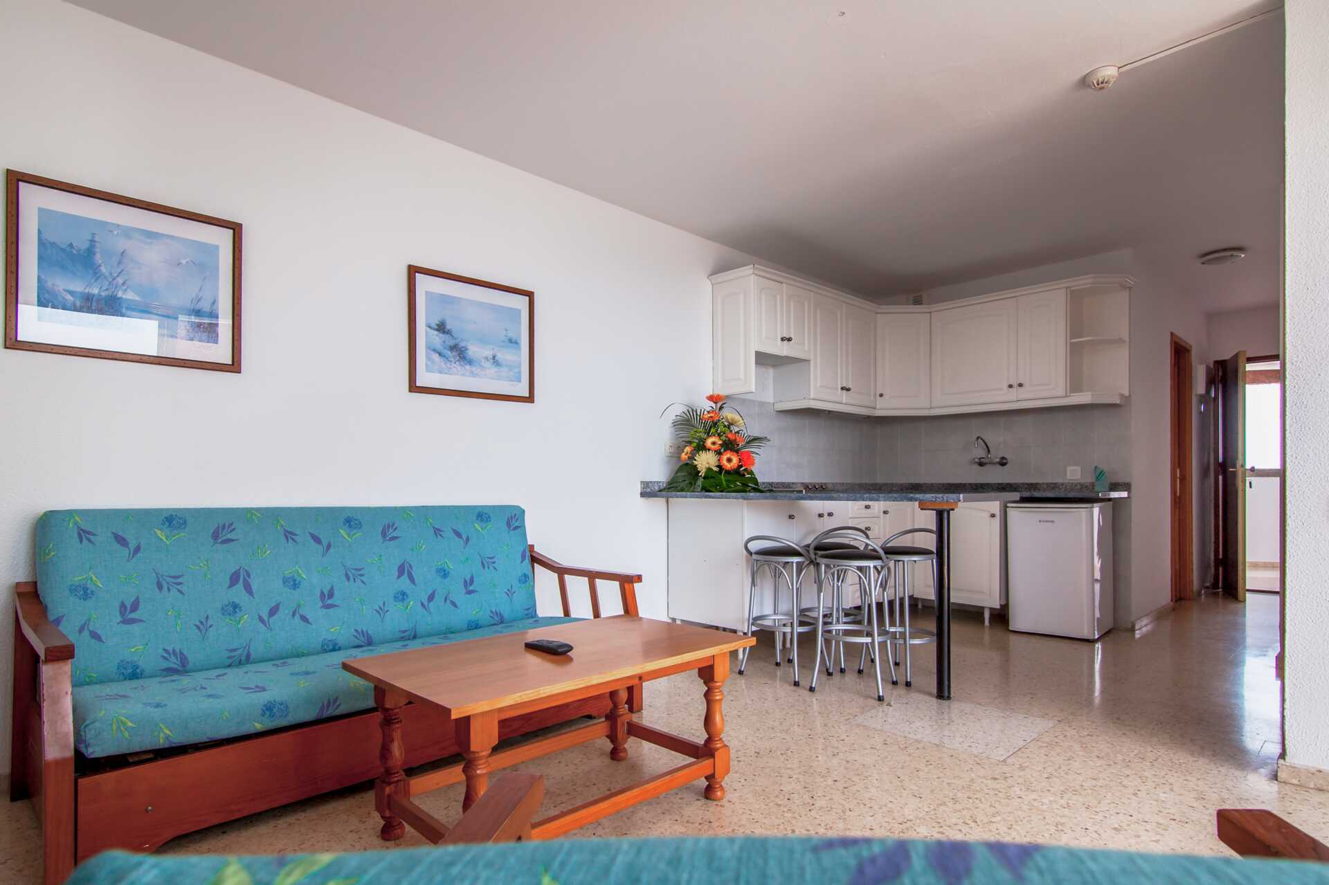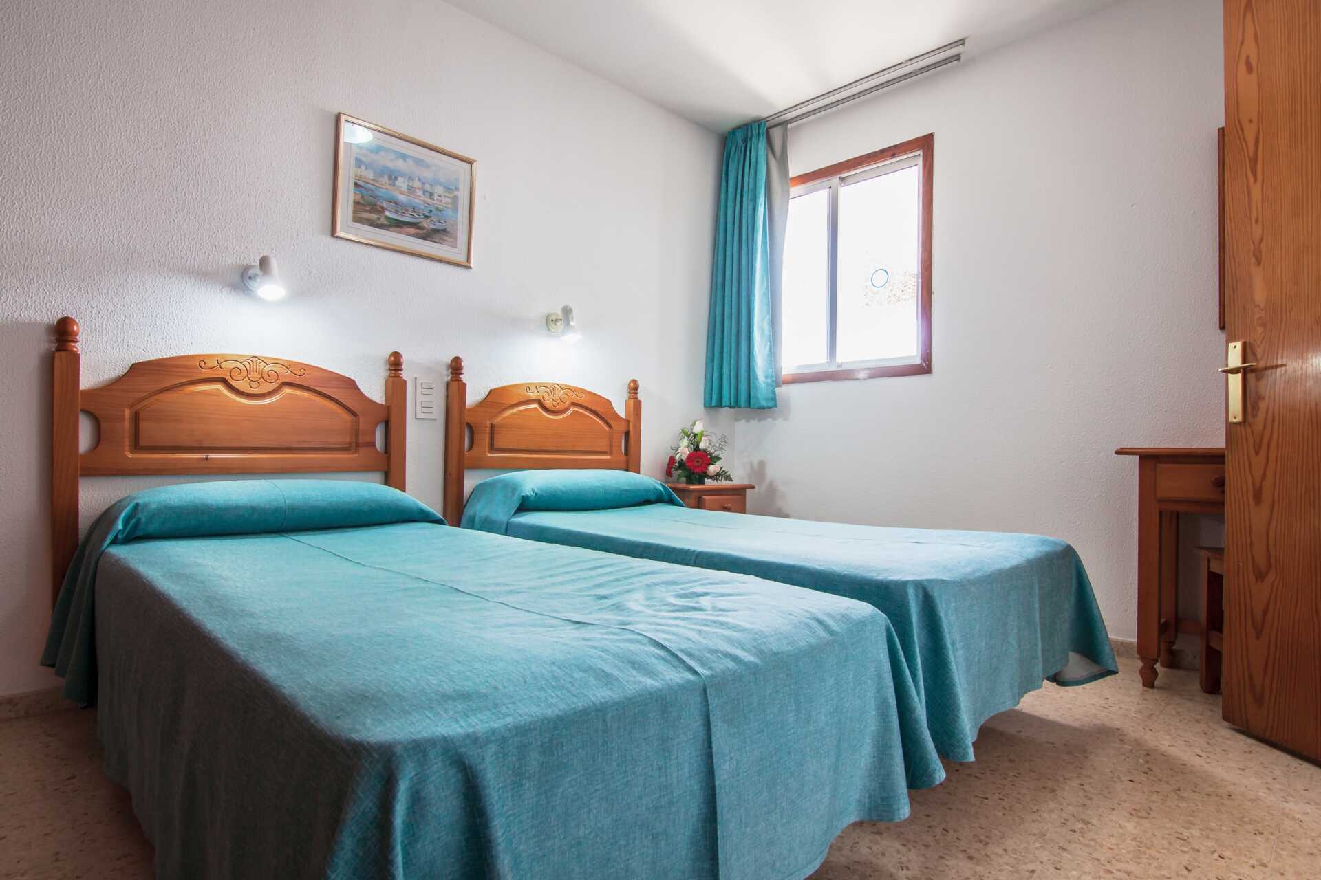 Treromsleilighet med balkong. To soverom og kombinert stue med minikjøkken. To enkeltsenger på hvert soverom. Mulig med en ekstraoppredning i sovesofa. Minikjøkken med kokeplater, kjøleskap og enkelt kjøkkenutstyr. Wifi og safe mot avgift. TV mot avgift. Baderom med badekar eller dusj samt wc. Rengjøring 5 ggr/uke.