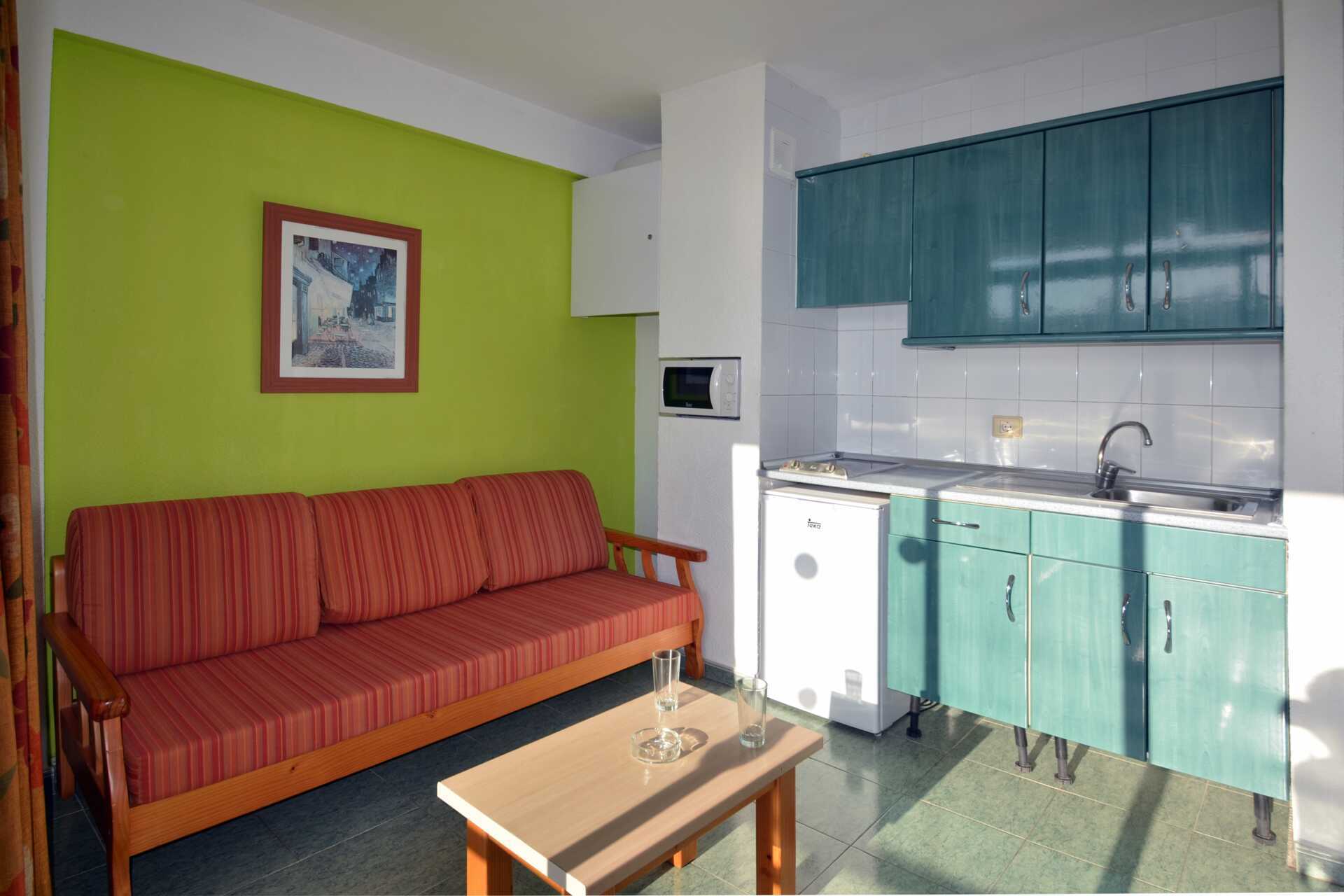 Toromsleilighet med balkong. Et soverom og en stue med minikjøkken. To enkeltsenger. Mulig med ekstraseng i sovesofa. Minikjøkken med kjøleskap, kokeplater, kaffetrakter, vannkoker, brødrister og enkelt kjøkkenutstyr. Wifi og depositum mot avgift. TV. Badekar eller dusj samt wc. Rengjøring 3 ggr/uke.