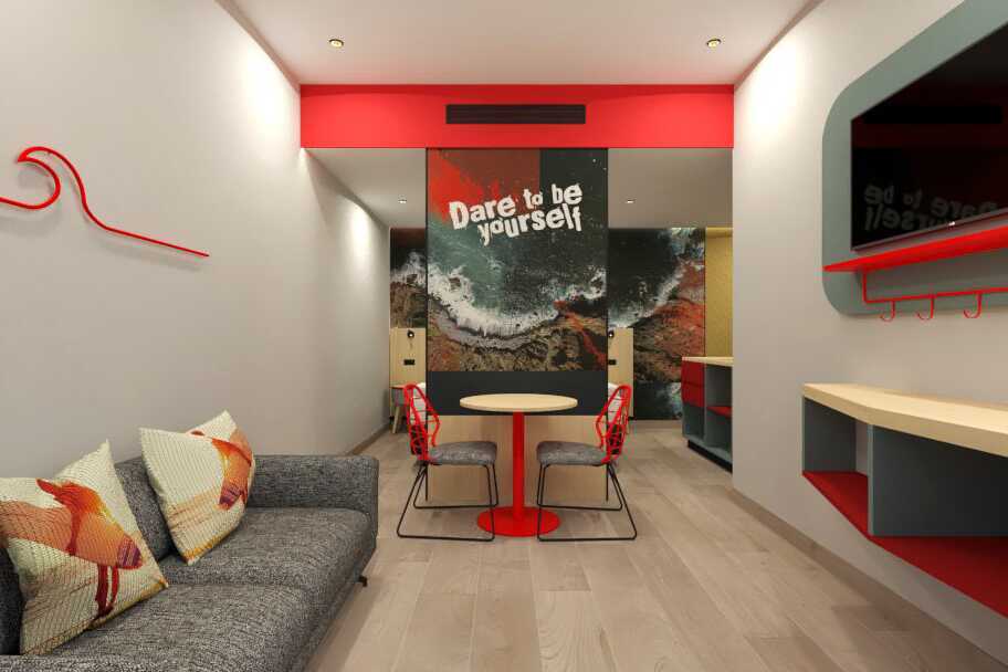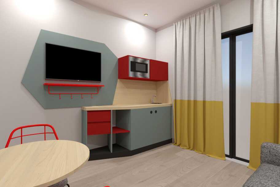 Suite med delt uteplass. Uteplassen har to stoler og et lite bord, og ligger ved en utendørs gangvei/passasje. Suiten består av et soverom og en stue. To enkeltsenger. Mulig med en ekstraseng i sovesofa. Wifi er inkludert. Minibar. Mikrobølgeovn. Dusj og wc. Rengjøring 3 ggr/uke. Barn under 2 år regnes inn i maksantallet i rommet.