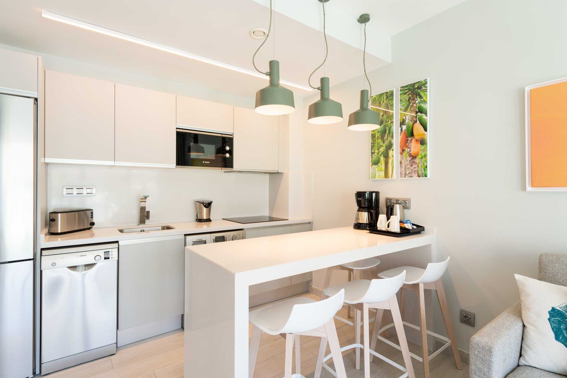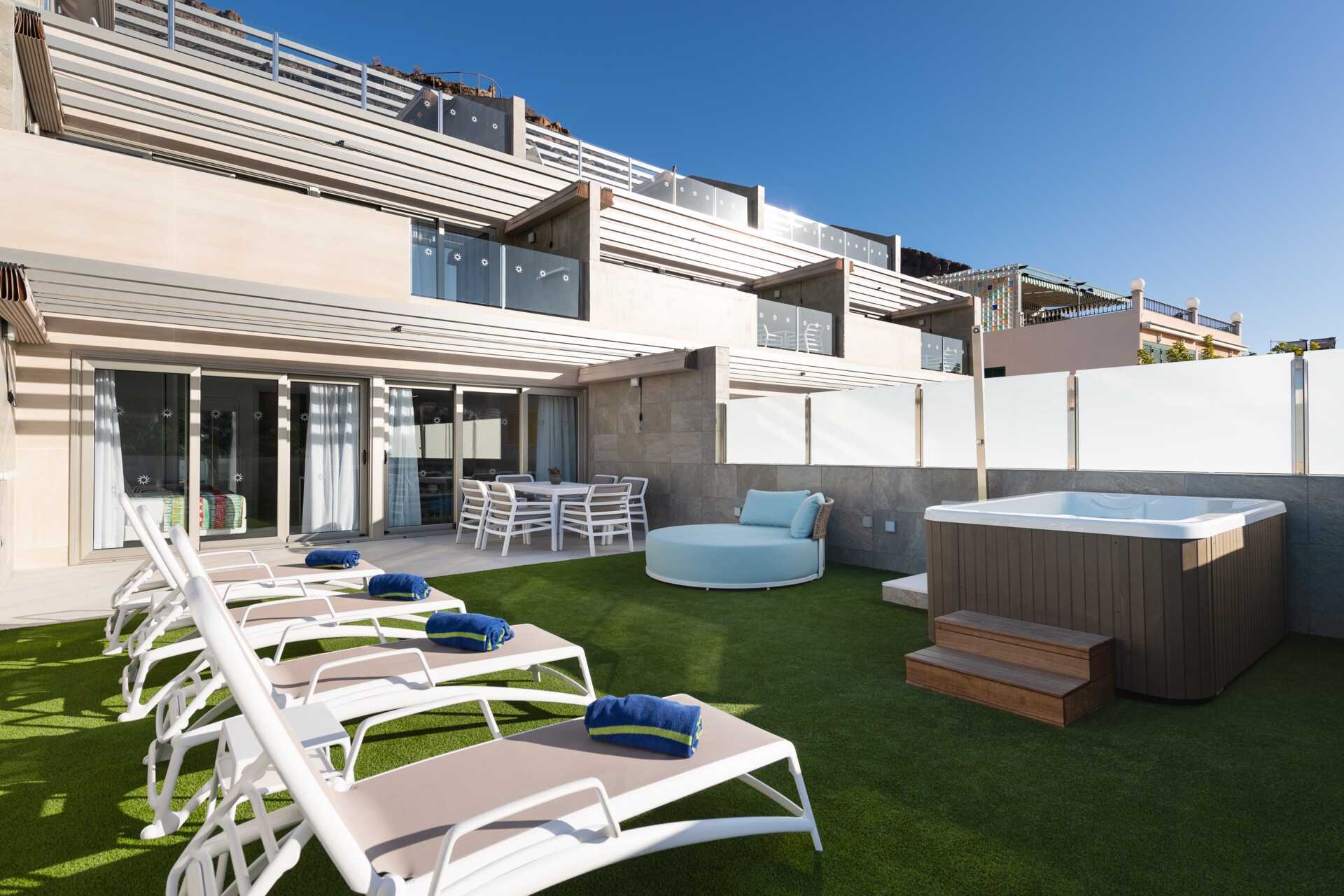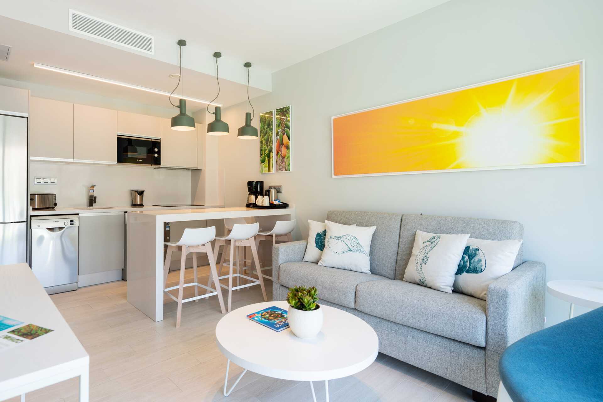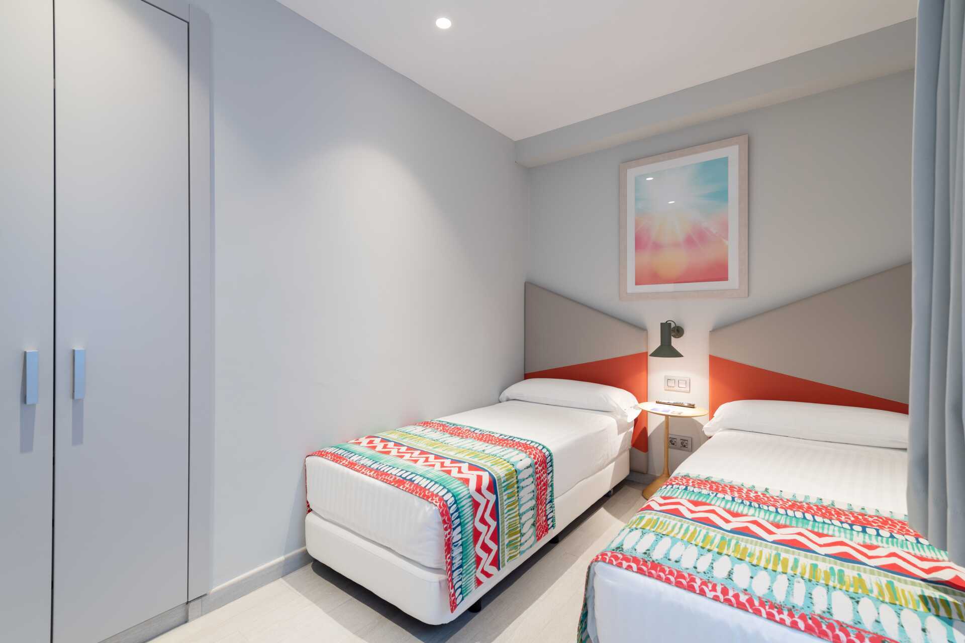 Treromsleilighet med stor terrasse på cirka 65 kvadratmeter, bord og stoler, jacuzzi, solsenger og dusj. To soverom og stue med minikjøkken. To enkeltsenger. Mulig med ekstrasenger i sovesofa. Minikjøkken med kjøleskap, oppvaskmaskin, mikrobølgeovn, kaffetrakter, vannkoker, brødrister og enkelt kjøkkenutstyr. Wifi, luftkondisjonering og safe inkludert. TV. Strykejern og strykebrett. Vaskemaskin og tørketrommel. Hårføner. Dusj og wc. Rengjøring 7 ggr/uke.
