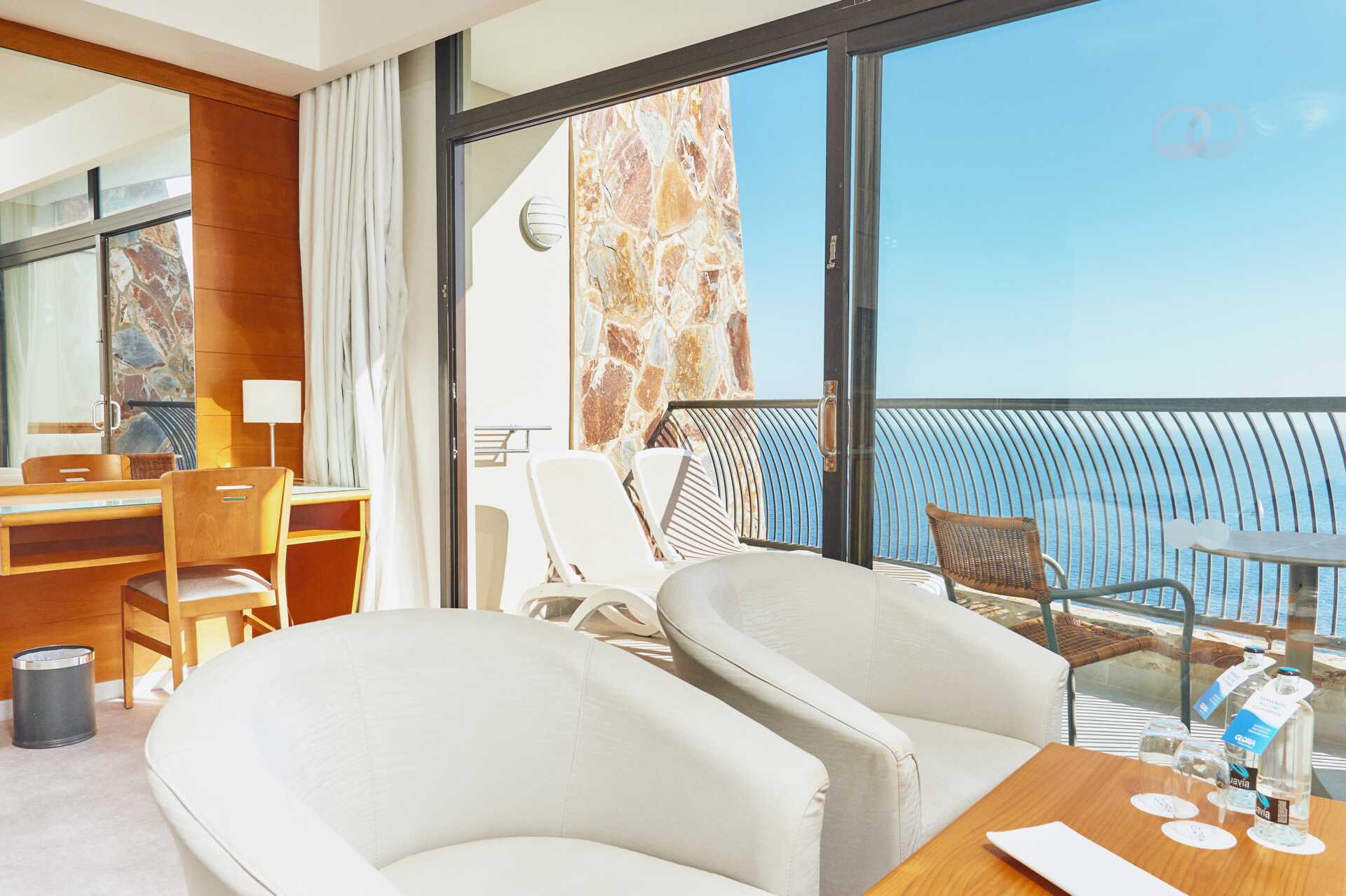 Toromssuite med balkong og havutsikt. Suiten består av en stue og et soverom. Det er solsenger på balkongen. En dobbeltseng og en enkeltseng. Wifi og luftkondisjonering inkludert. Safe mot avgift. Minibar. Vannkoker. TV. Bassenghåndklær i suiten ved ankomst. Badekåper og tøfler Hårføner. Badekar eller dusj samt wc. Rengjøring 7 ggr/uke.