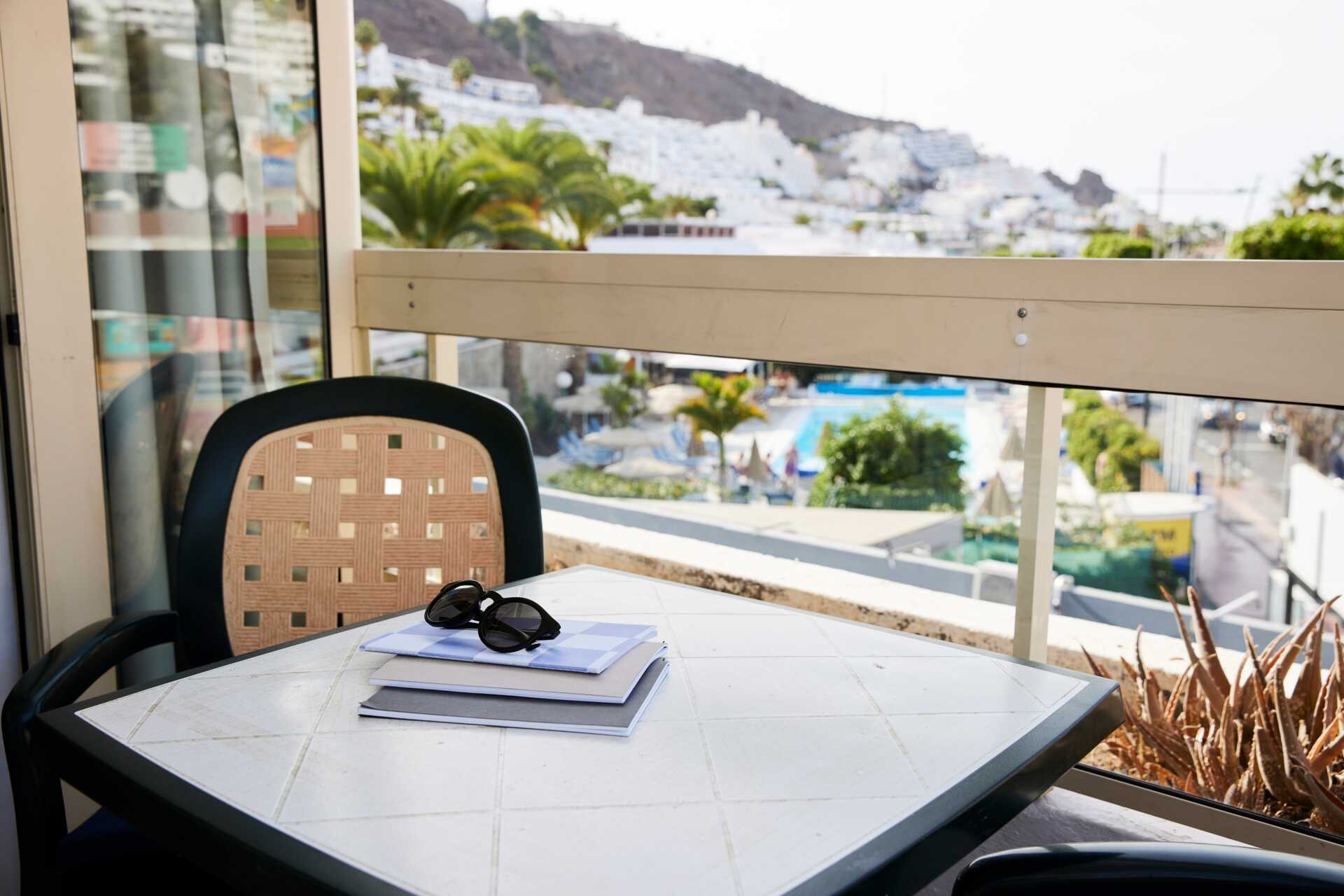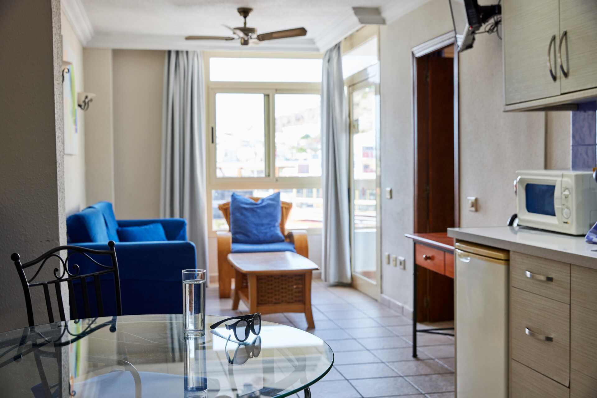 Ettromsleilighet med balkong. Soverom kombinert med minikjøkken. To enkeltsenger. Wifi inkludert. Luftkondisjonering og safe mot avgift. Takvifte. Minikjøkken med kokeplater, mikrobølgeovn, kjøleskap, brødrister, vannkoker, kaffetrakter og enkelt kjøkkenutstyr. TV. Hårføner. Badekåper. Dusj og wc. Rengjøring 5 ggr/uke.