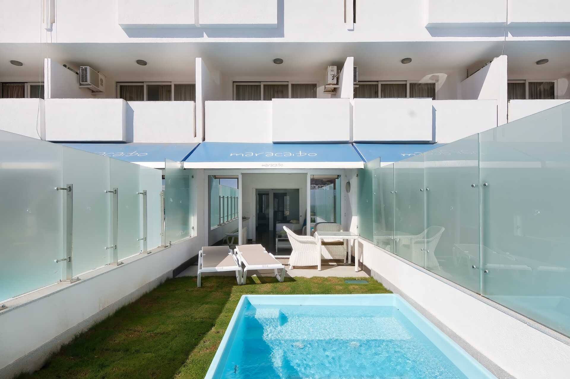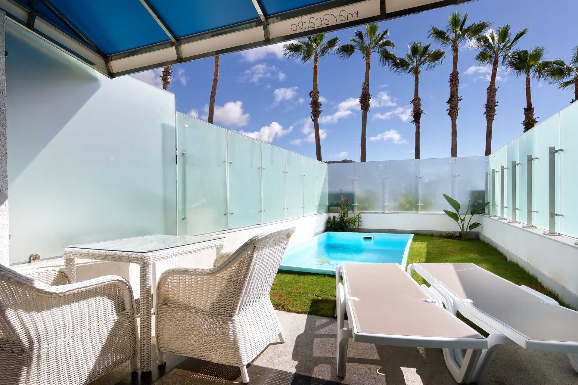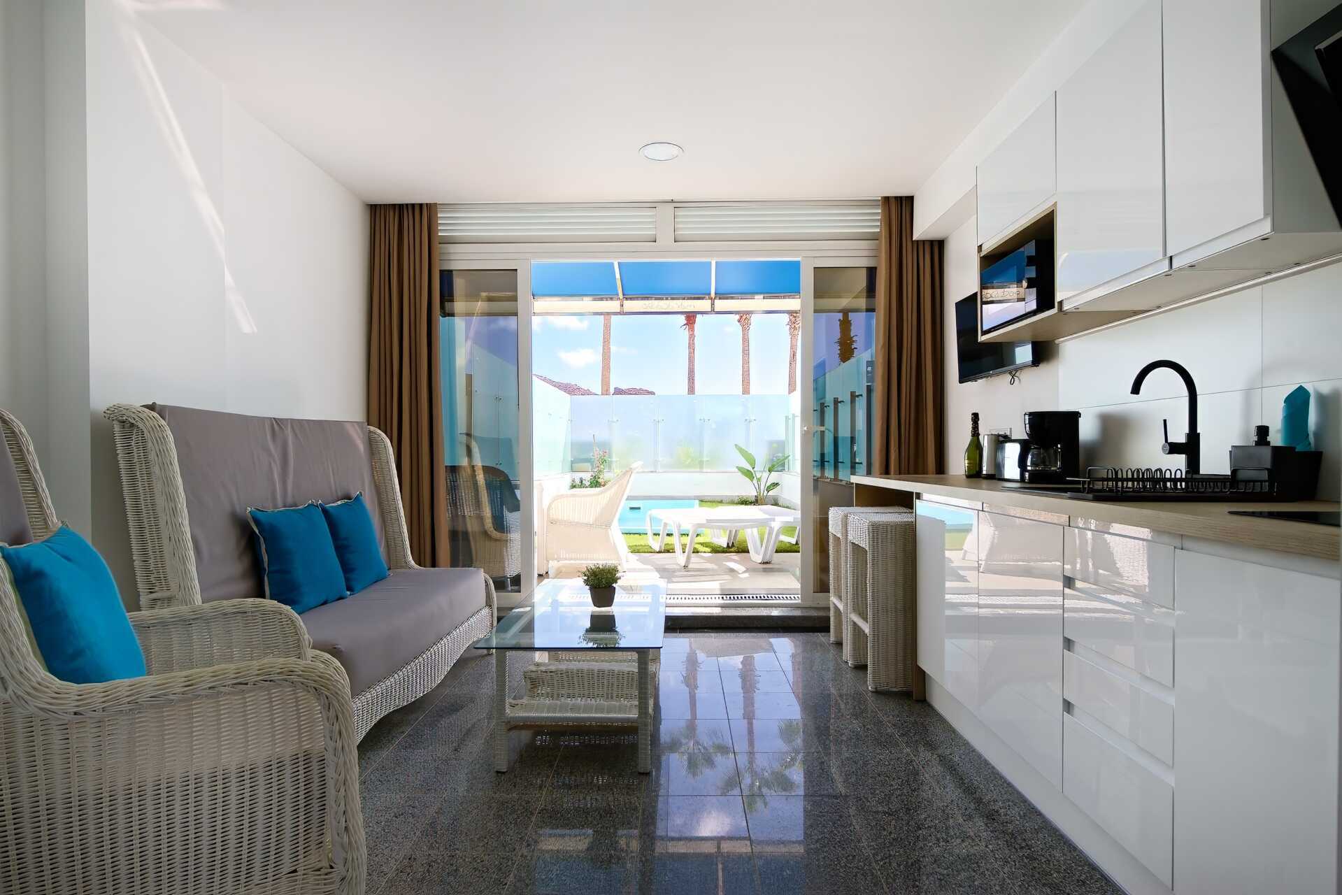 Toromsleilighet deluxe med eget basseng På markterrasse er det to solsenger, bord og lenestoler og en liten gressplen. Et soverom og en stue med minikjøkken. En dobbeltseng. Minikjøkken med kokeplater, kjøleskap, brødrister, kaffetrakter, vannkoker, mikrobølgeovn og enkelt kjøkkenutstyr. Spiseområdet kan være ved bardisken. Wifi, luftkondisjonering og safe inkludert. TV. Badekåper. Hårføner. Dusj og wc. Rengjøring 7 ggr/uke.