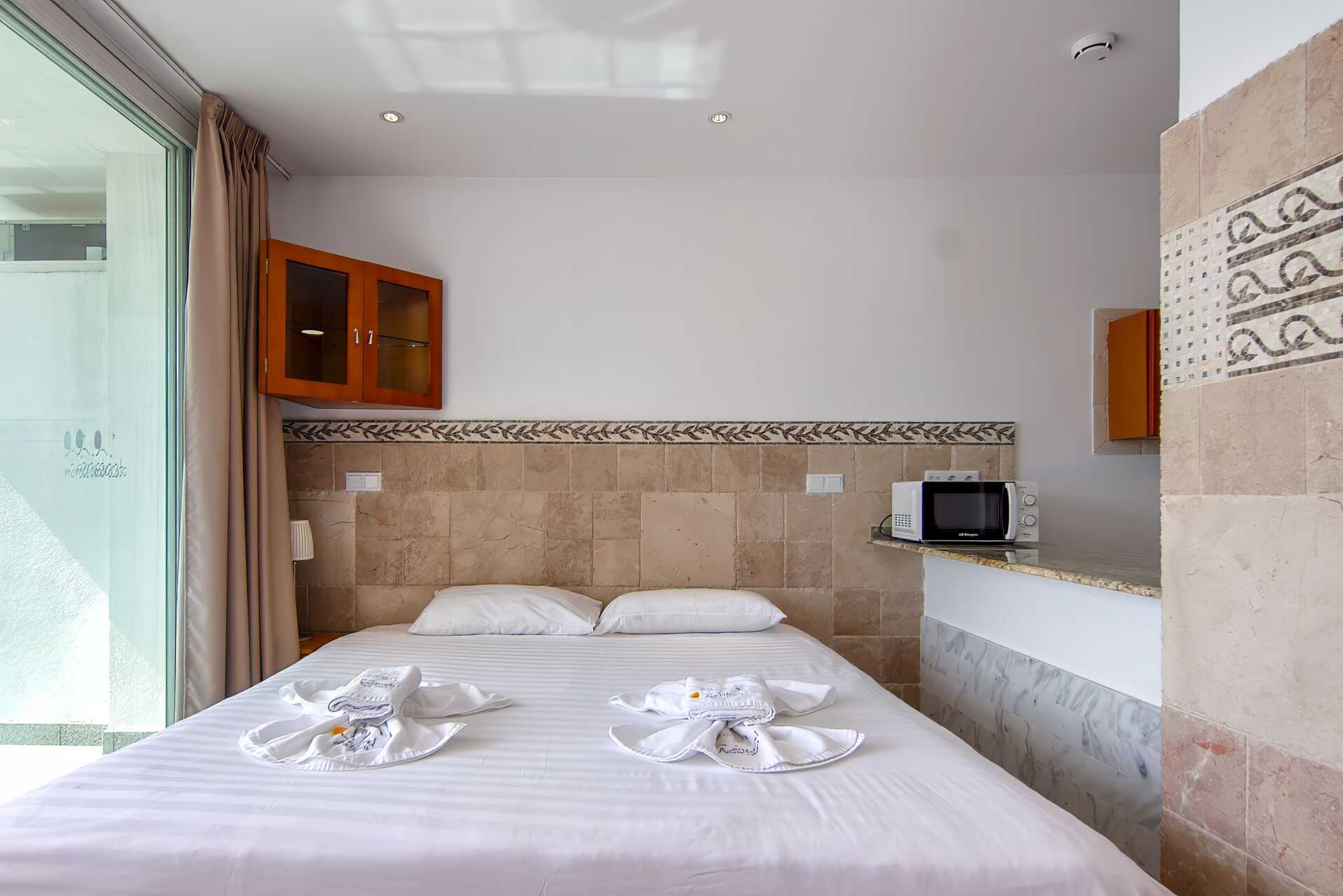 Ettromsleilighet deluxe med balkong og havutsikt. Leilighetene ligger i femte etasje. Soverom kombinert med minikjøkken. En dobbeltseng. Minikjøkken med kokeplater, kjøleskap, brødrister, kaffetrakter, vannkoker, mikrobølgeovn og enkelt kjøkkenutstyr. Noen leiligheter har spiseplass ved bardisk. Wifi, luftkondisjonering og safe inkludert. TV. Hårføner. Dusj og wc. Rengjøring 7 ggr/uke.