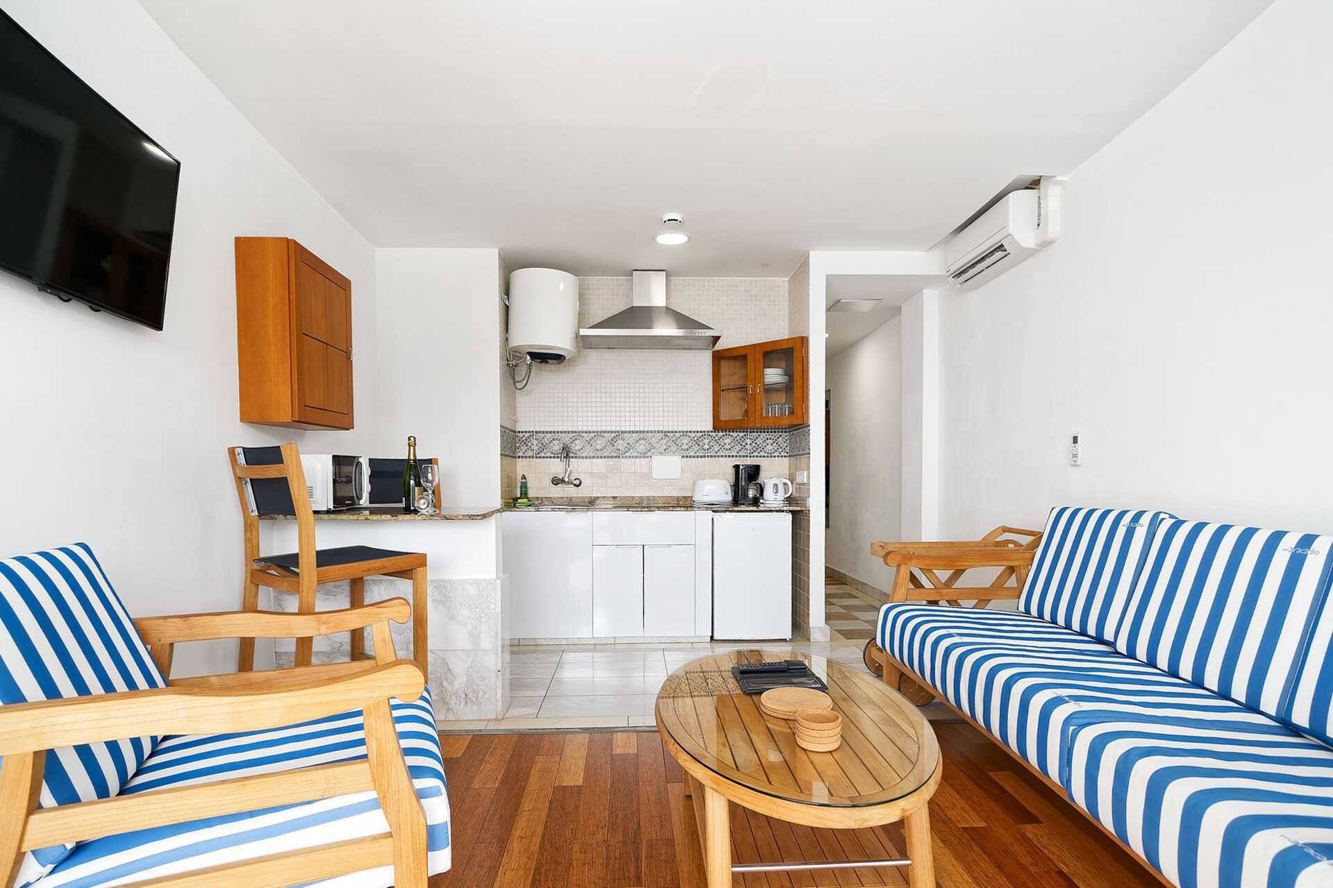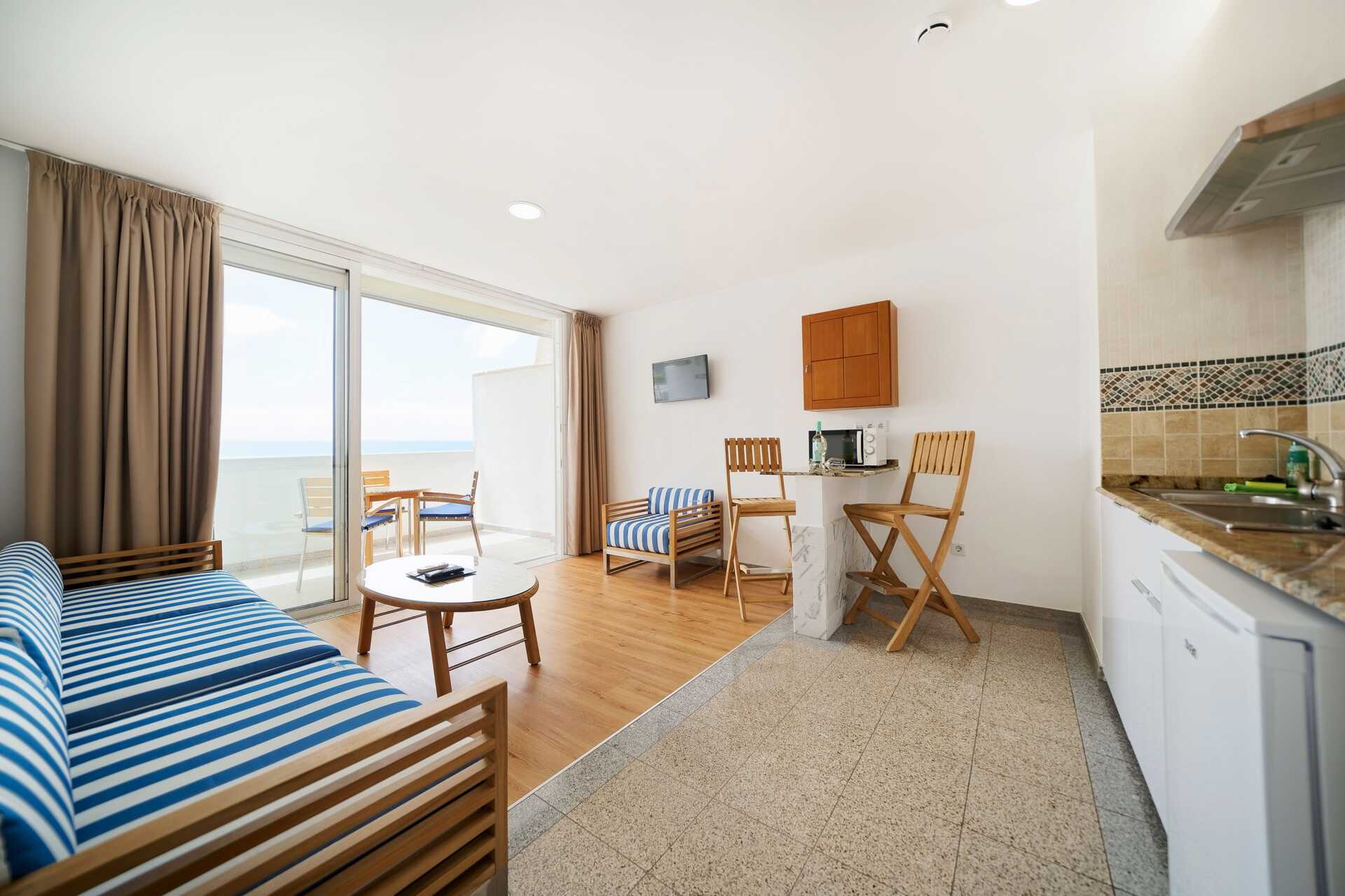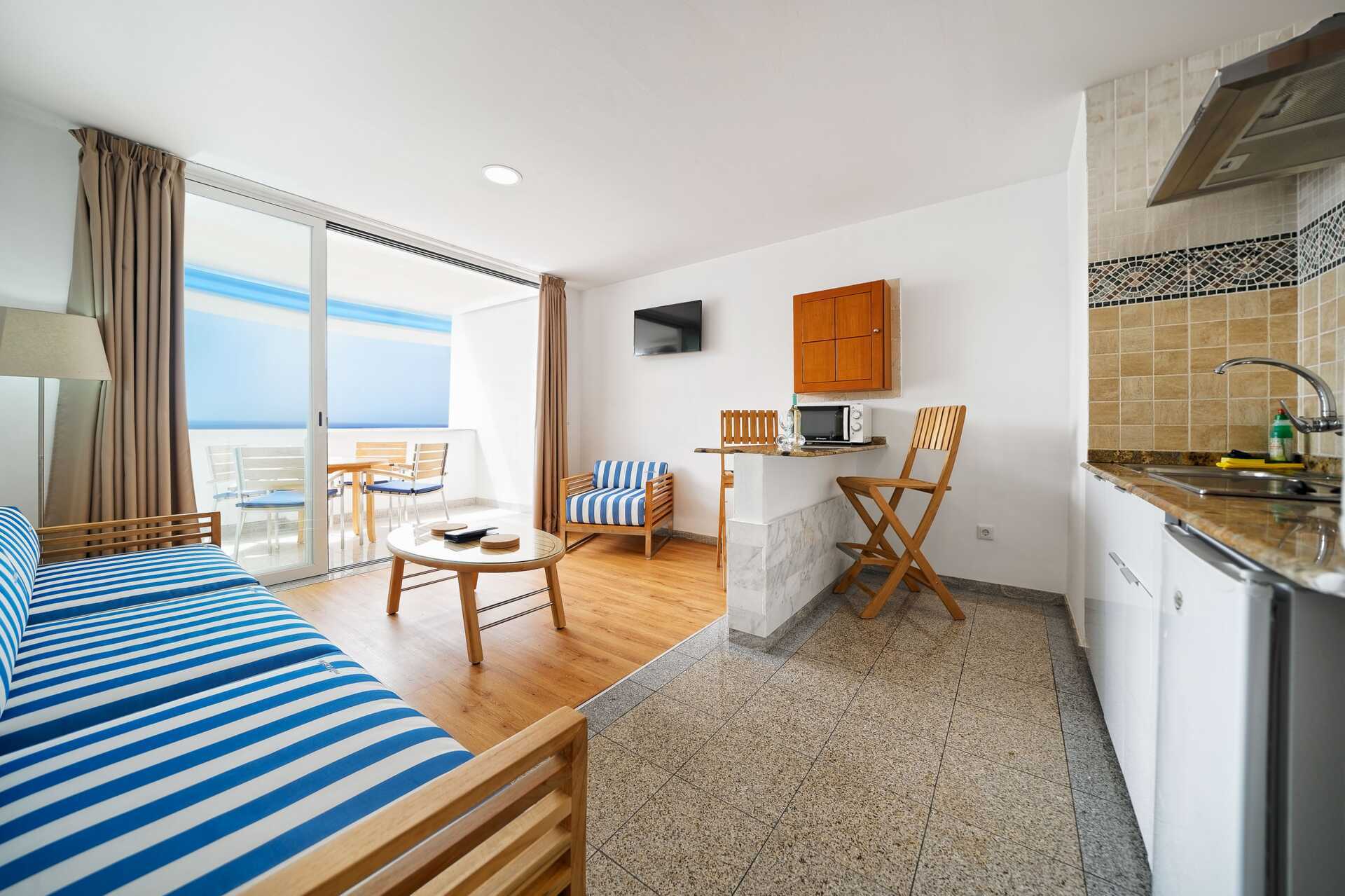 Toromsleilighet deluxe med balkong og havutsikt. Leilighetene ligger i femte etasje. Et soverom og en stue med minikjøkken. En dobbeltseng eller to enkeltsenger. Mulighet med ekstraseng i sovesofa. Minikjøkken med kokeplater, kjøleskap, brødrister, kaffetrakter, vannkoker, mikrobølgeovn og enkelt kjøkkenutstyr. Noen leiligheter har spiseplass ved bardisk. Wifi, luftkondisjonering og safe inkludert. TV. Hårføner. Dusj og wc. Rengjøring 7 ggr/uke.
