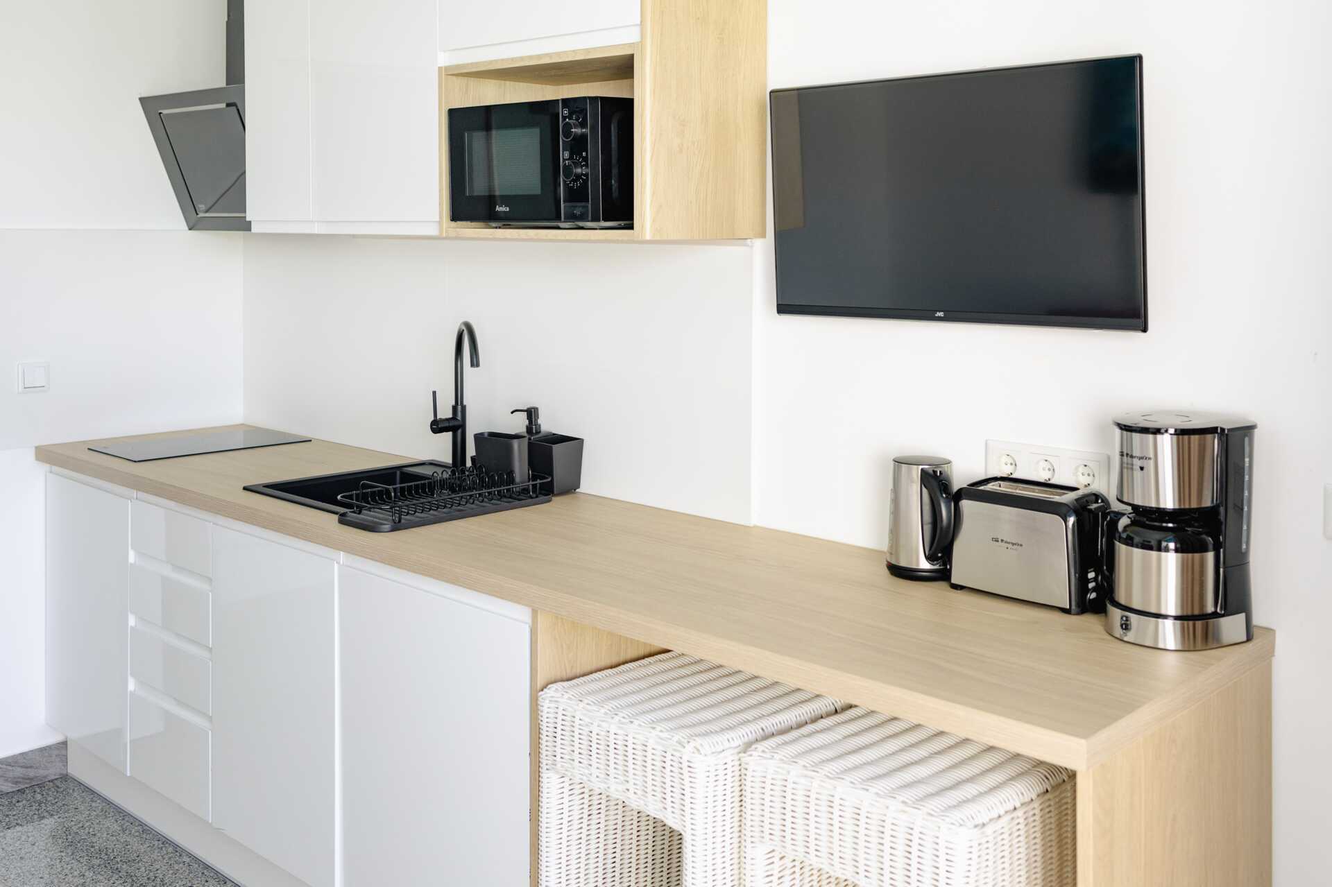 Toromsleilighet med balkong, noen med havutsikt eller begrenset havutsikt. Et soverom og en stue med minikjøkken. Toromsleilighetene med markterrasse har et soverom, men det er ingen dør mellom soverommet og stuen. En dobbeltseng eller to enkeltsenger. Minikjøkken med kokeplater, kjøleskap, brødrister, kaffetrakter, vannkoker, mikrobølgeovn og enkelt kjøkkenutstyr. Noen leiligheter har spiseplass ved bardisk. Wifi inkludert. Luftkondisjonering og safe mot avgift. TV. Hårføner. Dusj og wc. Rengjøring 5 ggr/uke.