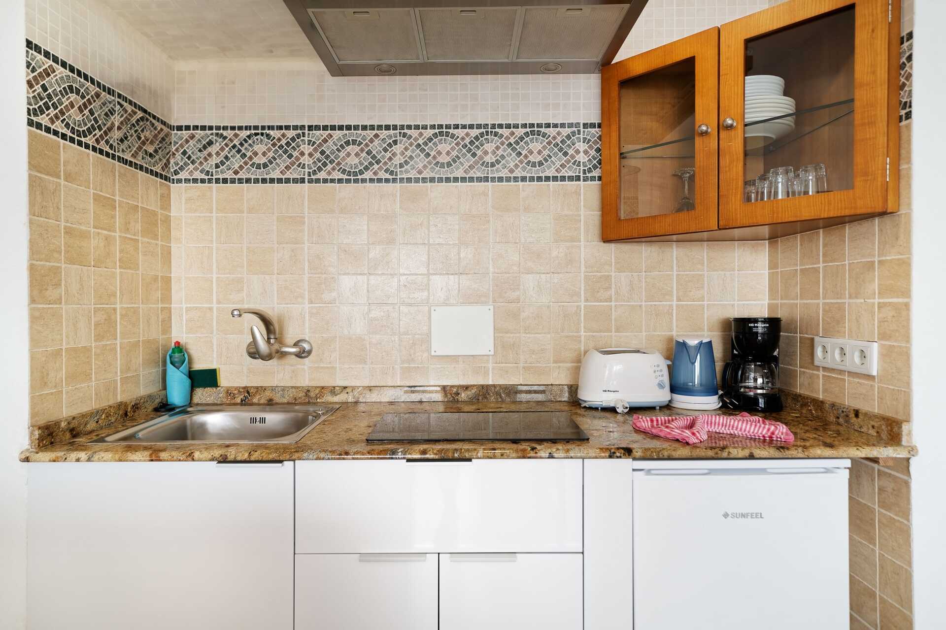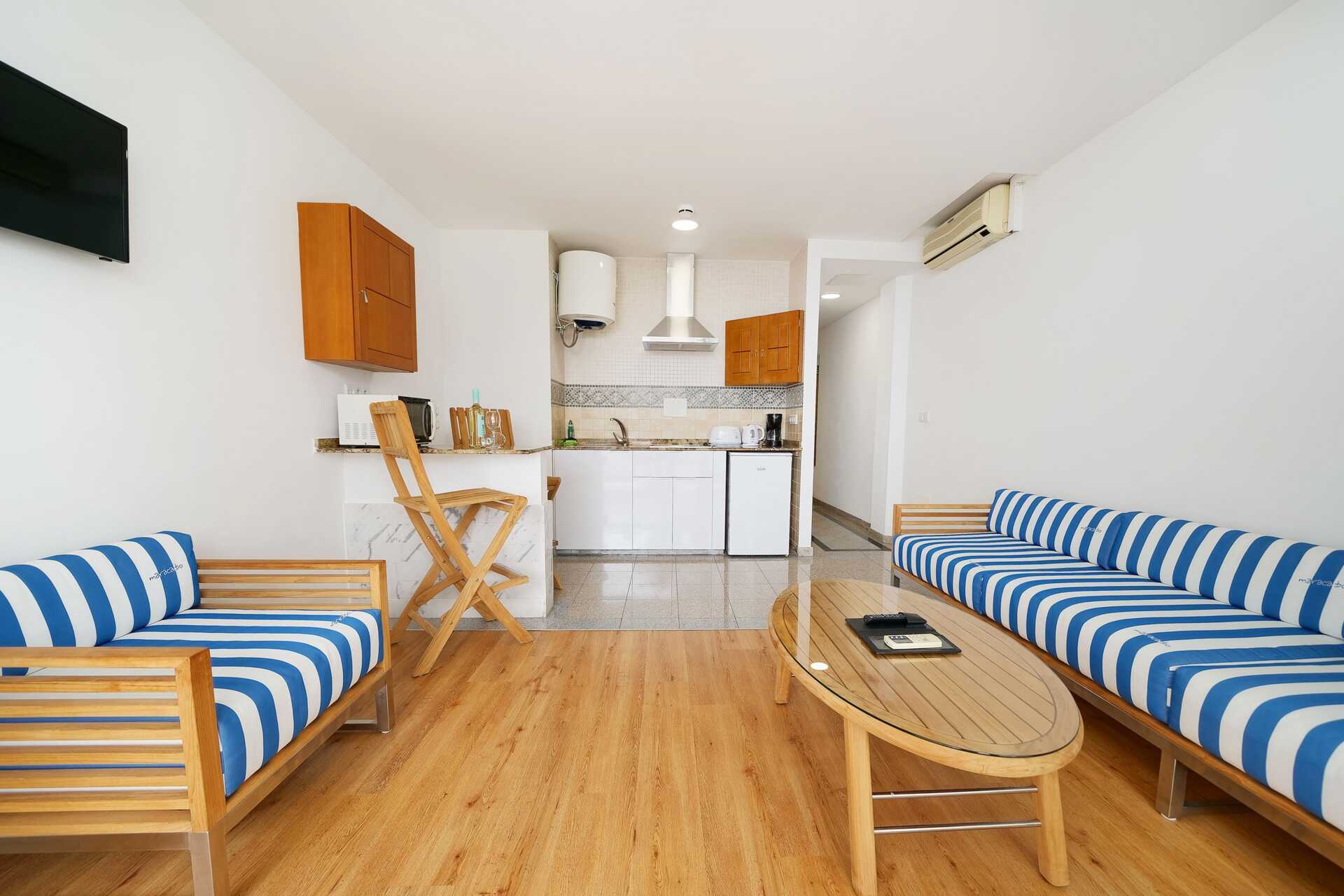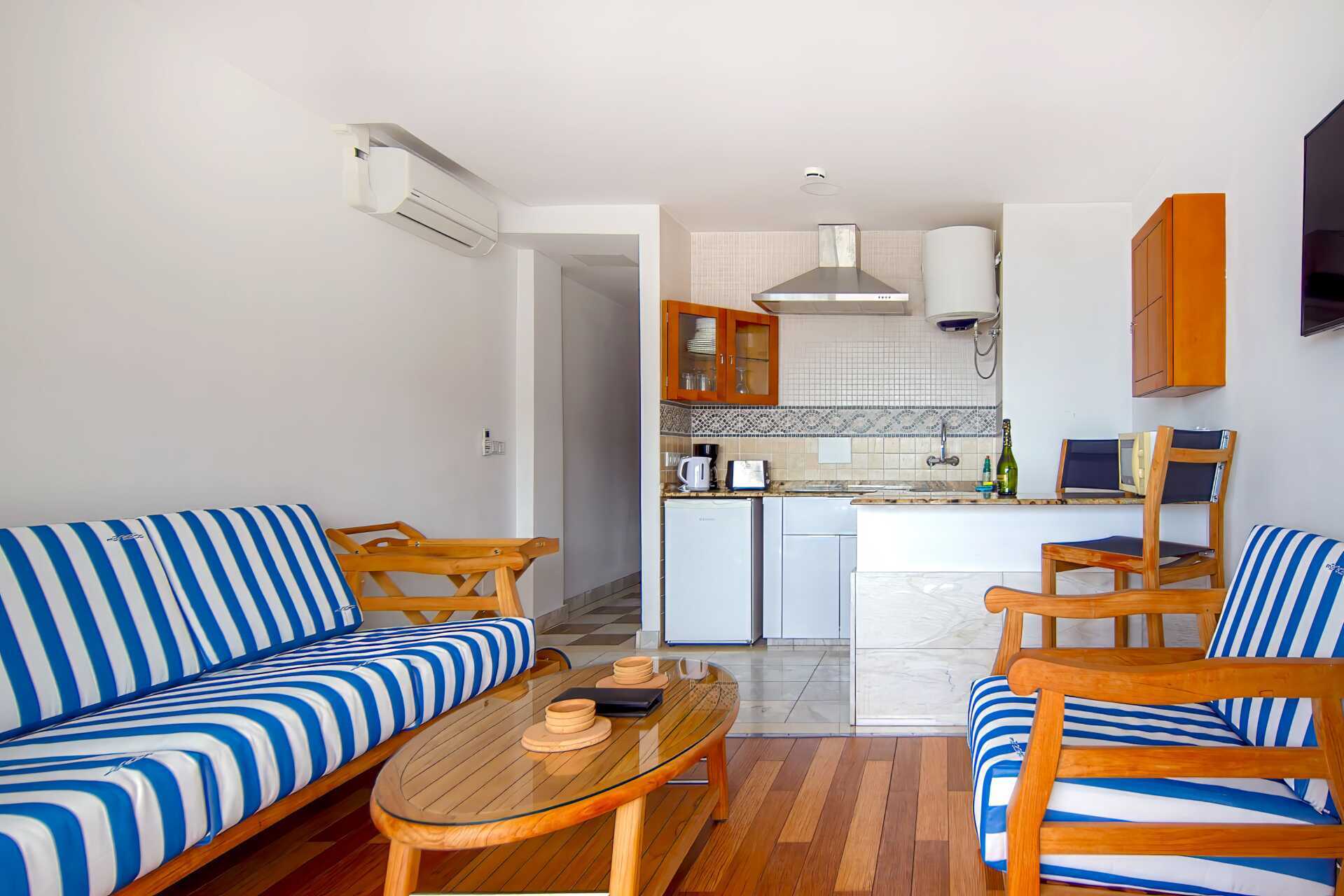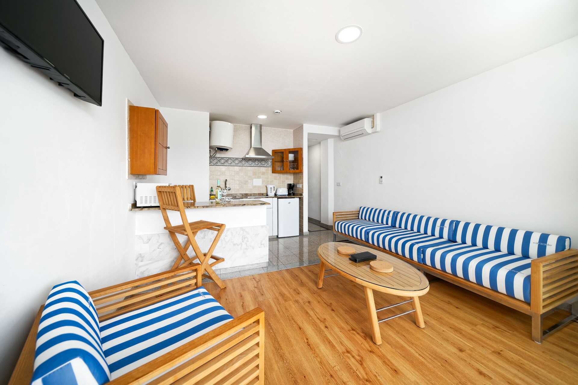 Treromsleilighet med balkong, noen med begrenset havutsikt eller med havutsikt. To soverom, hvorav det ene er mindre enn det andre, samt kombinert stue med minikjøkken. Et soverom med dobbeltseng og et soverom med to enkeltsenger. Mulig med ekstraseng i sovesofa. Minikjøkken med kokeplater, kjøleskap, brødrister, kaffetrakter, vannkoker, mikrobølgeovn og enkelt kjøkkenutstyr. Noen leiligheter har spiseplass ved bardisk. Wifi inkludert. Luftkondisjonering og safe mot avgift. TV. Hårføner. Dusj og wc. Rengjøring 5 ggr/uke.
