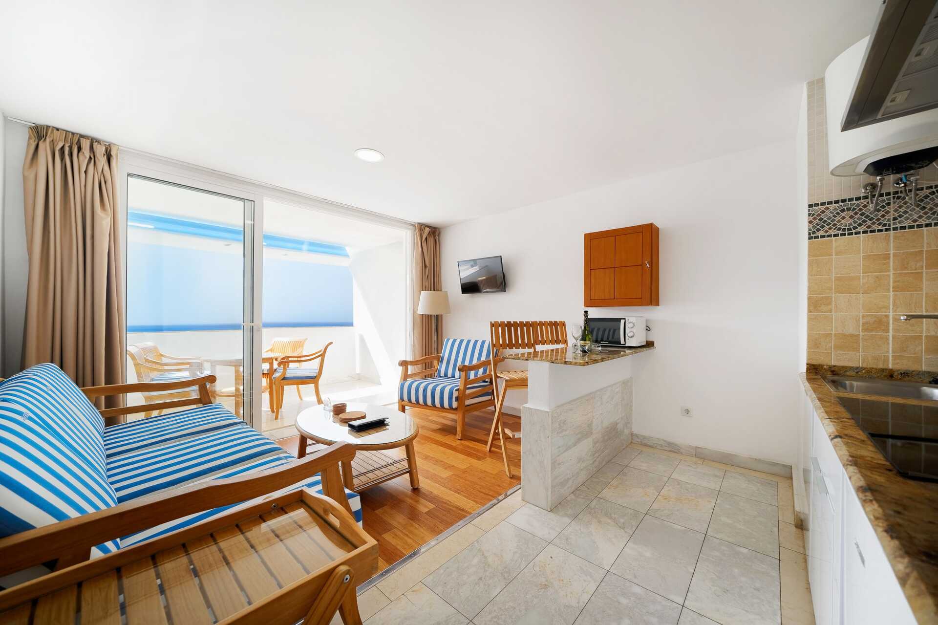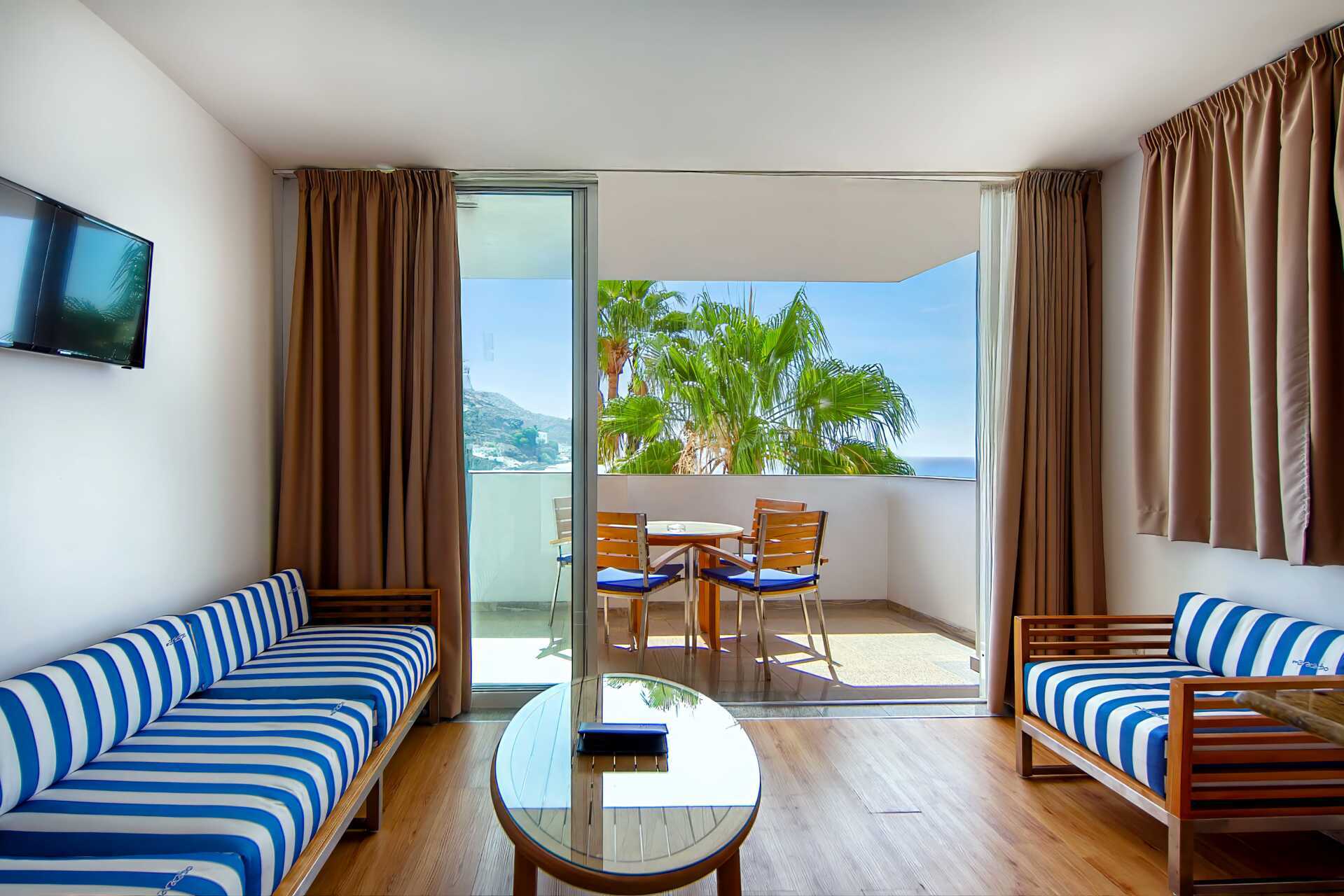 Treromsleilighet superior med balkong og havutsikt. Leilighetene ligger i andre, tredje eller fjerde etasje. To soverom og en stue med minikjøkken. Et soverom med dobbeltseng og et soverom med to enkeltsenger. Mulighet med ekstraseng i sovesofa. Minikjøkken med kokeplater, kjøleskap, brødrister, kaffetrakter, vannkoker, mikrobølgeovn og enkelt kjøkkenutstyr. Noen leiligheter har spiseplass ved bardisk. Wifi og luftkondisjonering er inkludert. Safe mot avgift. TV. Hårføner. Dusj og wc. Rengjøring 6 ggr/uke.