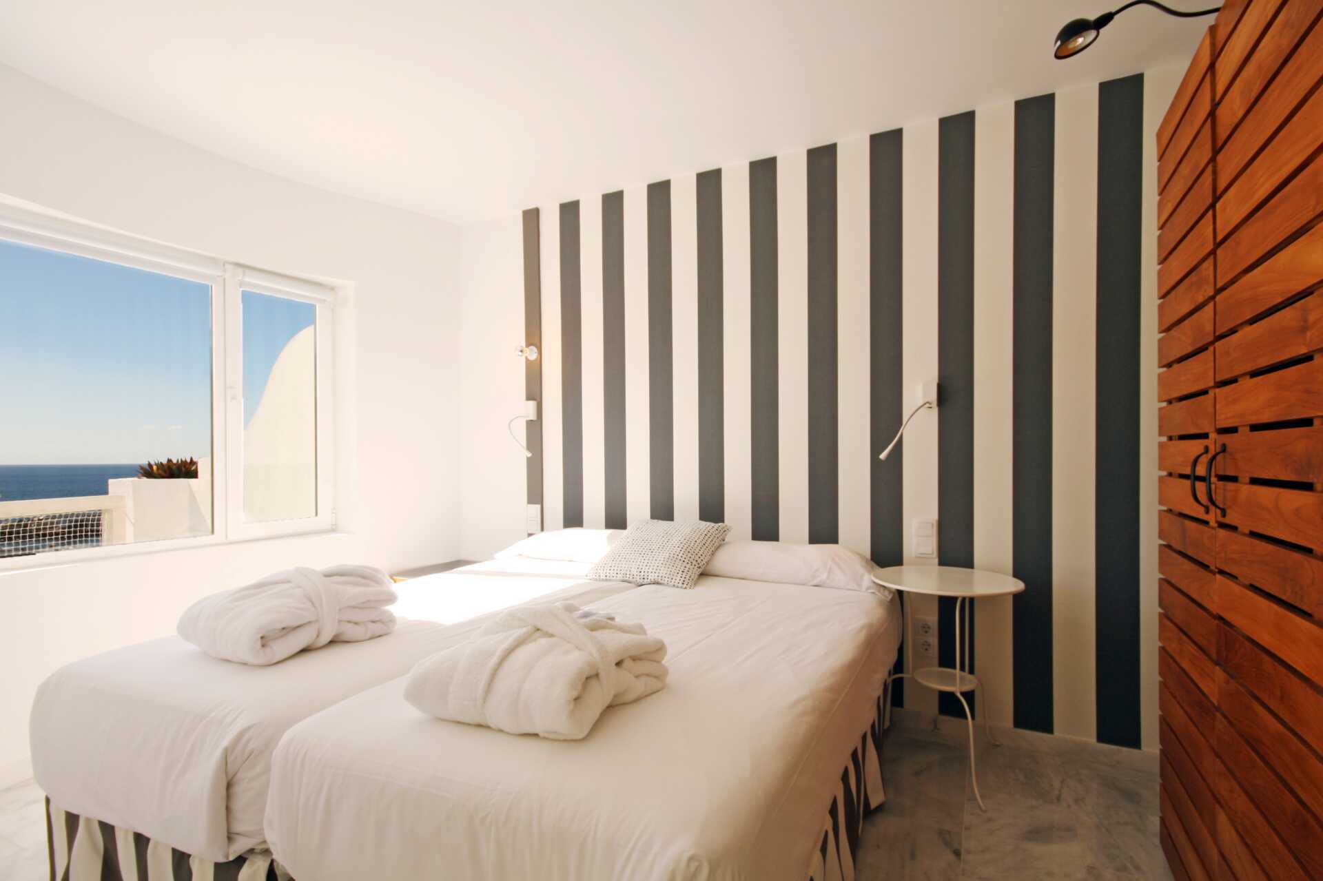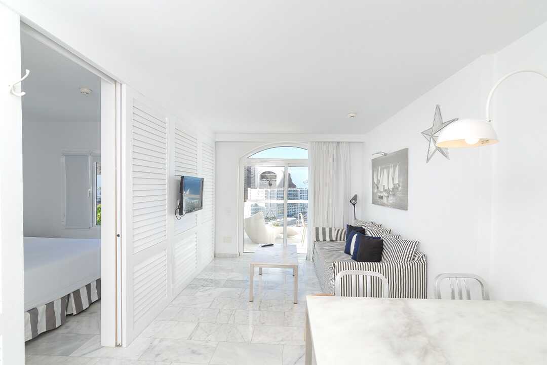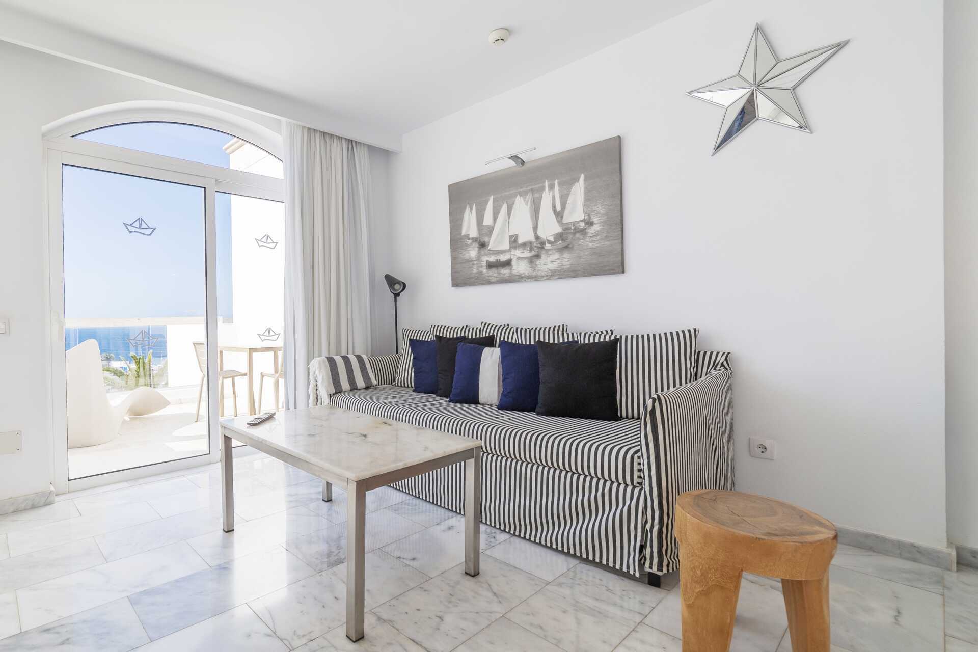 Toromsleilighet med balkong eller terrasse, og begrenset havutsikt. Noen leiligheter er i etasje. Solsenger på terrassen og en rolig, solrik beliggenhet som er hotellets beste. Et soverom og stue med minikjøkken. To enkeltsenger. Mulig med ekstraseng i sovesofa. Minikjøkken med kokeplater, kjøleskap, brødrister, kaffetrakter, vannkoker og enkelt kjøkkenutstyr. Wifi og luftkondisjonering er inkludert. Safe mot avgift. TV. Badekåper og tøfler. Hårføner. Dusj og wc. Rengjøring 5 ggr/uke.