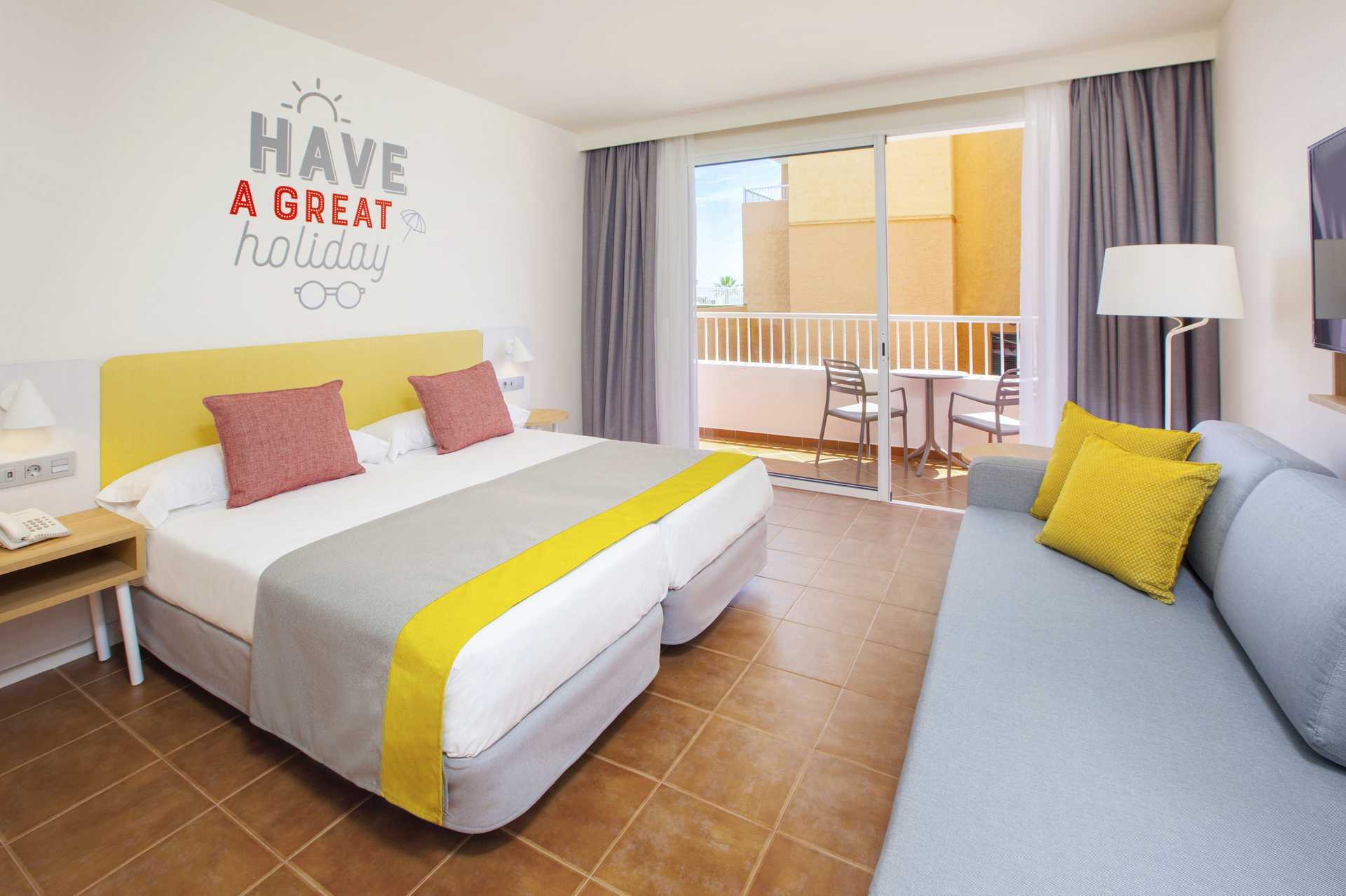 Familierom med balkong eller terrasse. Rommene med terrasse har et leketelt for barn på rommet. To enkeltsenger. Mulig med ekstrasenger i sovesofa. Wifi og luftkondisjonering inkludert. Safe mot avgift. Minibar mot avgift. Vannkoker. TV. Hårføner. Dusj og wc. Rengjøring 7 ggr/uke. Barn under 2 år regnes inn i maksantallet i rommet.