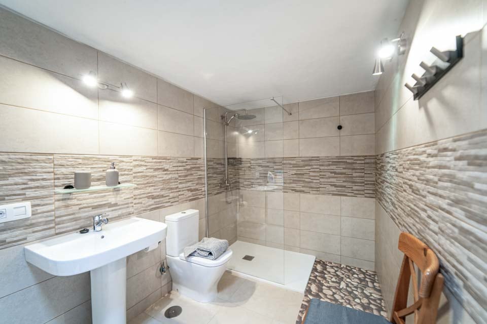 For å komme til villaen er det en 80 cm bred sti langs ett trinn. Uteområdet ligger i en liten stigning, men er fortsatt tilgjengelig. Inngangsdøren har en bredde på 80 cm, mens døren til terrassen er 130 cm bred. Terrassen er åpen og flislagt. Det er ett trinn fra stuen til uteplassen. Selve bassenget har trinntilgang. I første etasje har både soverom og bad en dørbredde på 70 cm. Det er 18 trinn opp til første etasje. Døren inn til kjøkken/spisestue er 75 cm bred, og døren inn til stuen er også 94 cm bred. Det er to trinn opp til spisestuen. *Vær oppmerksom på at selv om vi har gjort vårt ytterste for å sikre at informasjonen som gis er nøyaktig, kan det forekomme feil. Hvis du trenger mer spesifikk informasjon om villaen, ikke nøl med å kontakte oss.