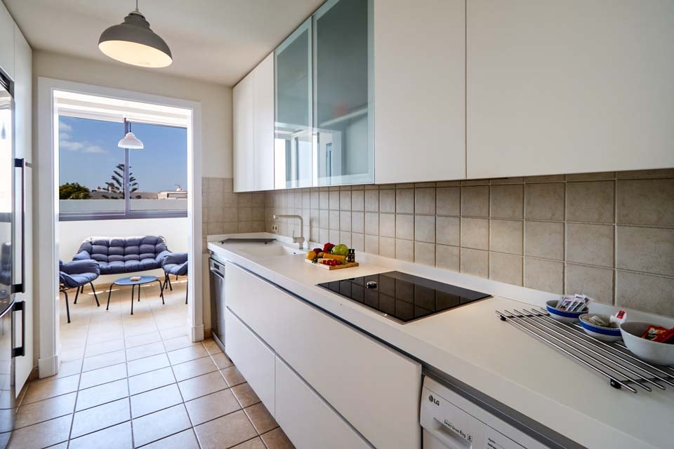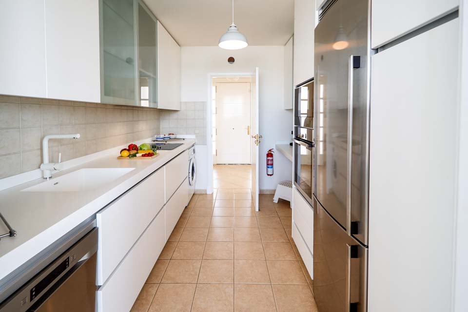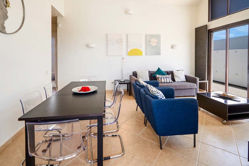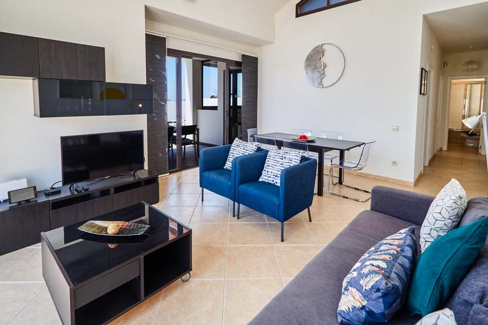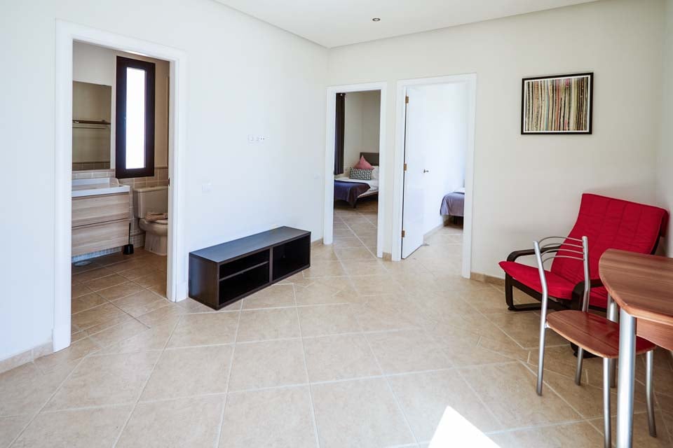 Når du kommer inn i Casa Santuario kommer du til den romslige gangen, og herfra har du tilgang til stue, kjøkken og alle soverom og bad. Loungen fanget virkelig oppmerksomheten vår! Med høyt under taket og store terrassedører ut til terrassen er dette virkelig et fantastisk sted. Med komfortable sitteplasser og en flatskjerm-TV med flere kanaler, kan du slappe av både inne og ute på ferien. Rett utenfor gangen finner du også kjøkkenet, som er fullt utstyrt og har et stort kjøleskap/fryser, vaskemaskin og oppvaskmaskin.