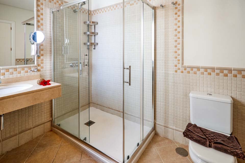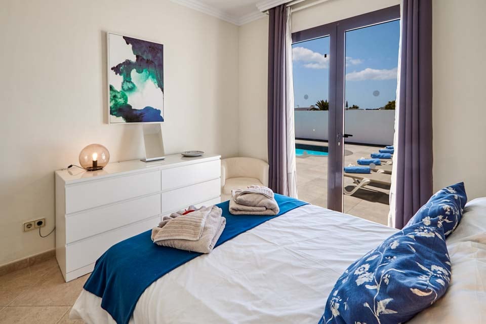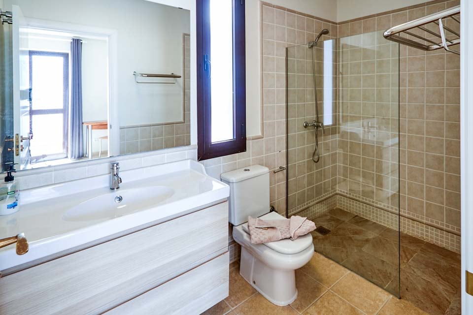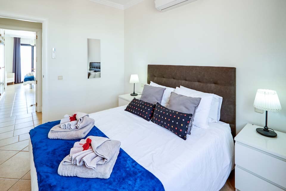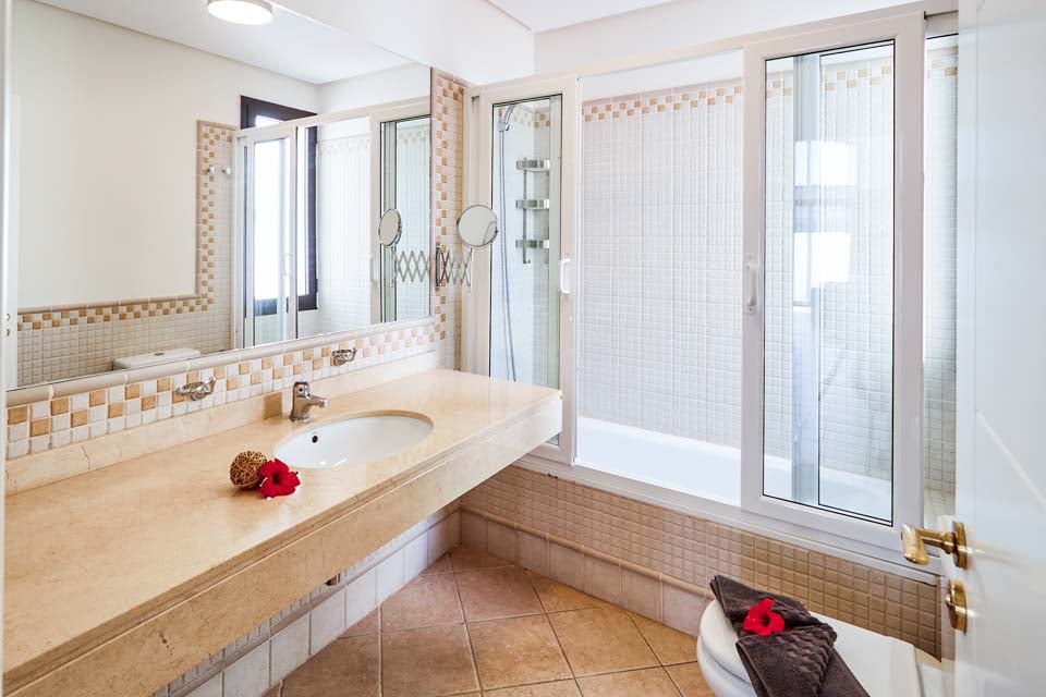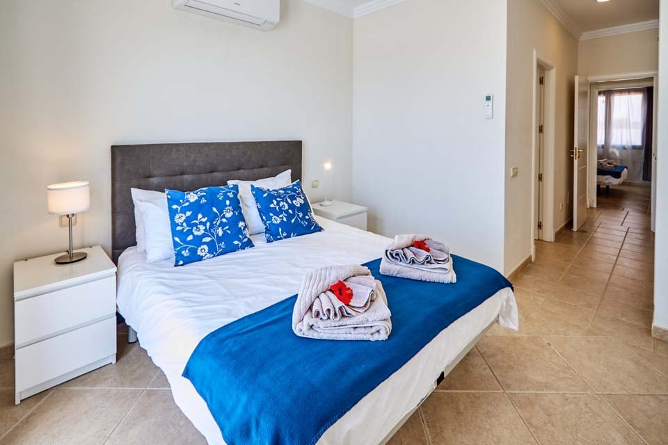 Det er totalt fire soverom, to med king-size-senger og to med enkeltsenger, alle med klimaanlegg*. Hovedsoverommet har også eget dusjrom og dører til terrassen. De tre andre soverommene deler to separate bad, ett med badekar og ett med dusj.