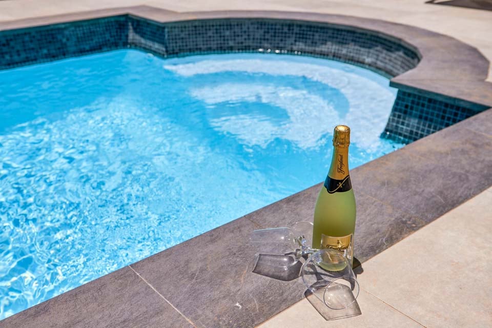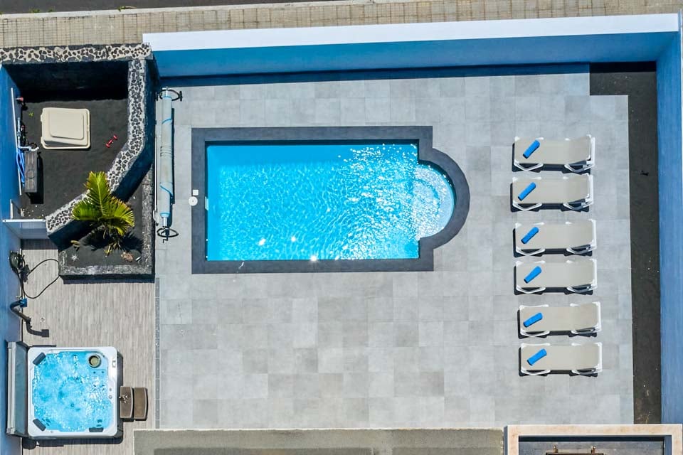 Bassengstørrelse: 6,5m x 3,5m, oppvarmet, dusj ved bassengkanten, romerske trapper