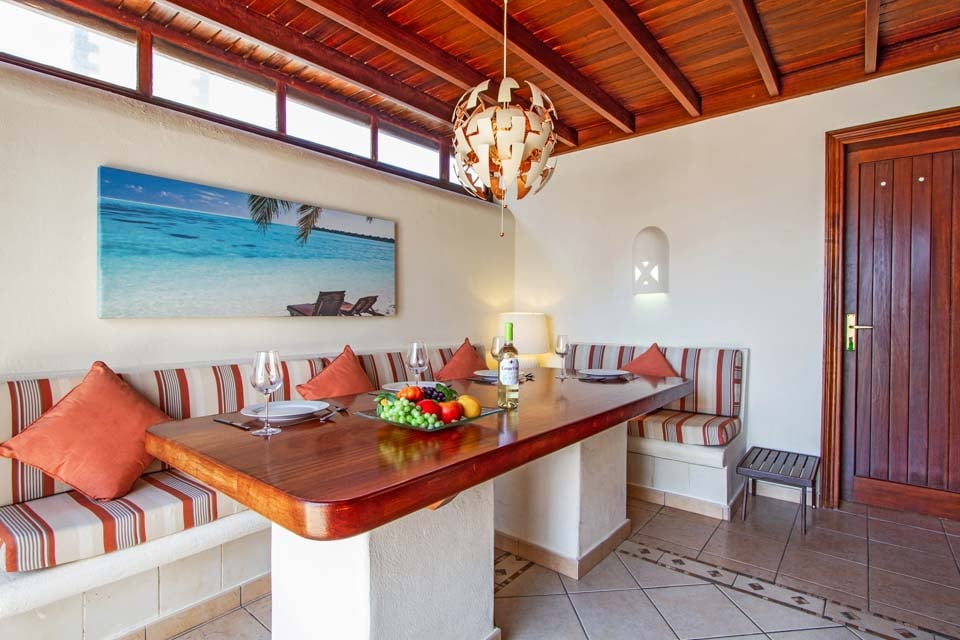 Solterrassen er det vi forestiller oss når vi tenker på et idyllisk tilfluktssted, oversådd med solsenger og omgitt av vulkansk svart sand. De som søker skygge vil finne trøst under verandaen, med et sett med komfortable stoler som er perfekte for å slappe av med en god bok. Hvis du har lyst på middag mens du nyter den varme sjøluften, sørger utendørs spisebordet og utendørs grillsettet for den perfekte kveldssettingen. Uteplassen vil underholde alle, og du vil garantert ta et dykk i det nyreformede utendørsbassenget. Som en ekstra bonus er det forfriskende bassenget oppvarmet gratis hele året. Som en ekstra bonus tilbyr denne villaen en gratis velkomstpakke med te, kaffe og kjeks ved ankomst.