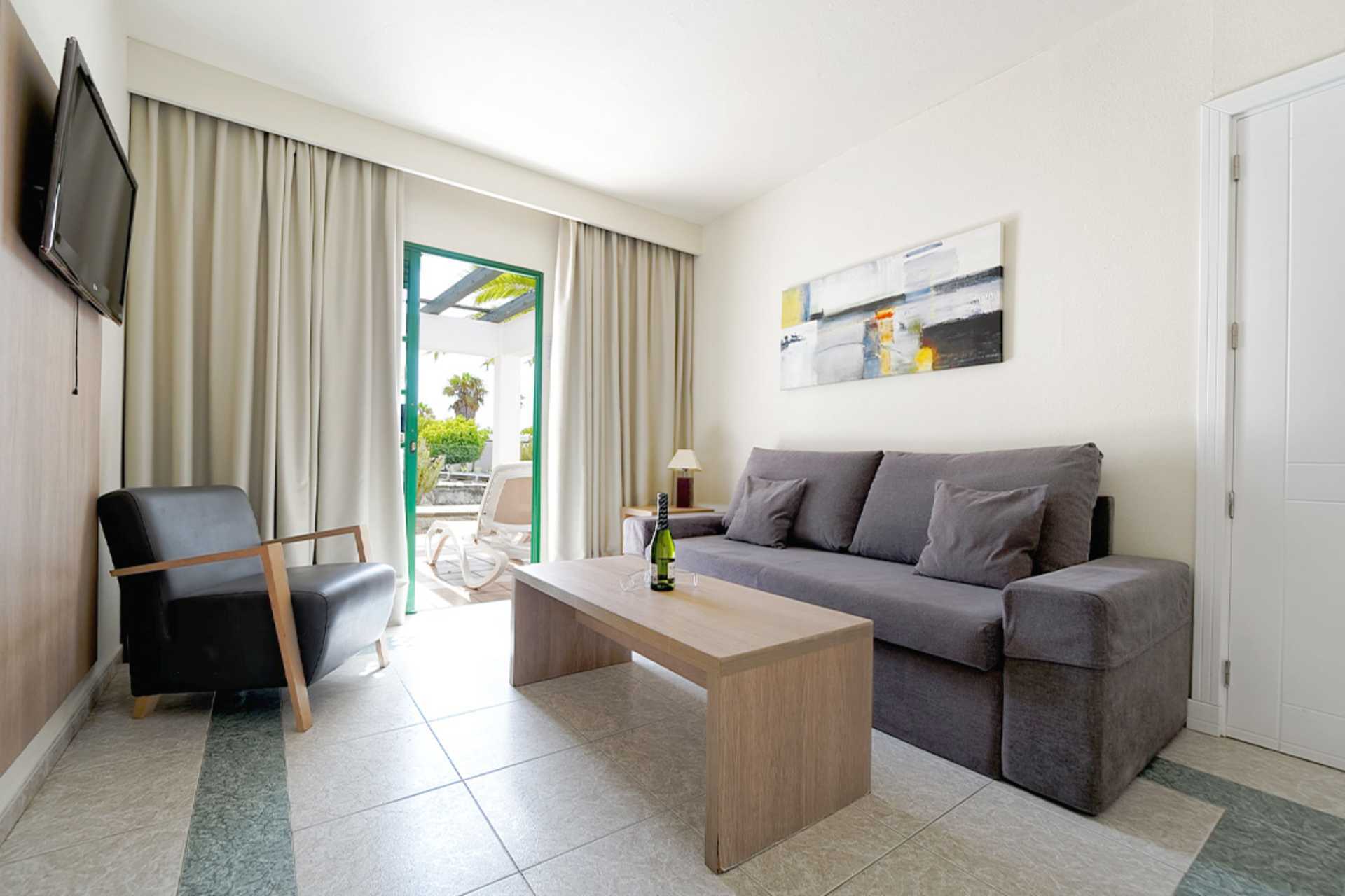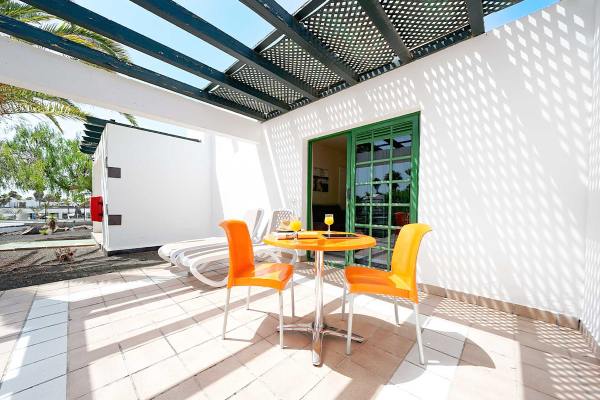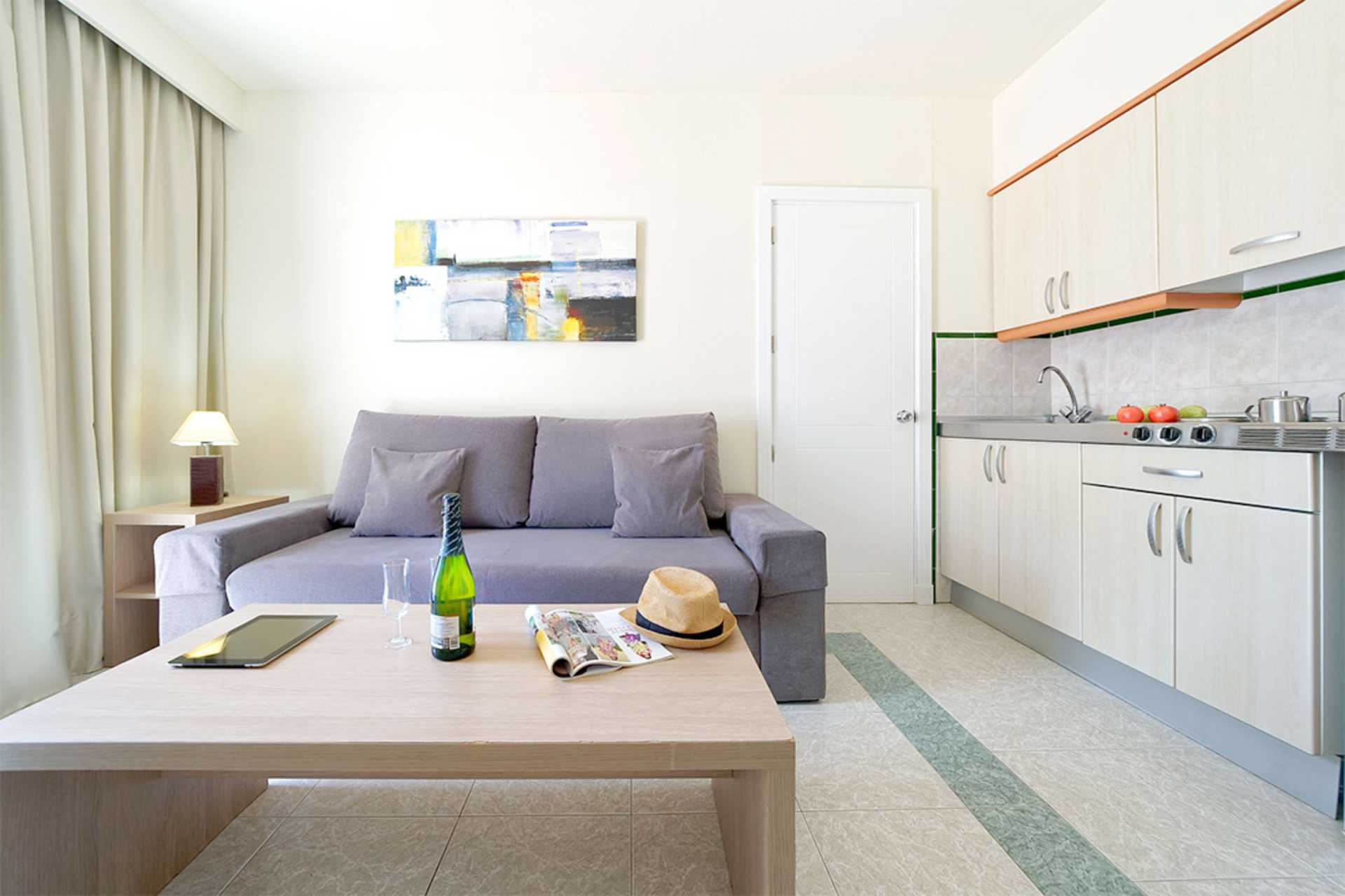 Toromsleilighet i bungalow med markterrasse. Et soverom og stue med minikjøkken. To enkeltsenger. Mulig med en ekstraseng i sovesofa. Minikjøkken med kjøleskap, kokeplater, mikrobølgeovn, kaffetrakter, vannkoker og enkelt kjøkkenutstyr. Wifi inkludert. Luftkondisjonering og safe mot avgift. TV. Hårføner. Dusj og wc. Rengjøring 3 ggr/uke. Barn under 2 år regnes inn i maksantallet i leiligheten.