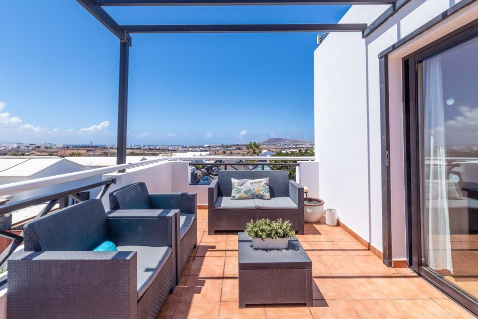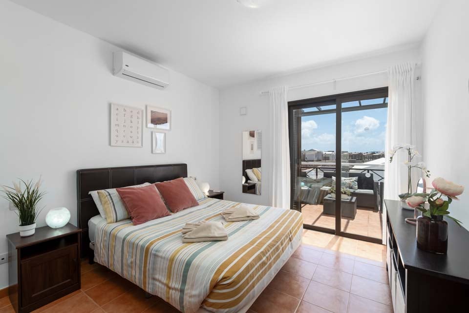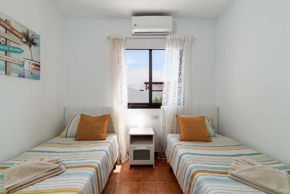 Den har tre soverom; ett enkeltrom, ett tomannsrom (begge i første etasje), og når du går opp trappen, finner du hovedsoverommet som fører ut til en nydelig, romslig terrasse med moderne sitteplasser – det perfekte stedet å se solen gå ned. Dette soverommet har også en king-size-seng og et eget bad.