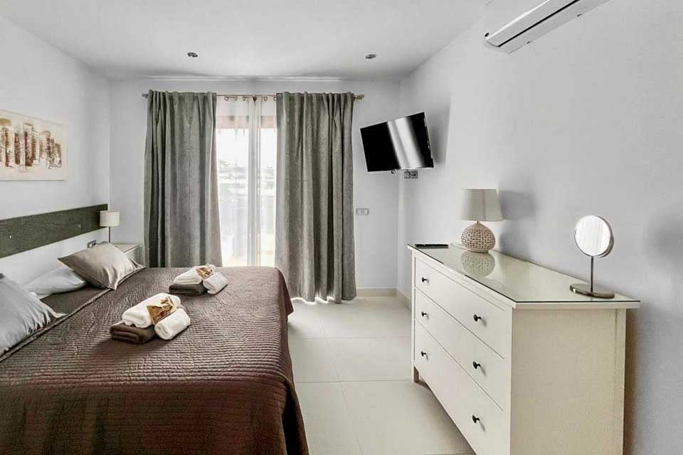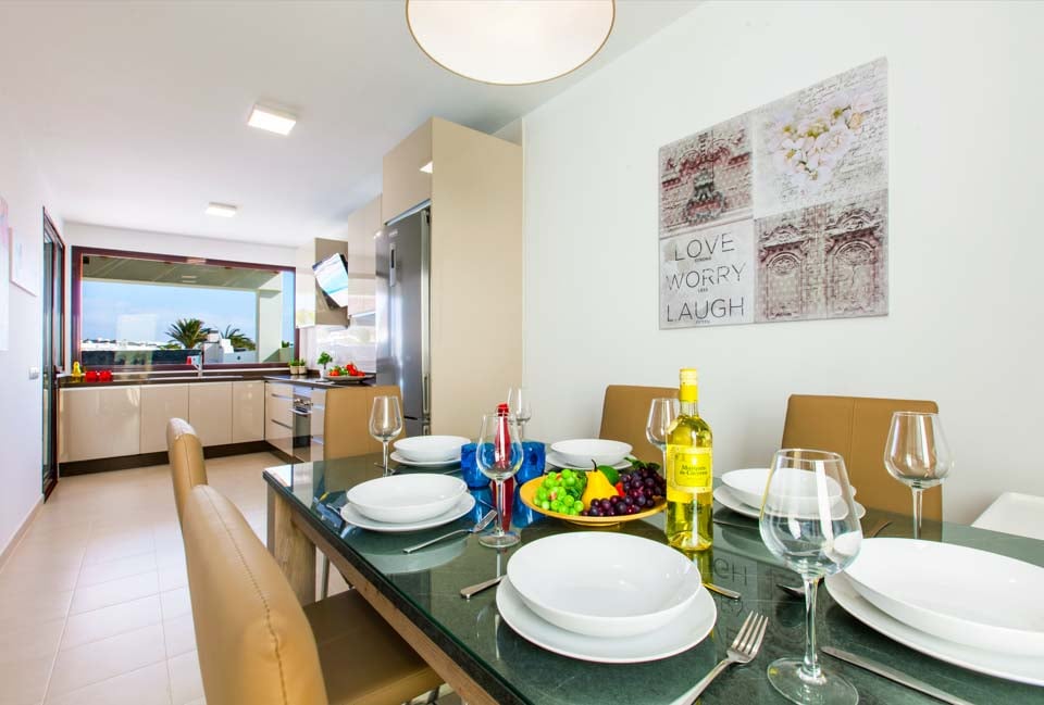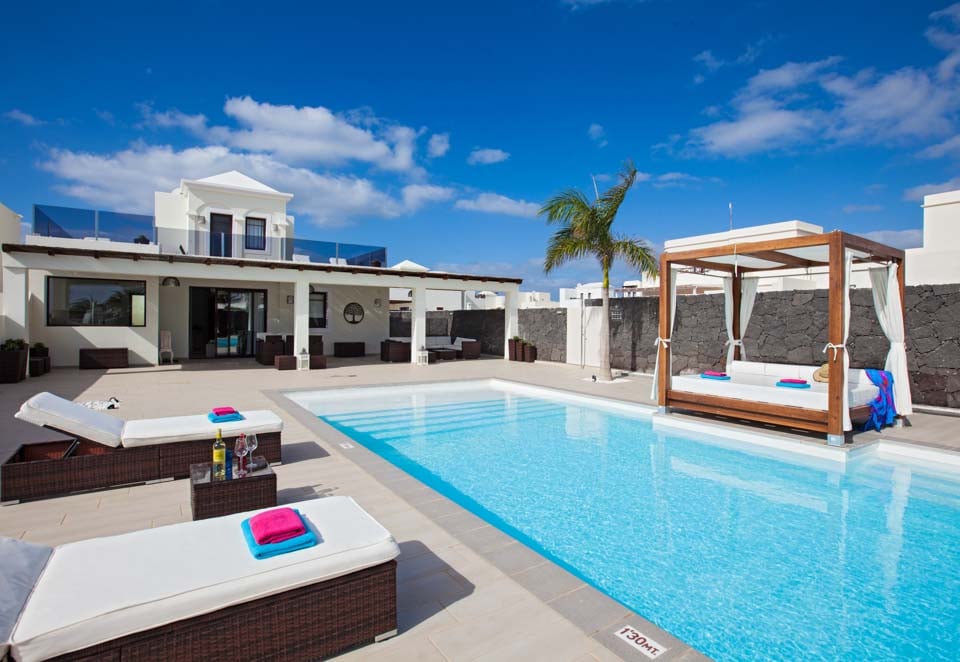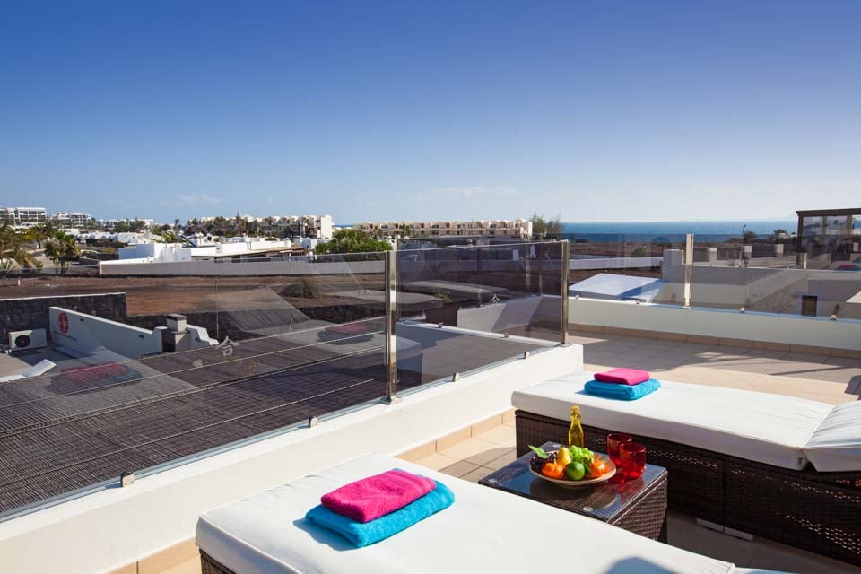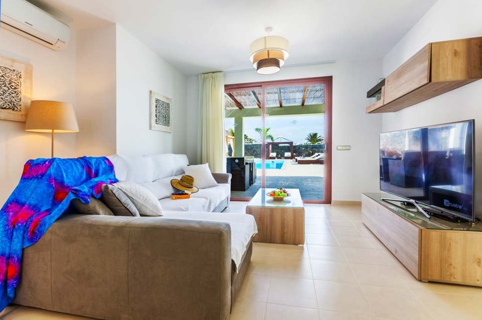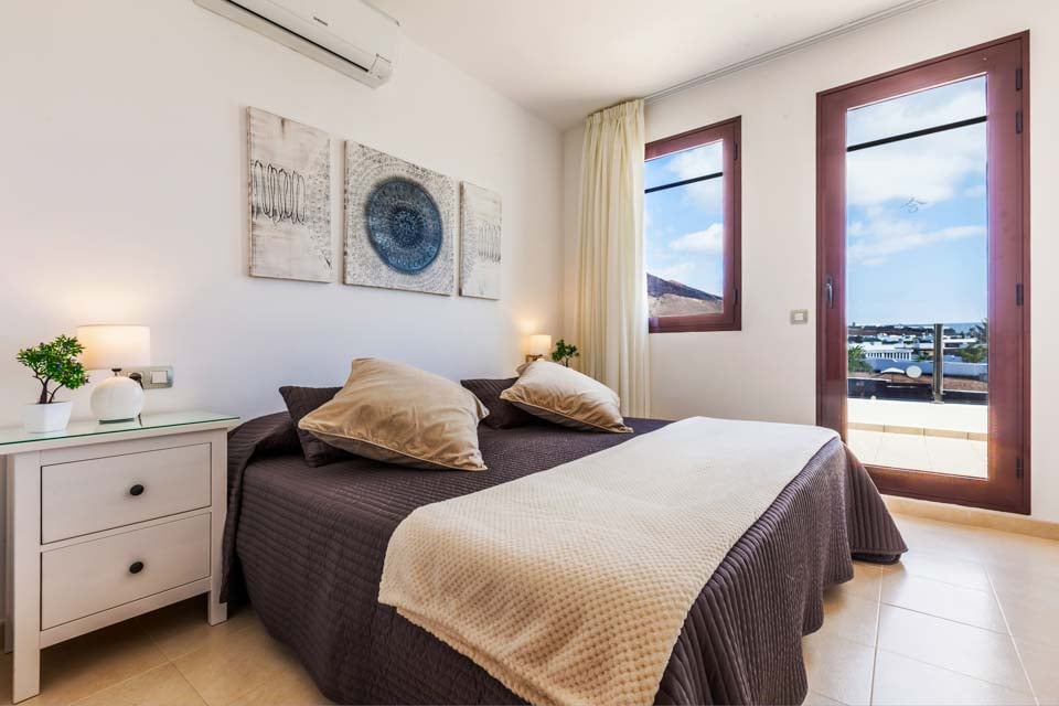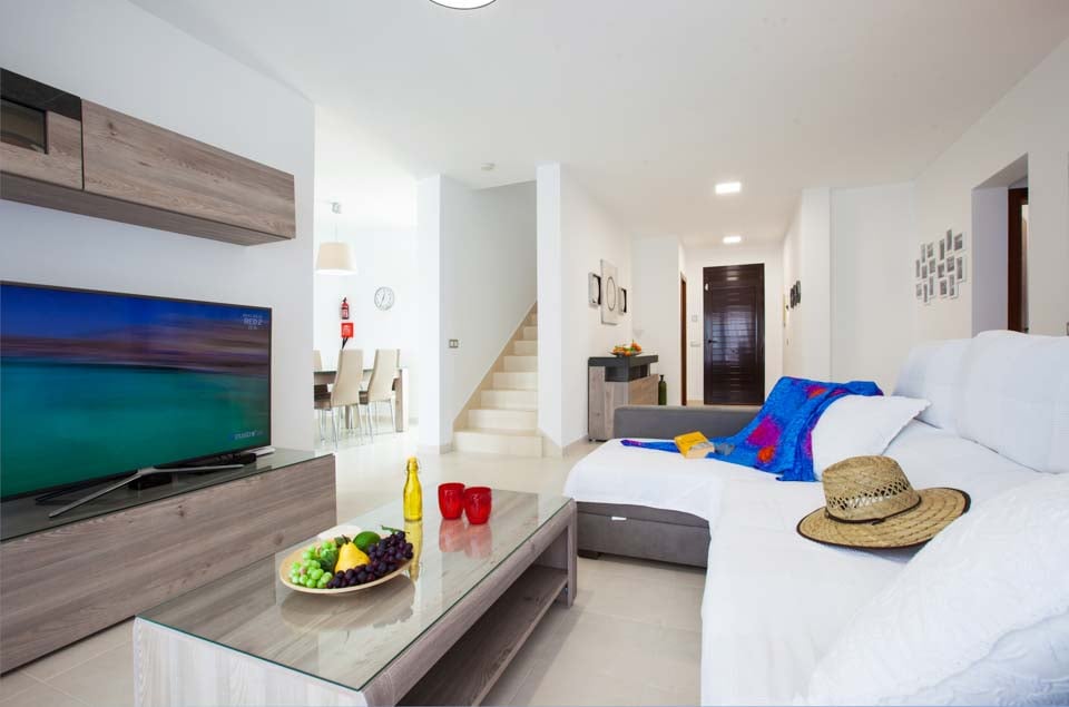 I første etasje finner du en moderne og komfortabel stue med flere britiske kanaler, spillkonsoll og spiseplass for seks personer, som fører til et moderne og fullt utstyrt kjøkken. To soverom ligger i denne etasjen, samt et familiedusjrom. Trapper fører opp til første etasje hvor du har to hovedsoverom, ett med eget bad og ett med separat toalett. Soverommene har tilgang til den romslige terrassen med fantastisk havutsikt mot naboøya Fuerteventura. Stuen og alle soverommene har klimaanlegg for din bekvemmelighet.