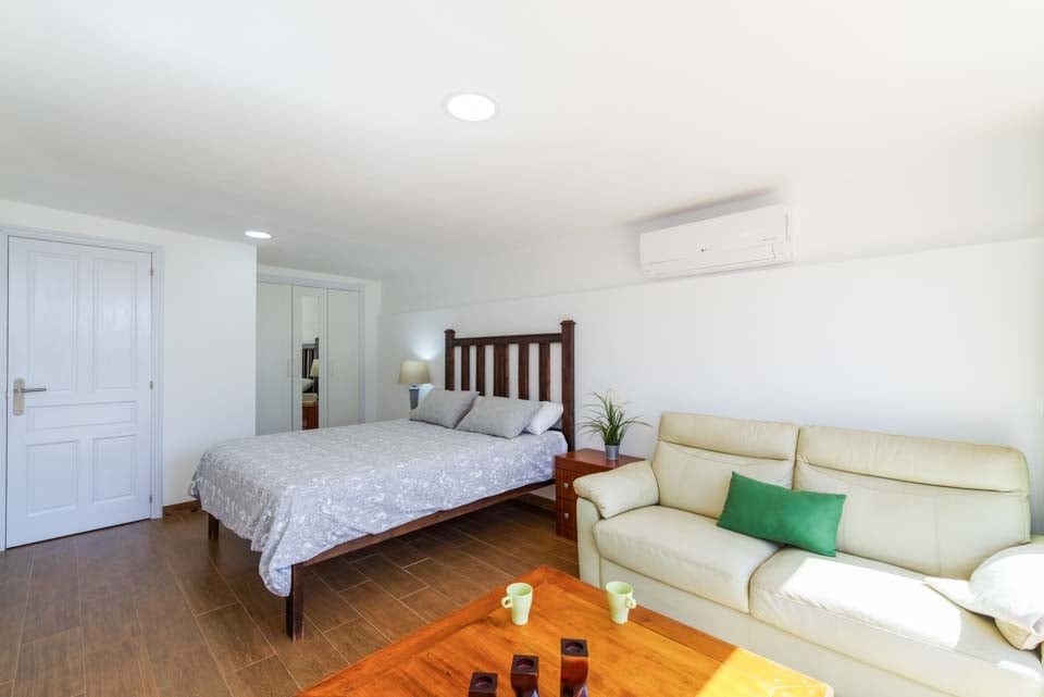 Dobbel, dobbeltseng, sofa, flatskjerm-TV, klimaanlegg, dører til terrasse