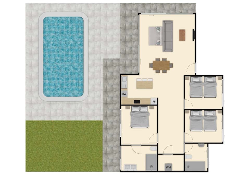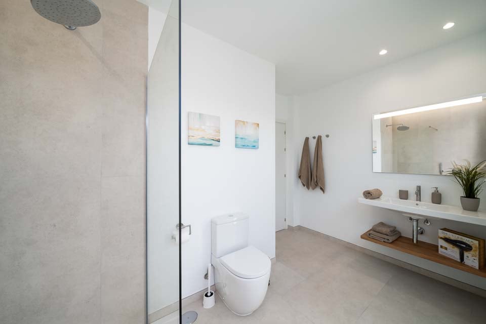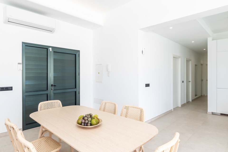 For å komme til villaen er det en sti som er 88 cm bred. Inngangsdøren har en bredde på 80 cm, mens døren til terrassen er 200 cm bred. Terrassen er åpen, flat og flislagt med en liten kant over terrassedørkarmene. Det er også et lite kunstgressområde. Selve bassenget har trinntilgang. Dette er en eiendom i første etasje. Alle soverommene har en dørbredde på 80 cm, mens alle badene har en dørbredde på 85 cm. Døren inn til kjøkken/spisestue er 200 cm bred, og døren inn til stuen er også 200 cm bred. *Vær oppmerksom på at selv om vi har gjort vårt ytterste for å sikre at informasjonen som gis er nøyaktig, kan det forekomme feil. Hvis du trenger mer spesifikk informasjon om villaen, ikke nøl med å kontakte oss.