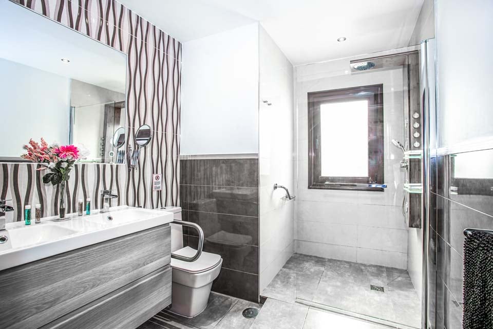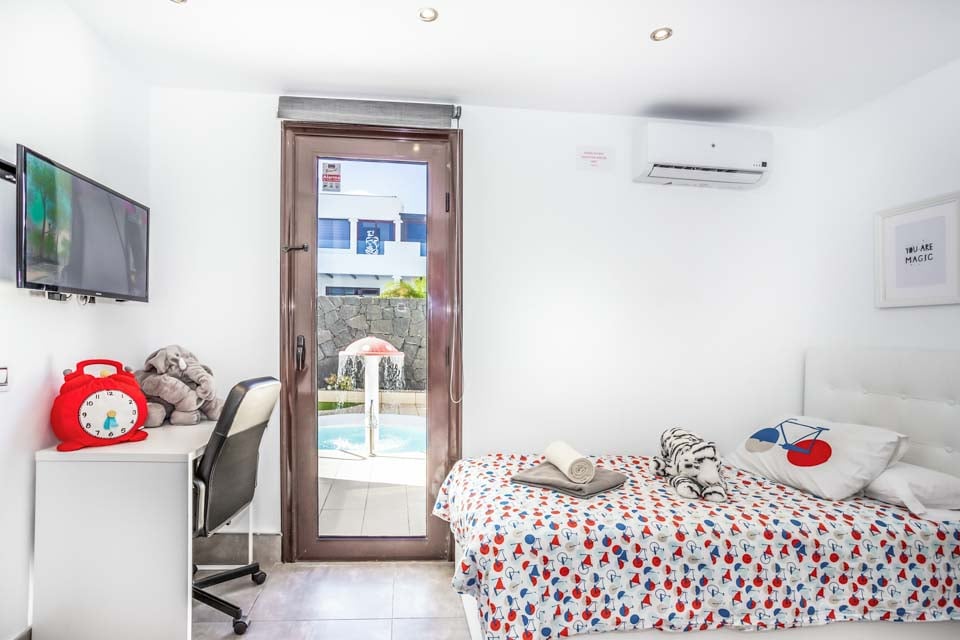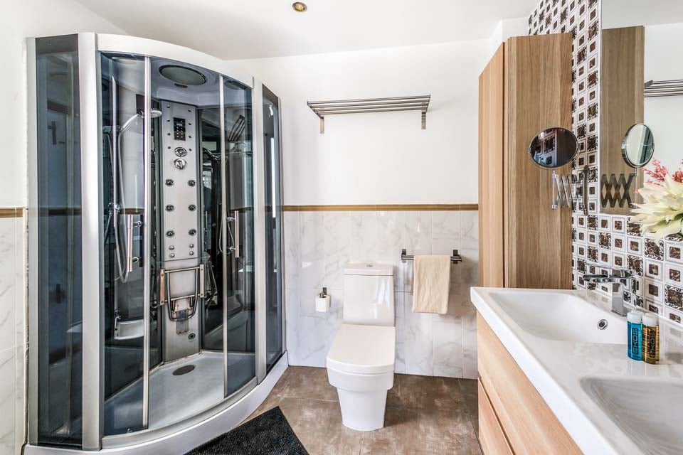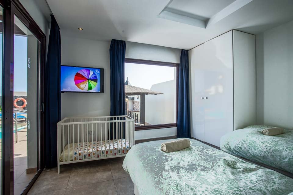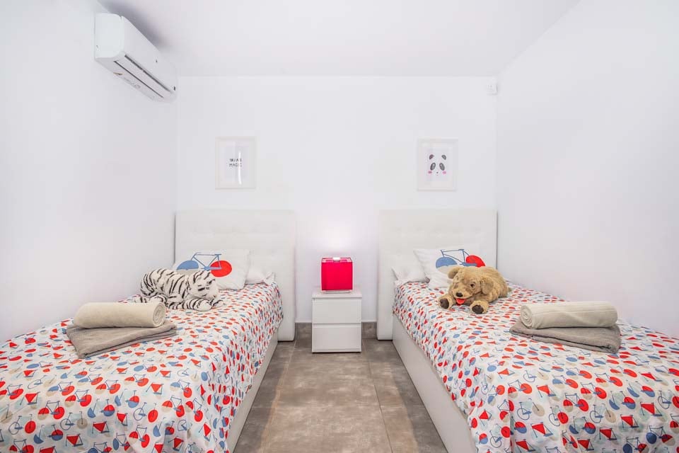 De 5 soverommene, fordelt over to etasjer, er nøye gjennomtenkt og tilpasset publikummet. Barnas soverom med TV og 2 enkeltsenger ligger i første etasje og fører direkte til lekeområdet ved barnebassenget. I samme etasje er det også et pent dobbeltrom med himmelseng, en stor flatskjerm-TV og et innbydende bad med hydromassasjedusj. For å komplettere soverommene i første etasje er det et romslig tomannsrom med moderne møbler, flatskjerm-TV og dobbel garderobe. Det er også et separat dusjrom i denne etasjen for din bekvemmelighet.