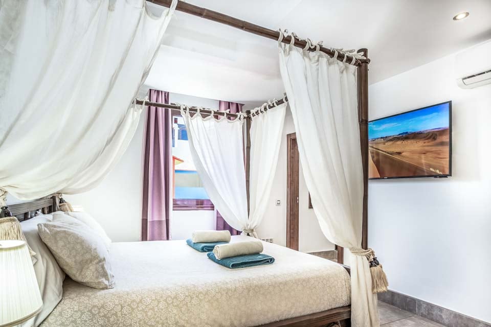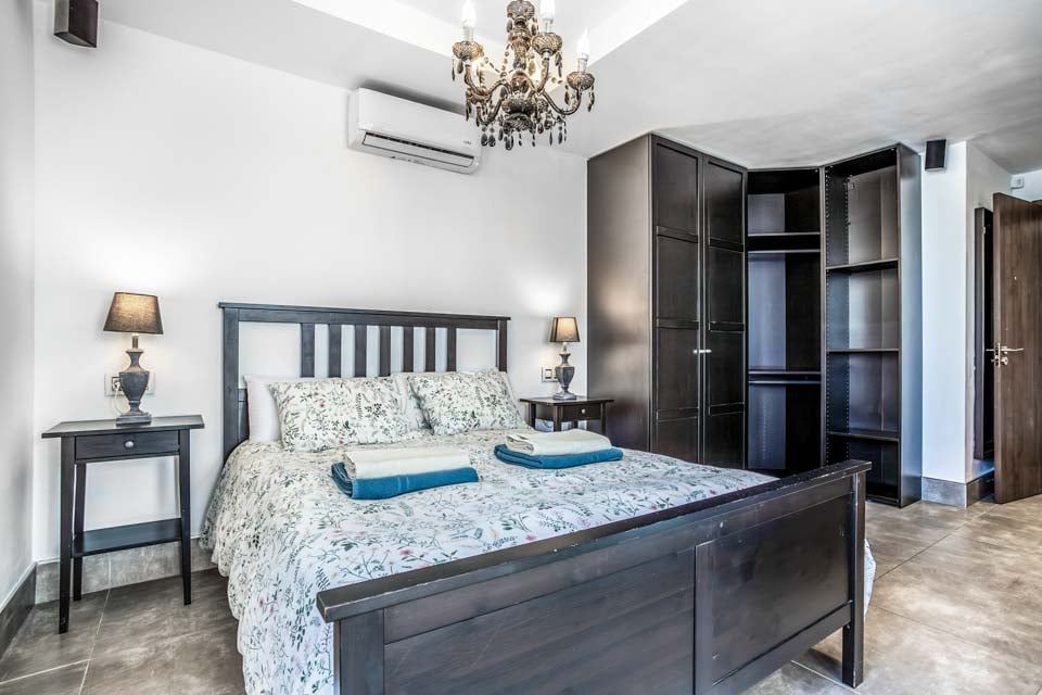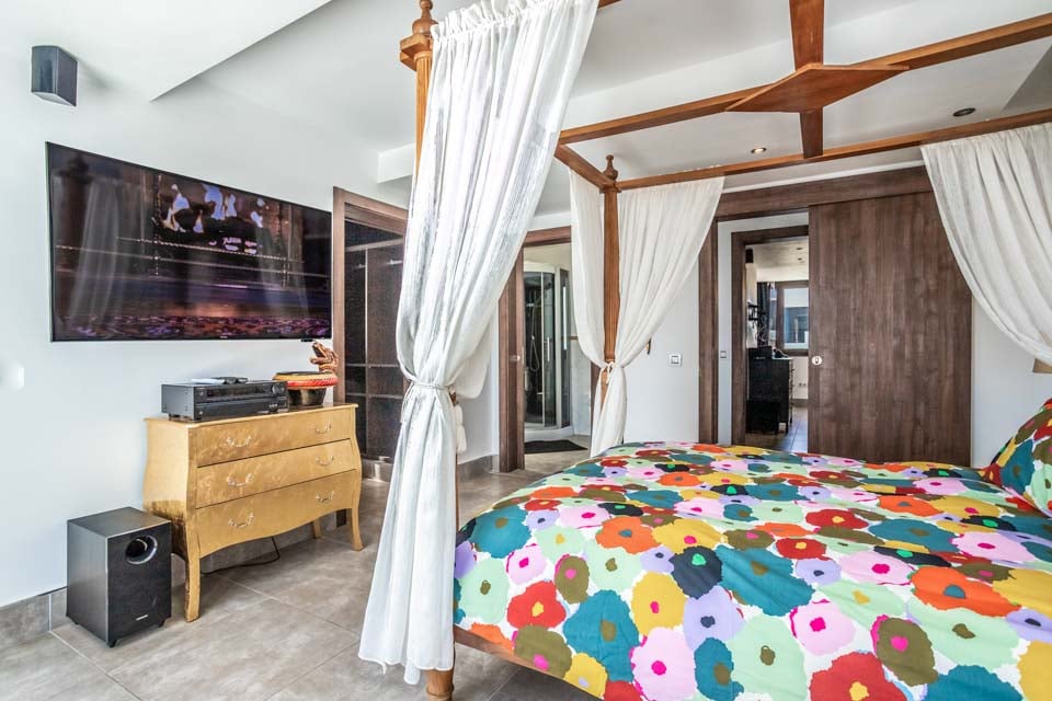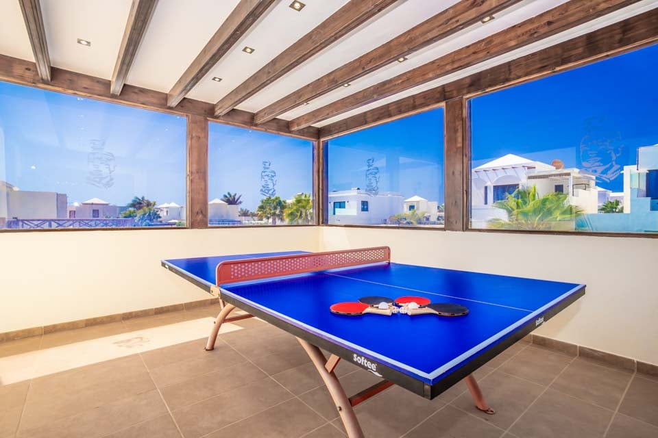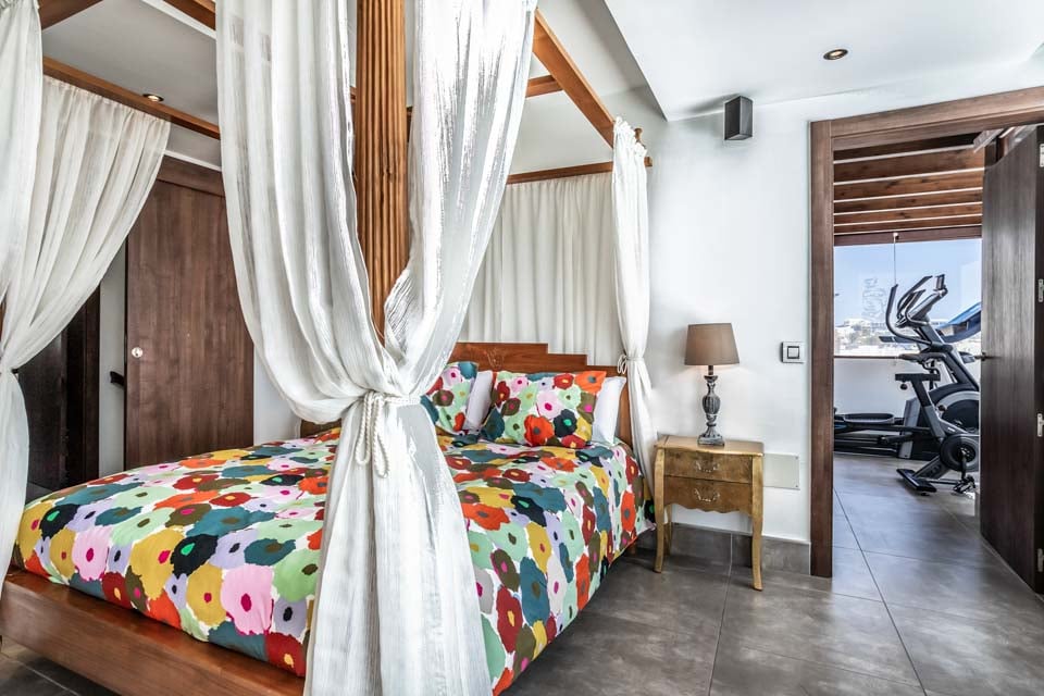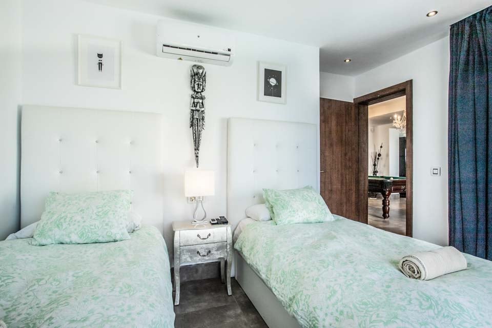 Ovenpå fullfører to imponerende rom med eget bad og skjulte ekstrafasiliteter bildet. Her oppe finner du det andre soverommet med himmelseng, som har en forfriskende hydromassasjedusj, en stor flatskjerm-TV og fører til ditt eget treningsstudio med fantastisk havutsikt, perfekt for å trene med stil. Hovedsoverommet har et badekar, ideelt for avslapning. Hvert rom har utgang til en imponerende terrasse, og i dette området finner du også darttavle og bordtennisbord. Ingen stein har blitt latt uvendt i denne vakre villaen. Som en ekstra bonus får du gratis bassenghåndklær under hele oppholdet i villaen.