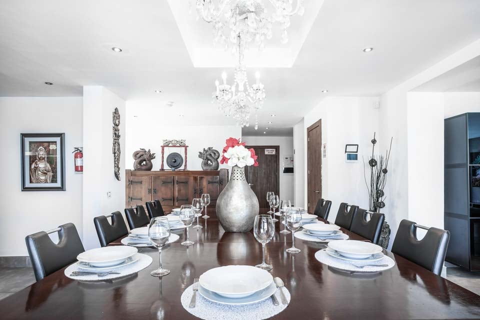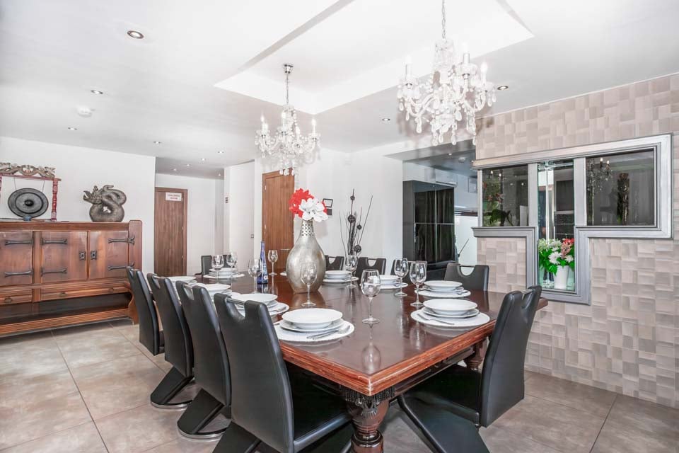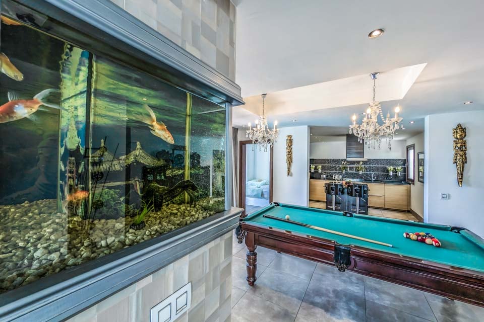 Når du kommer inn, vil du bli slått av det lysende interiøret takket være det moderne designet med panoramavinduer, som også gir deg en fantastisk utsikt over bassenget om kvelden fra salongen. Dette ultramoderne oppholdsrommet tilbyr deg en imponerende hjemmekino og en superkomfortabel U-formet skinnsofa som vil lokke deg til å strekke deg ut og slappe av. Spisestuen huser et vakkert tropisk akvarium sammen med et romslig spisebord som imponerende nok kan gjøres om til et biljardbord!