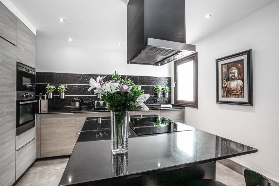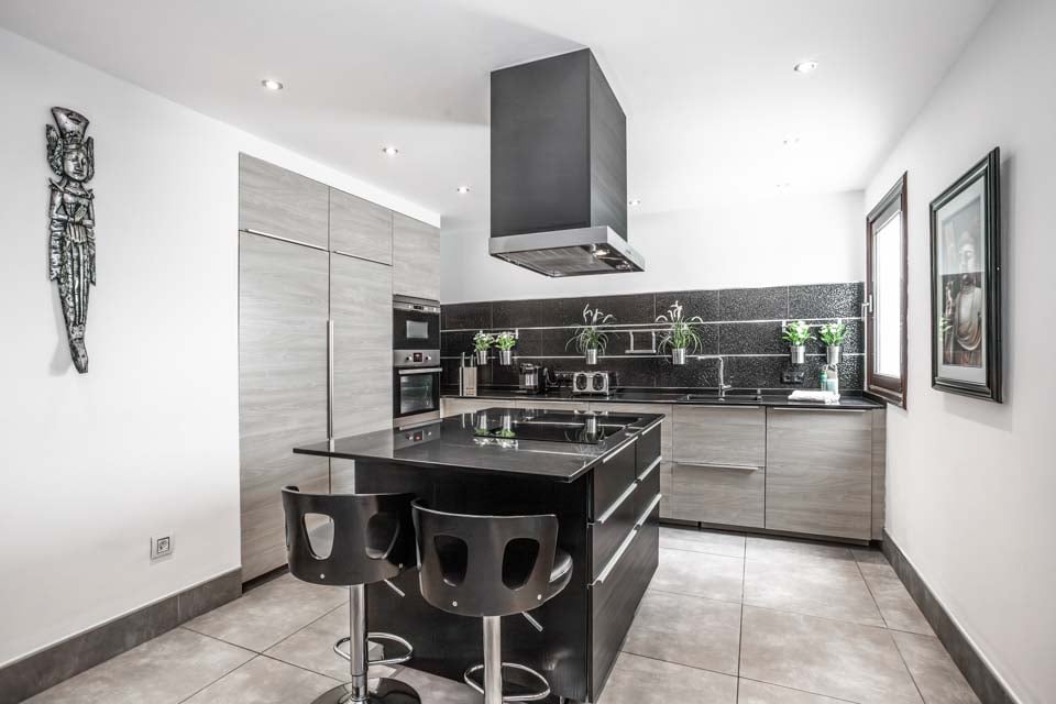 Det stilige kjøkkenet er superutstyrt og pent designet med hvitevarer av topp kvalitet, og det har også en moderne kjøkkenøy hvor du både kan lage mat og spise med en knappeplate i midten og sitteplasser rundt den.