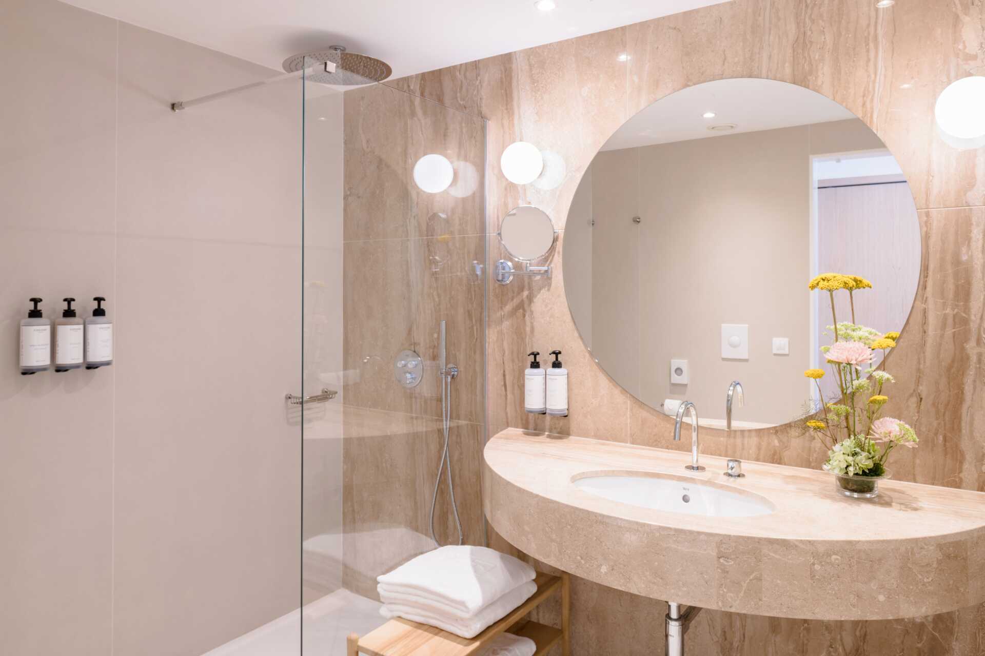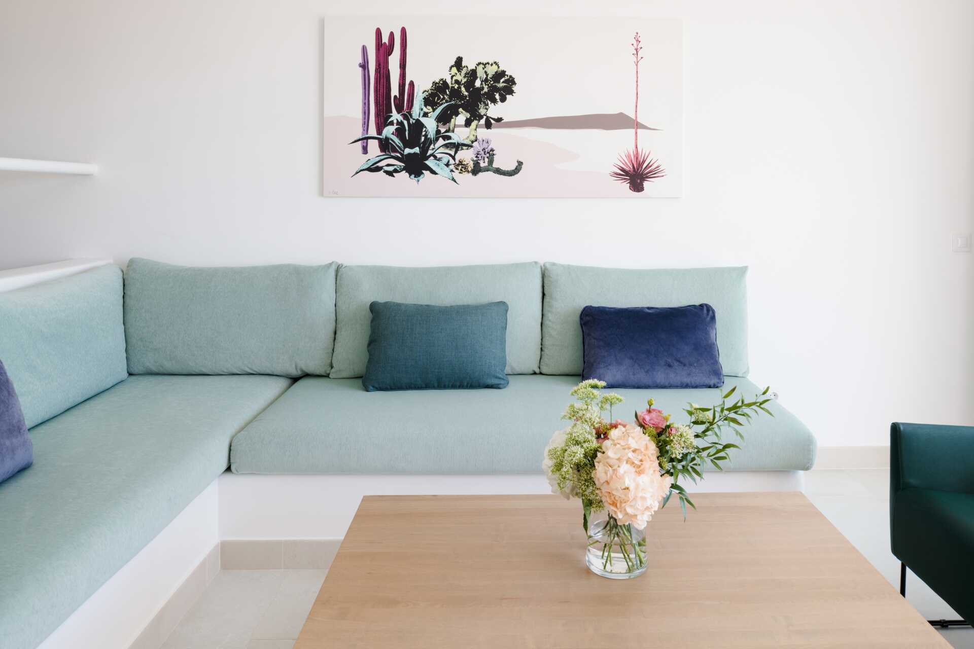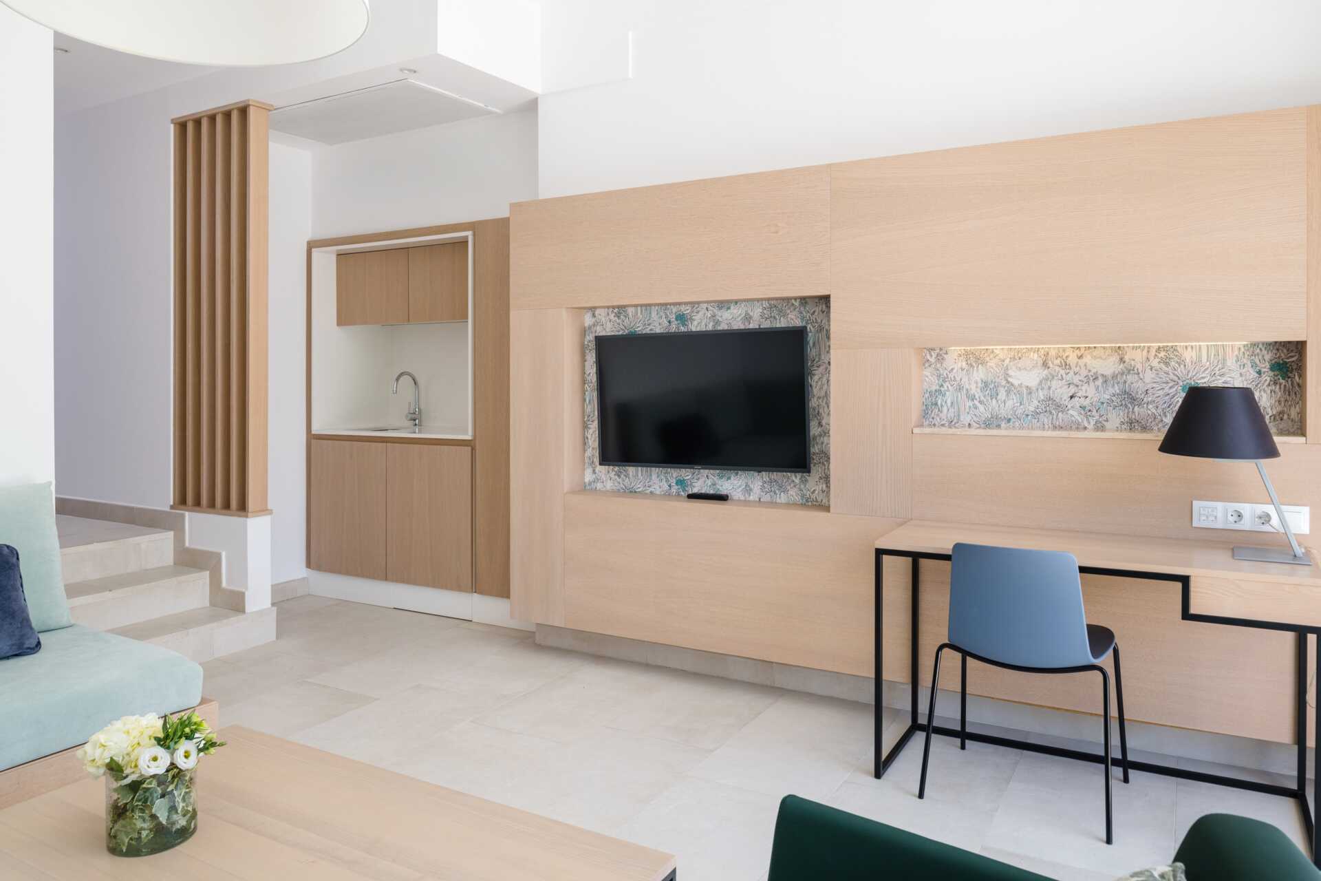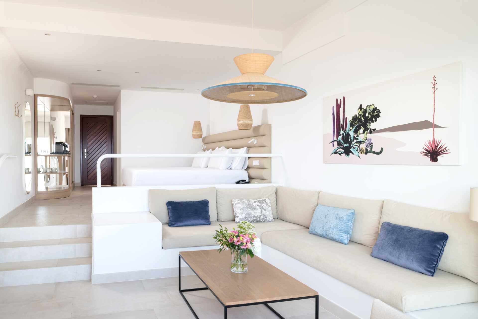 Suite med balkong eller terrasse. Soverom kombinert med stue atskilt med noen få trappetrinn. En dobbeltseng eller to enkeltsenger. Mulig med en ekstraseng i sovesofa. Kjøleskap, vannkoker og mikrobølgeovn. Wifi, luftkondisjonering og safe inkludert. TV. Badekåper og tøfler Hårføner. Dusj og wc. Rengjøring 7 ggr/uke.