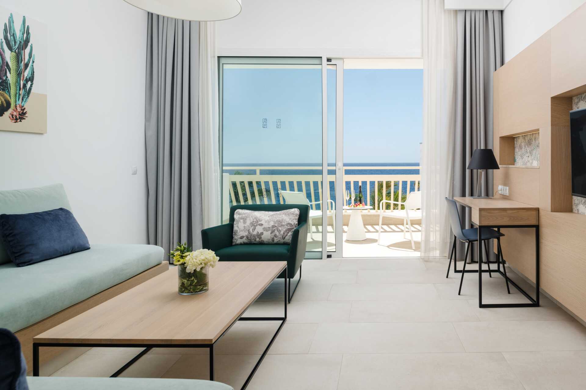 Suite med balkong og havutsikt. Suiten ligger i hotellets øverste etasje, 4. eller 5. etasje. Suiten består av et kombinert soverom og en stue, adskilt av noen få trinn. En dobbeltseng eller to enkeltsenger. Mulig med en ekstraseng i sovesofa. Kjøleskap, vannkoker og mikrobølgeovn. Wifi, luftkondisjonering og safe inkludert. TV. Badekåper og tøfler Hårføner. Dusj og wc. Rengjøring 7 ggr/uke.